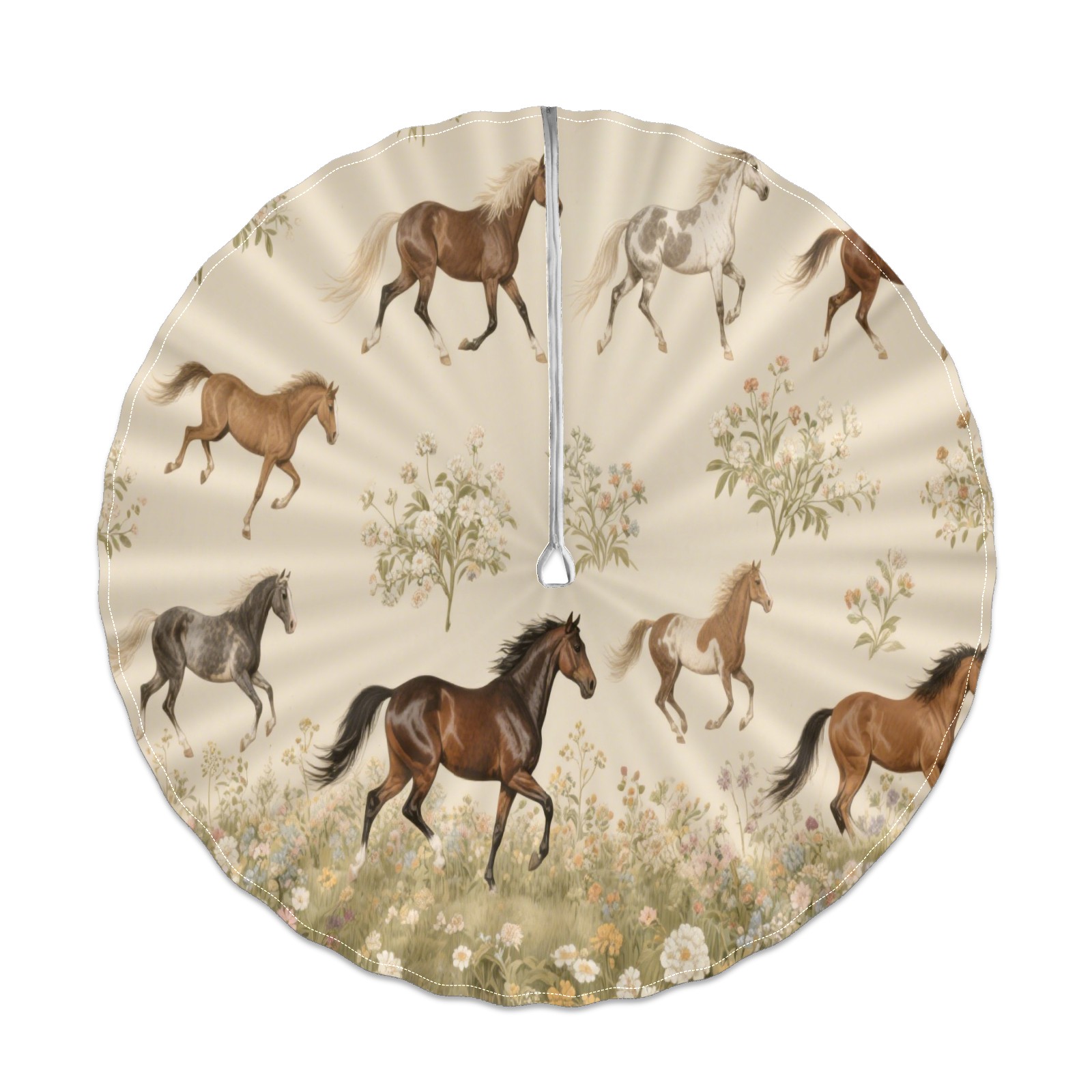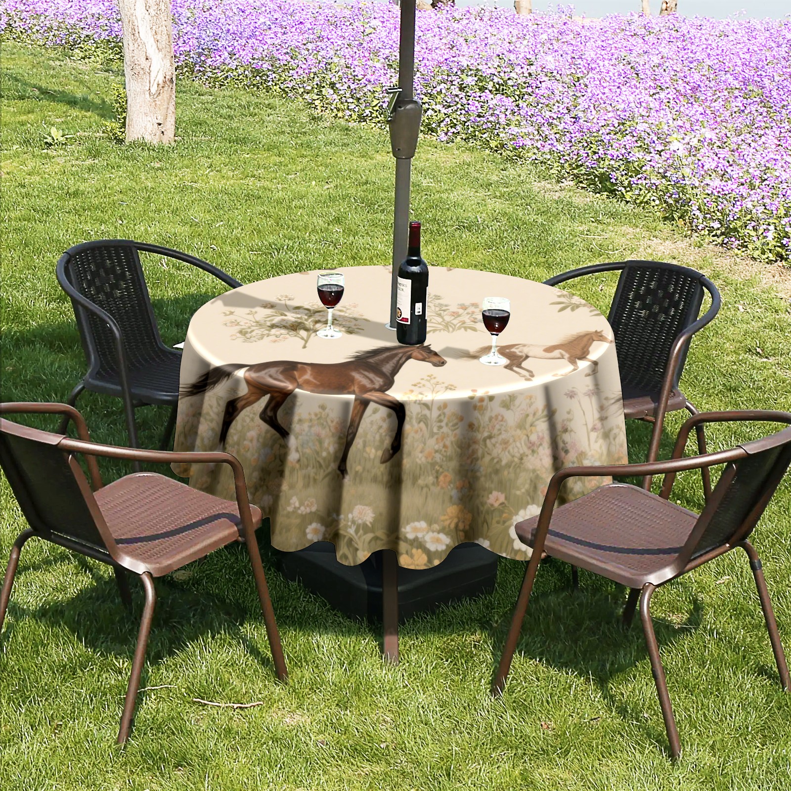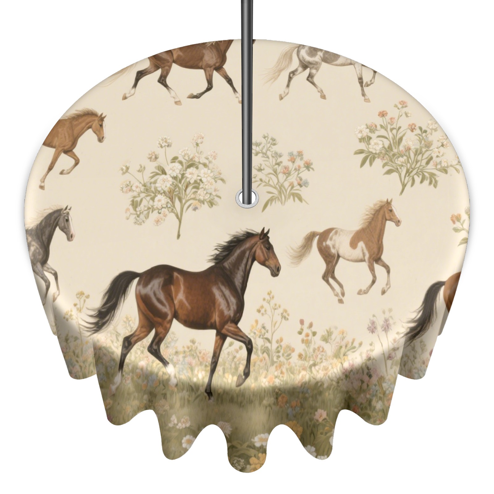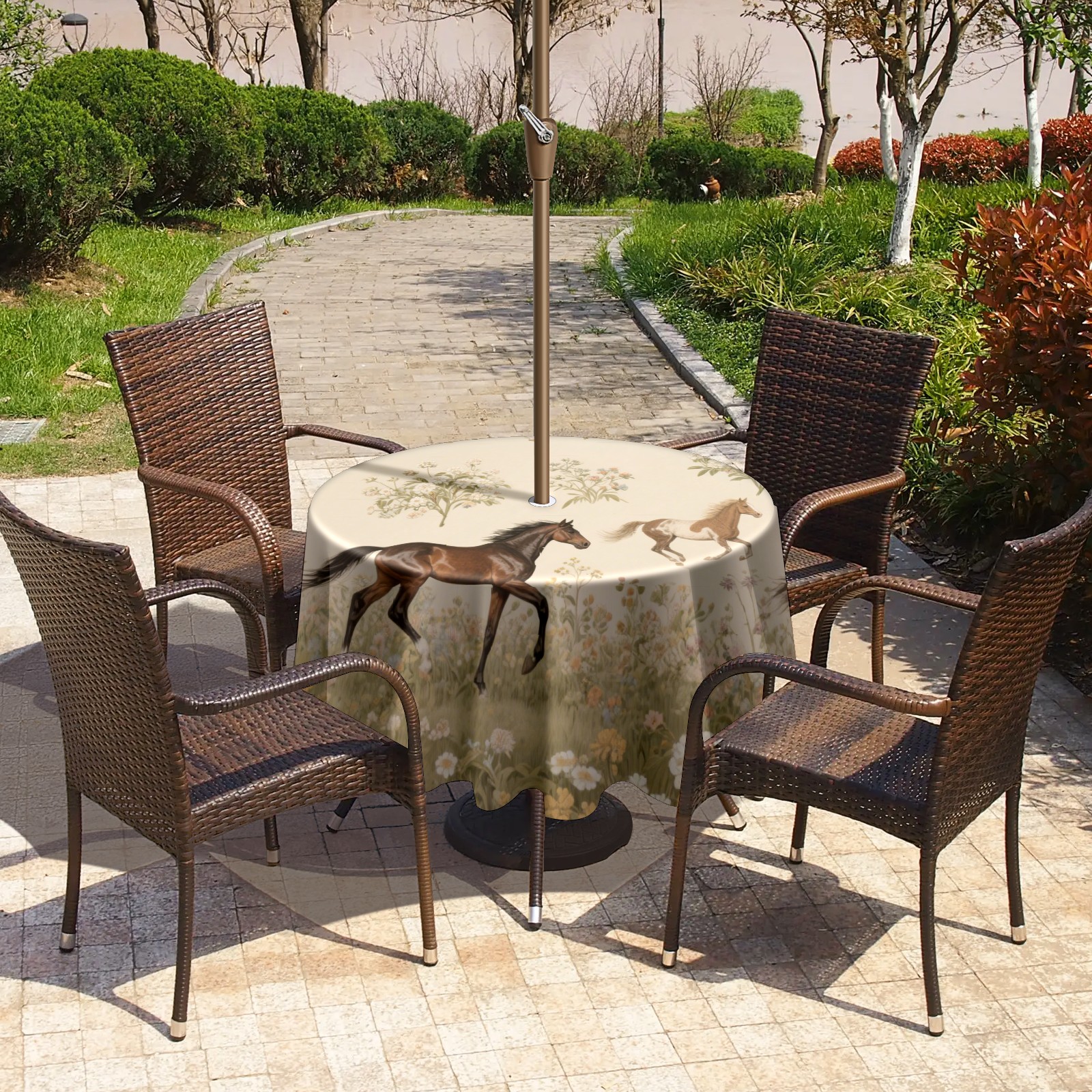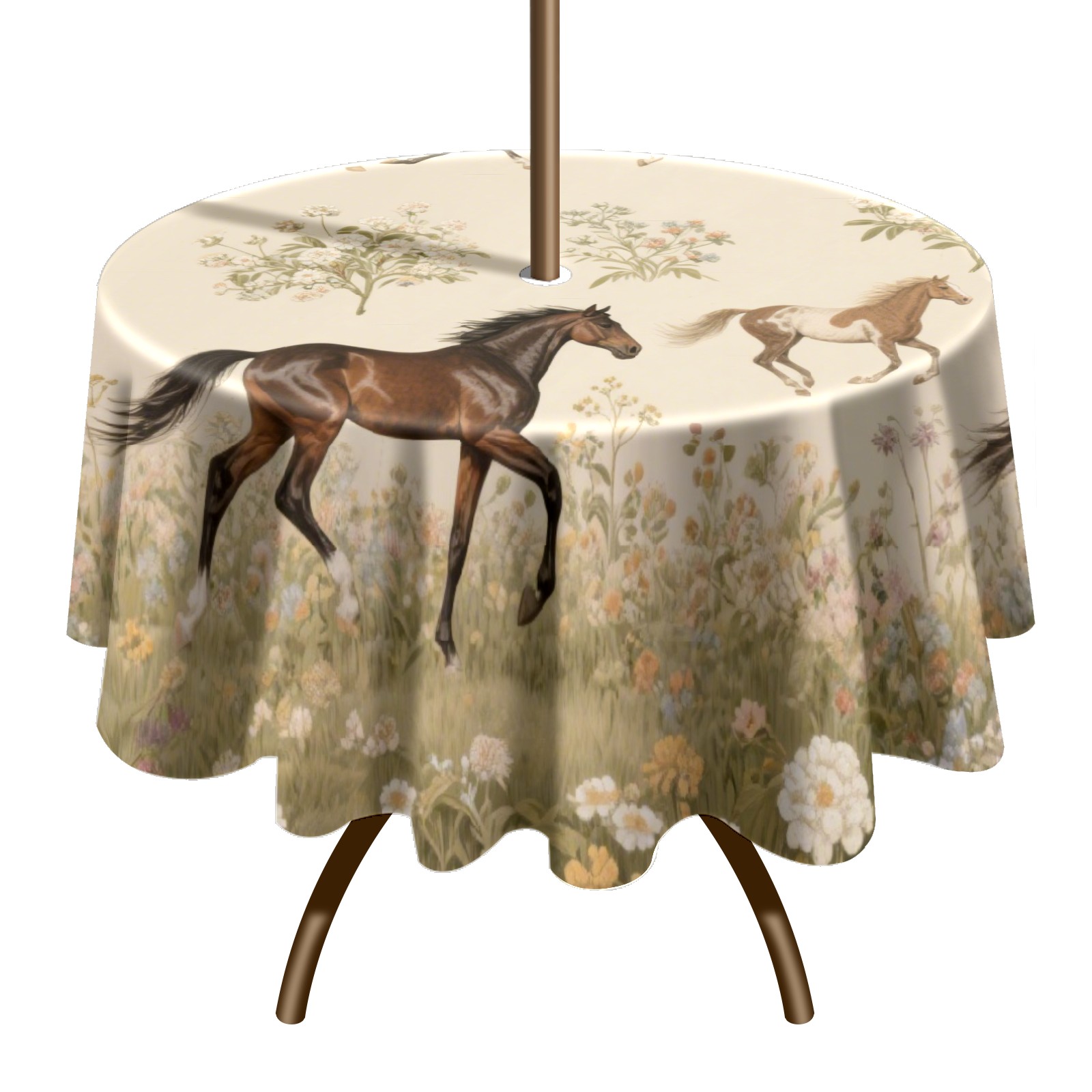 Round Tablecloth with Adjustable Zippered Umbrella Hole Polyester Table Cover Easy Install for Patio, Restaurant & Outdoor Dining Horses (60in)