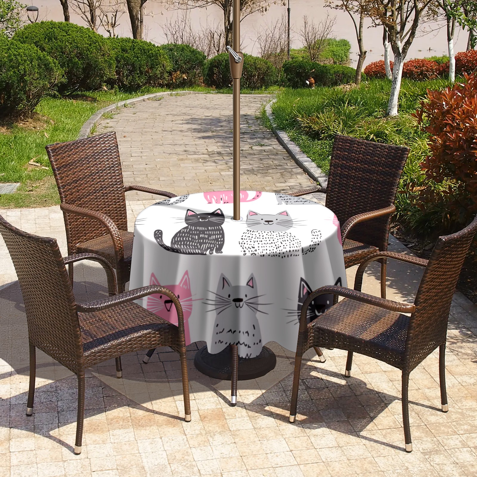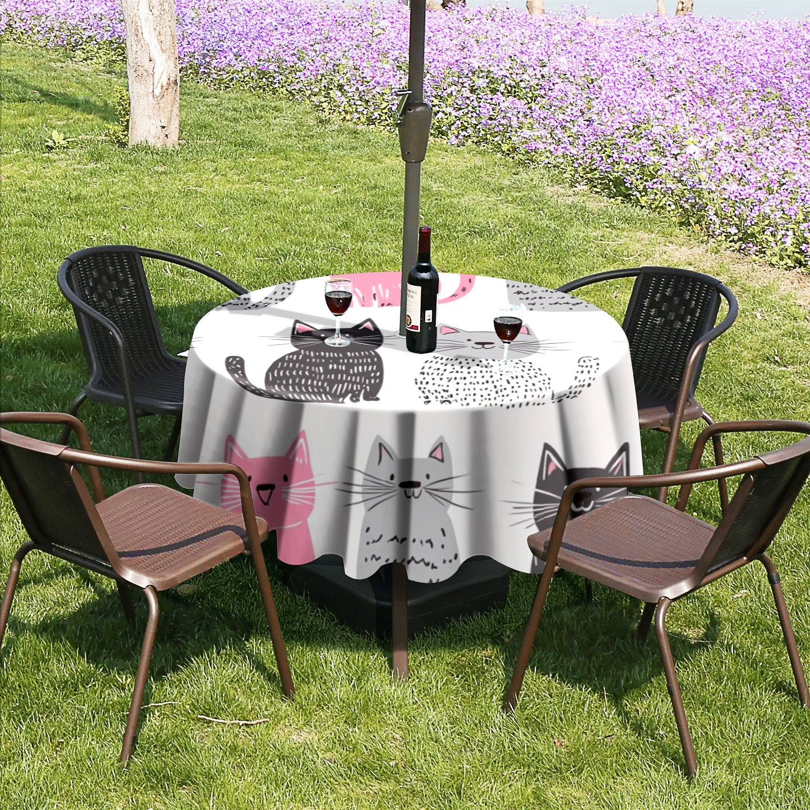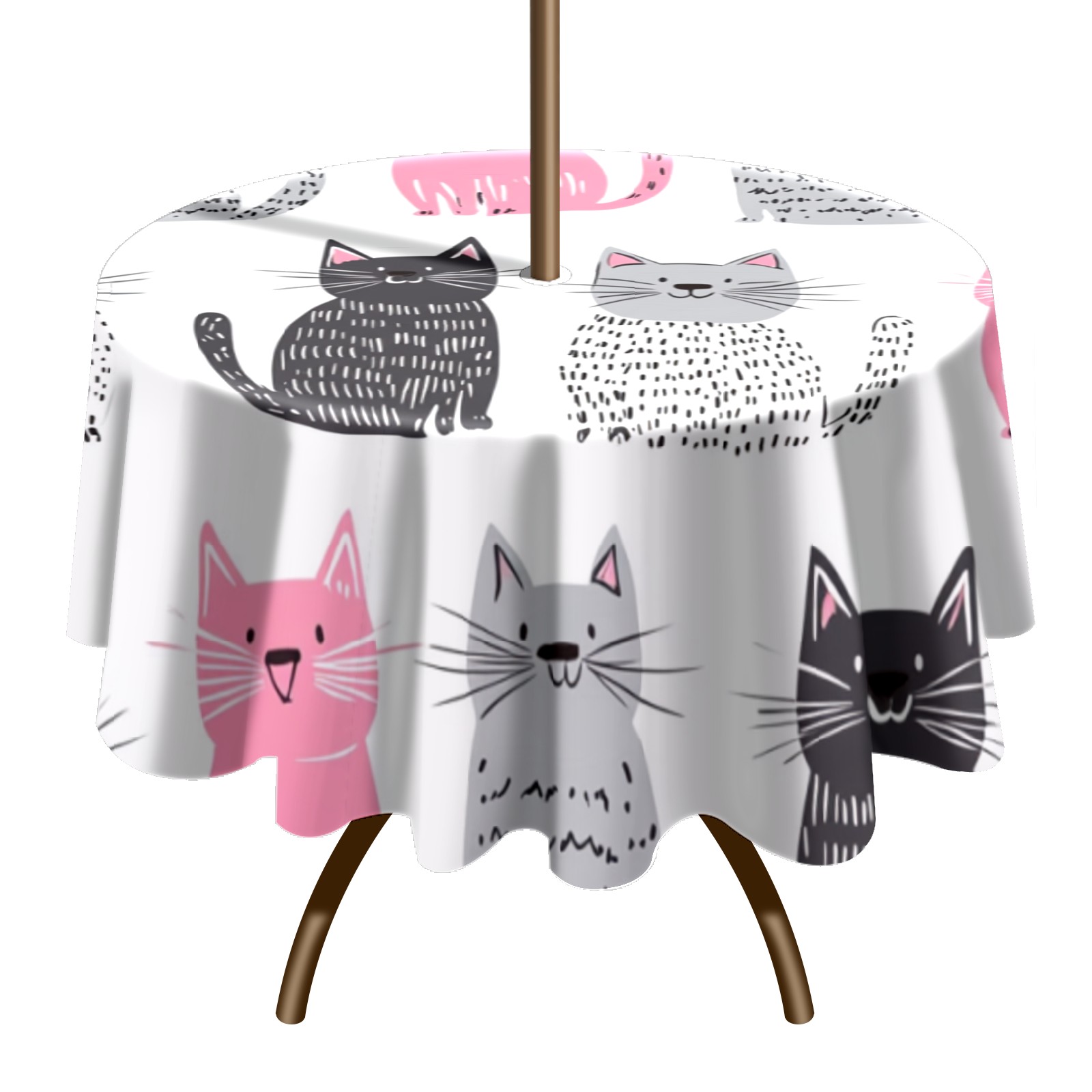 Round Tablecloth with Adjustable Zippered Umbrella Hole Polyester Table Cover Easy Install for Patio, Restaurant & Outdoor Dining Cat Face Pattern (60in)