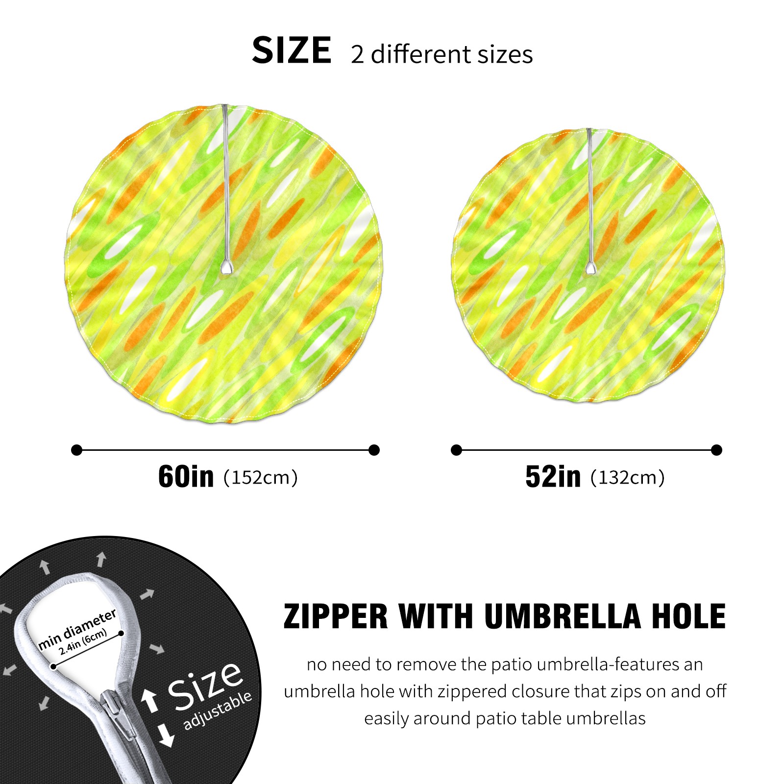 • <p>Constructed with heavy-duty polyester fabric, this tablecloth withstands outdoor wear while maintaining a clean appearance. The adjustable zipper hole accommodates umbrella poles of varying thickness, allowing installation without disassembling the umbrella stand.Ideal for backyard BBQs or cafe patios, this tablecloth elevates table presentation instantly. Available in two classic sizes, the precision circular cut ensures full table coverage. Machine washable in cold water without color fading or shape distortion. The lightweight fabric folds compactly for space-efficient storage between uses.</p>