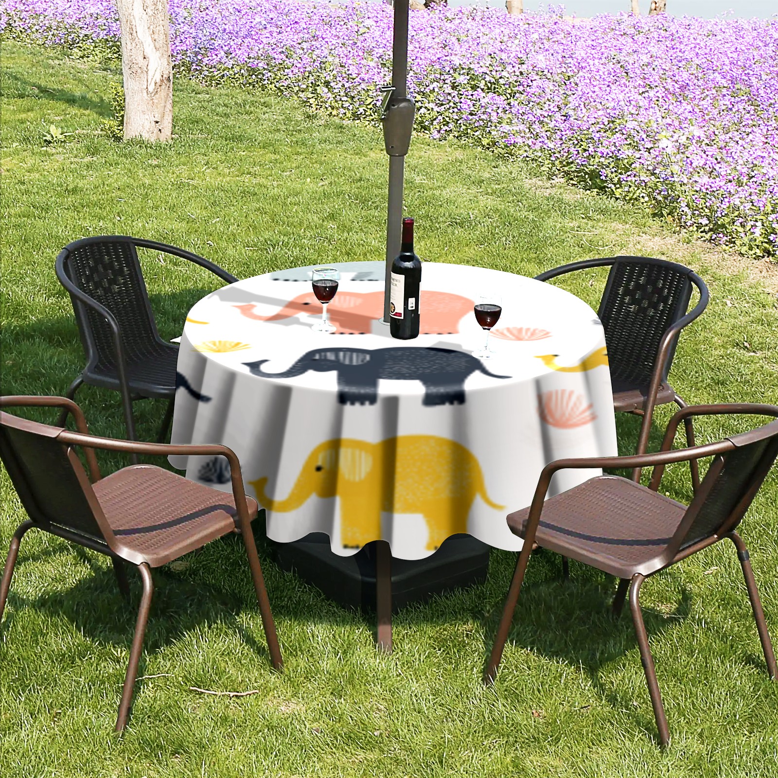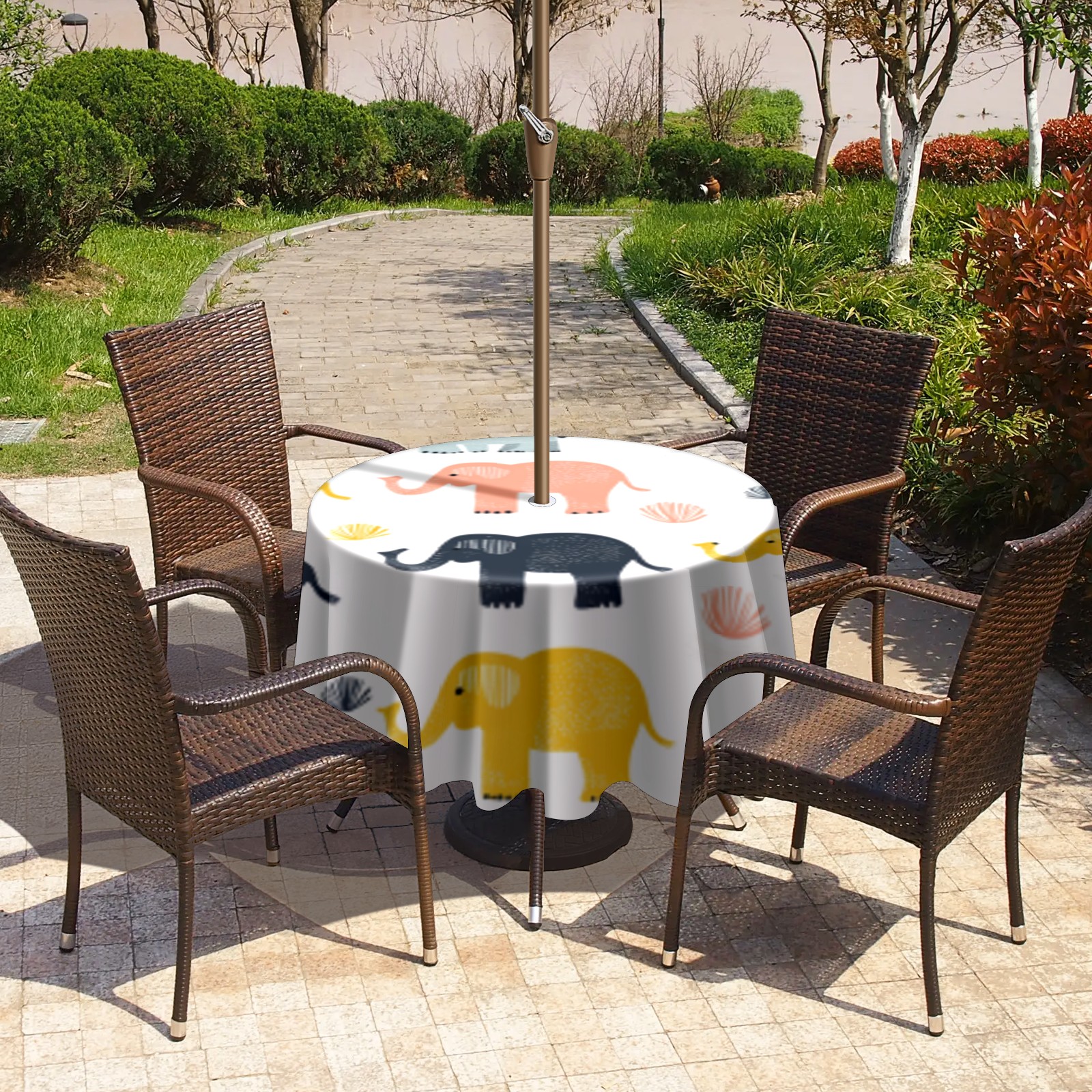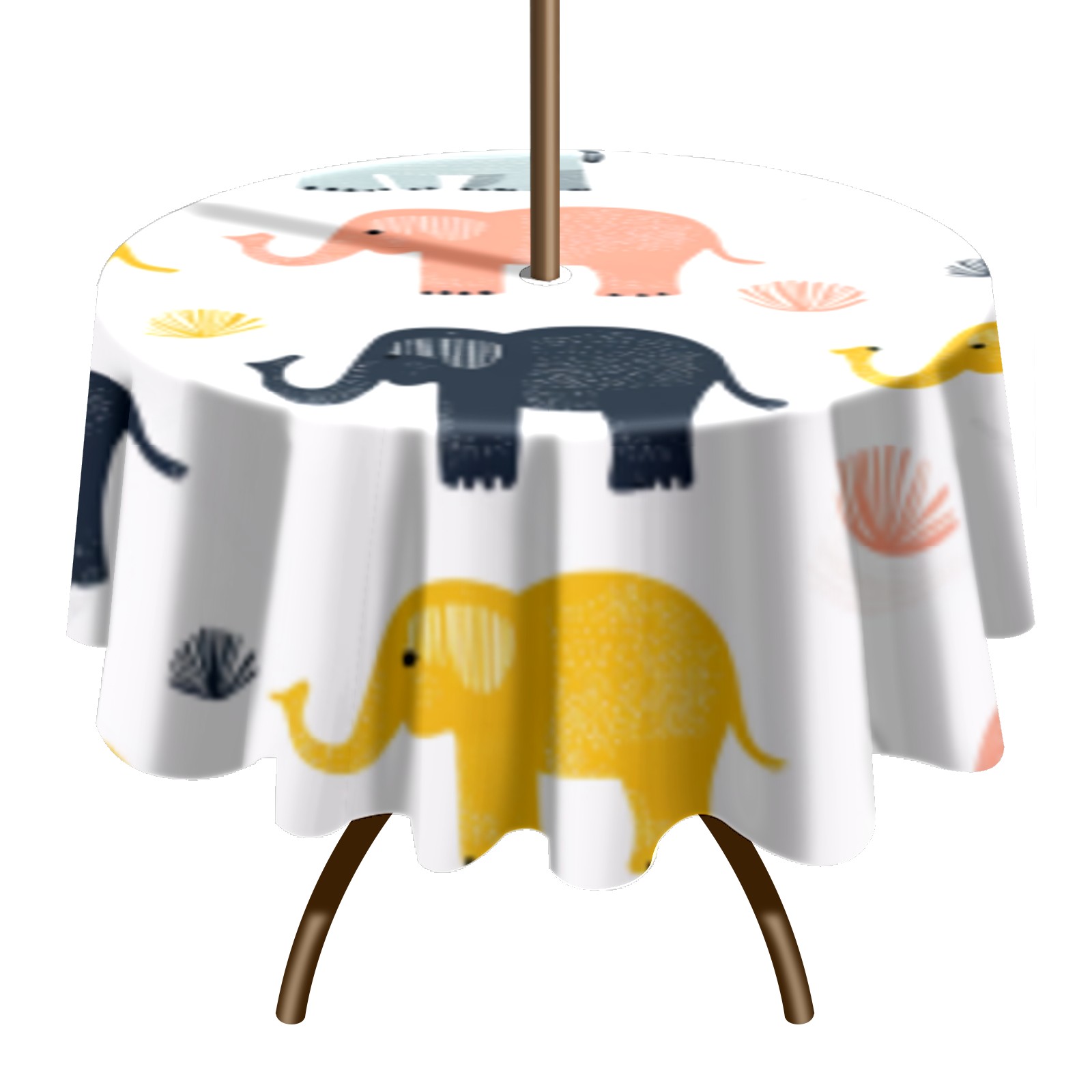 Round Tablecloth with Adjustable Zippered Umbrella Hole Polyester Table Cover Easy Install for Patio, Restaurant & Outdoor Dining Cute Elephant Pattern (60in)