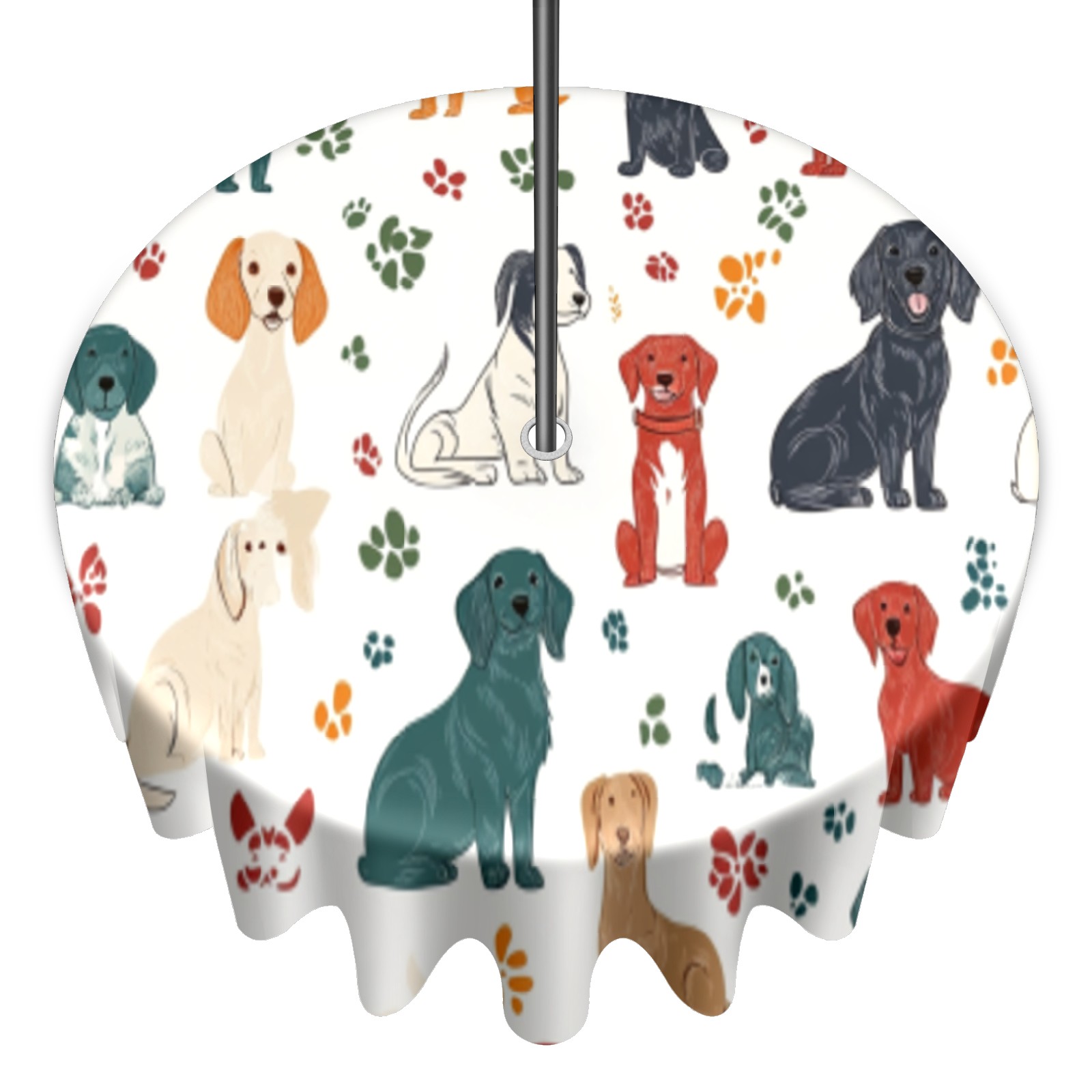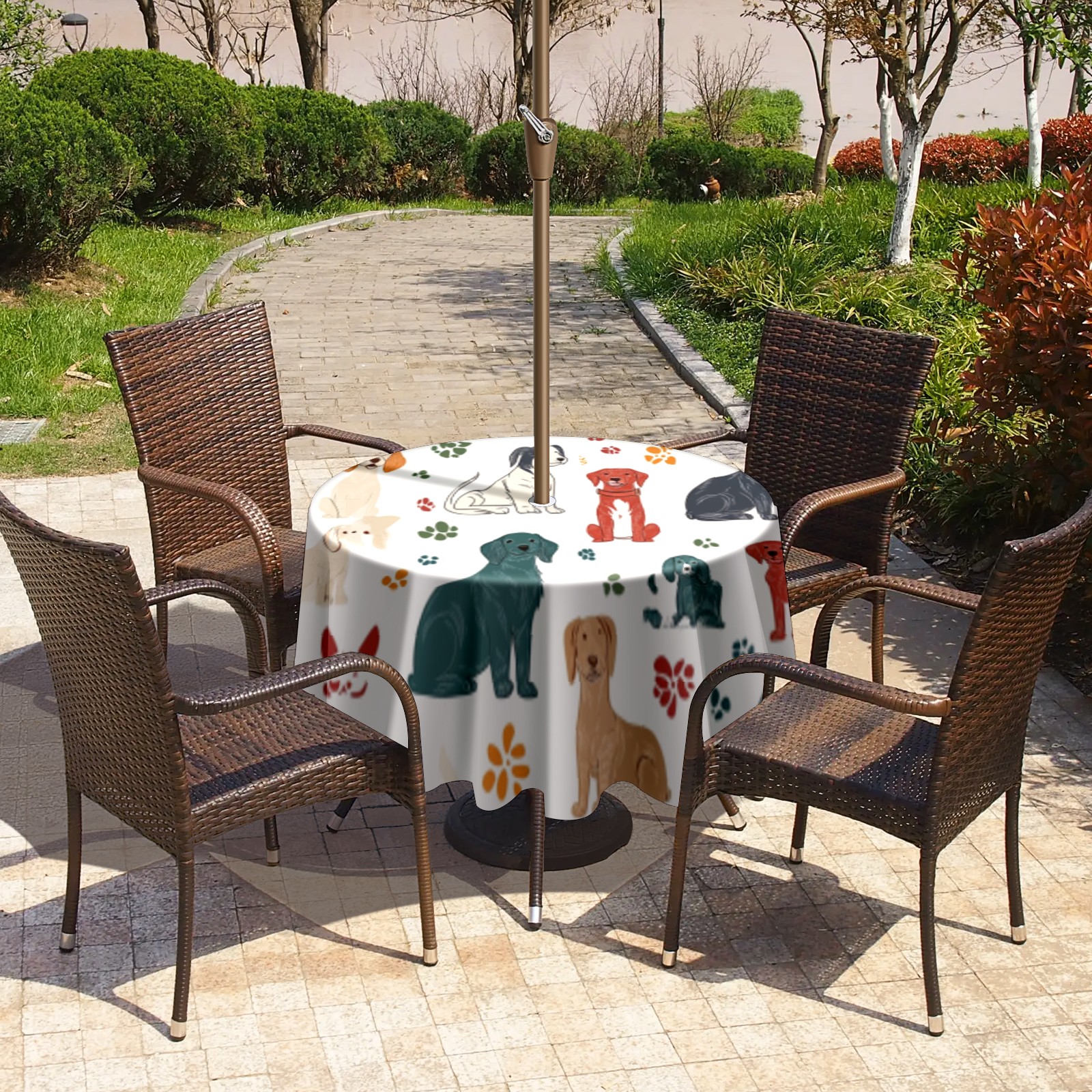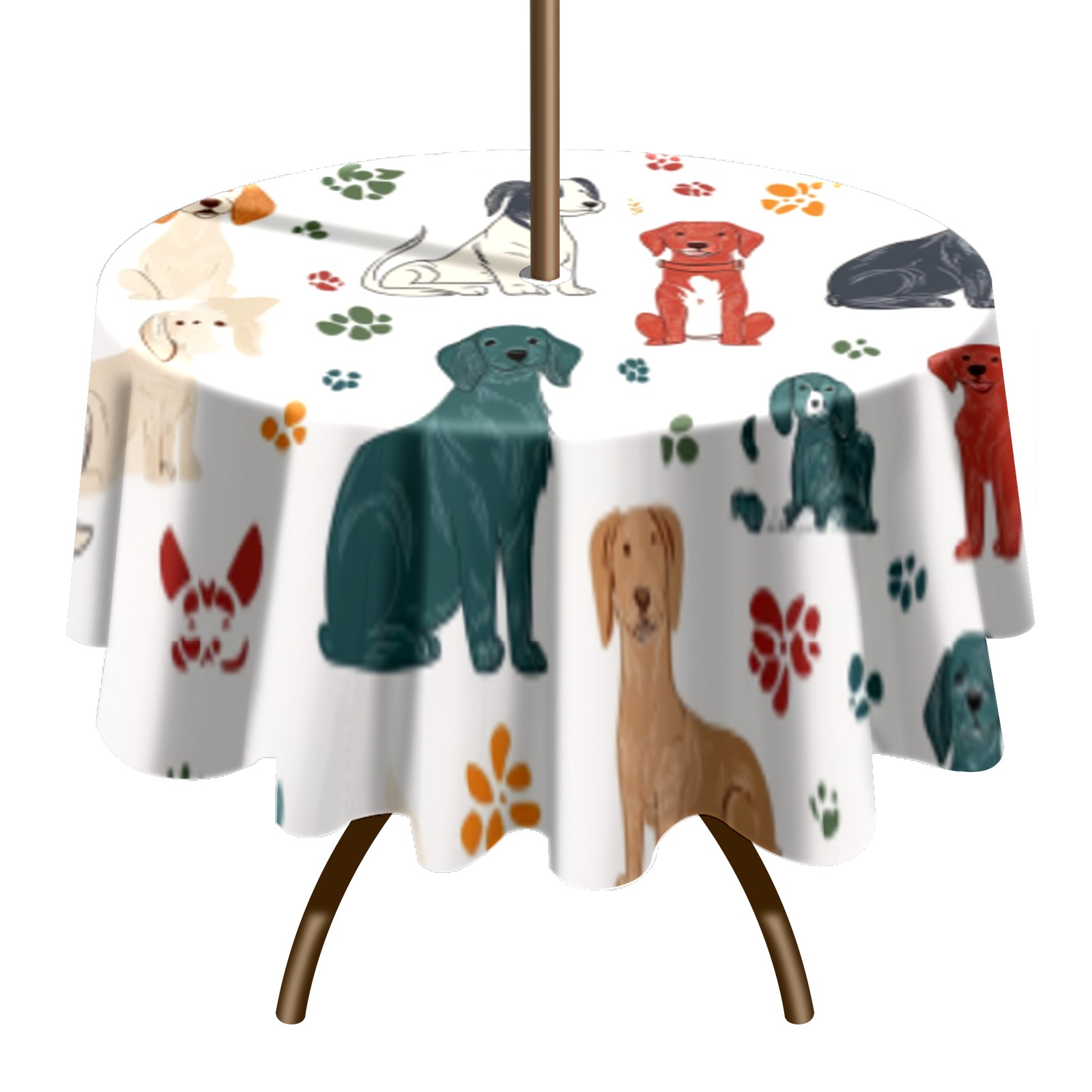 Round Tablecloth with Adjustable Zippered Umbrella Hole Polyester Table Cover Easy Install for Patio, Restaurant & Outdoor Dining Colorful Dog Pattern (60in)