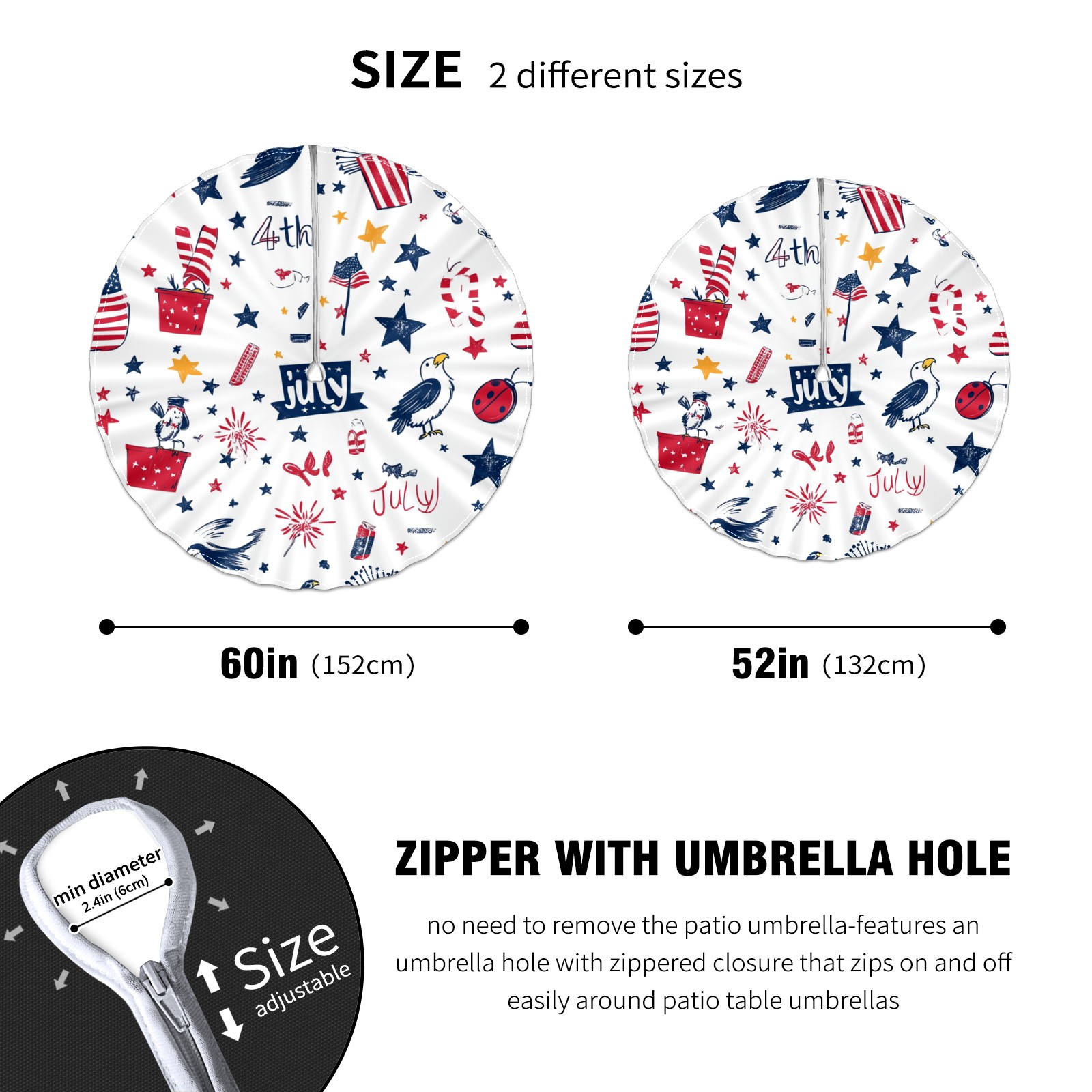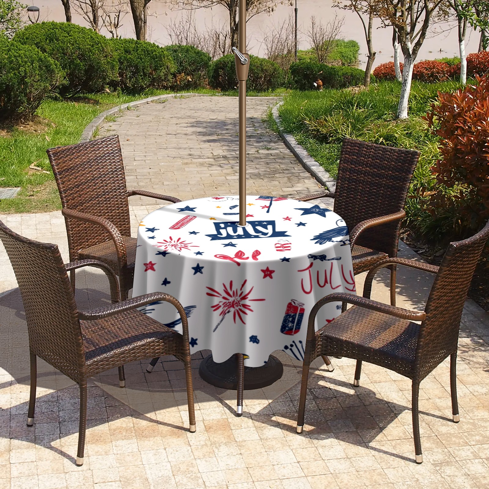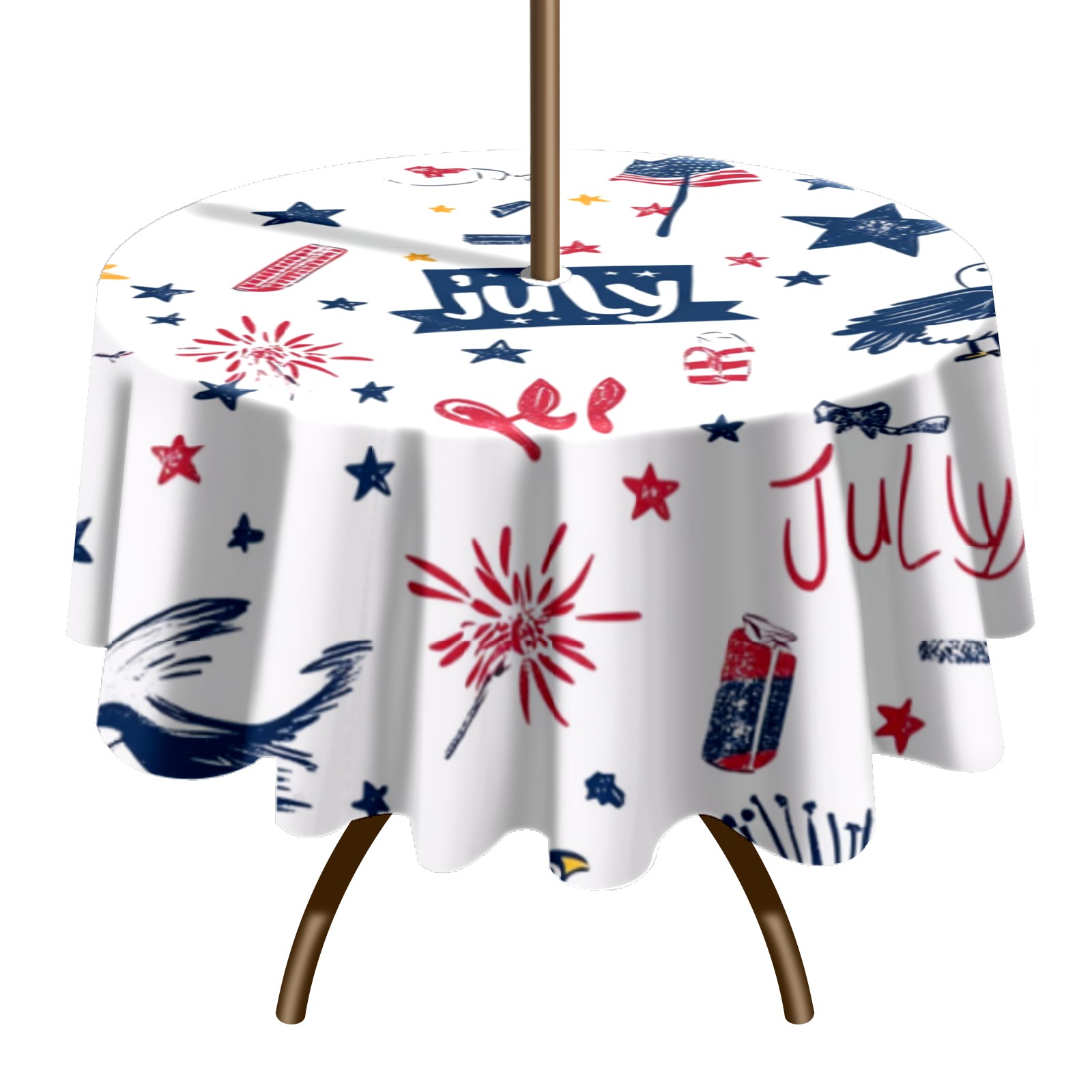 Round Tablecloth with Adjustable Zippered Umbrella Hole Polyester Table Cover Easy Install for Patio, Restaurant & Outdoor Dining July Cute Pattern (60in)
