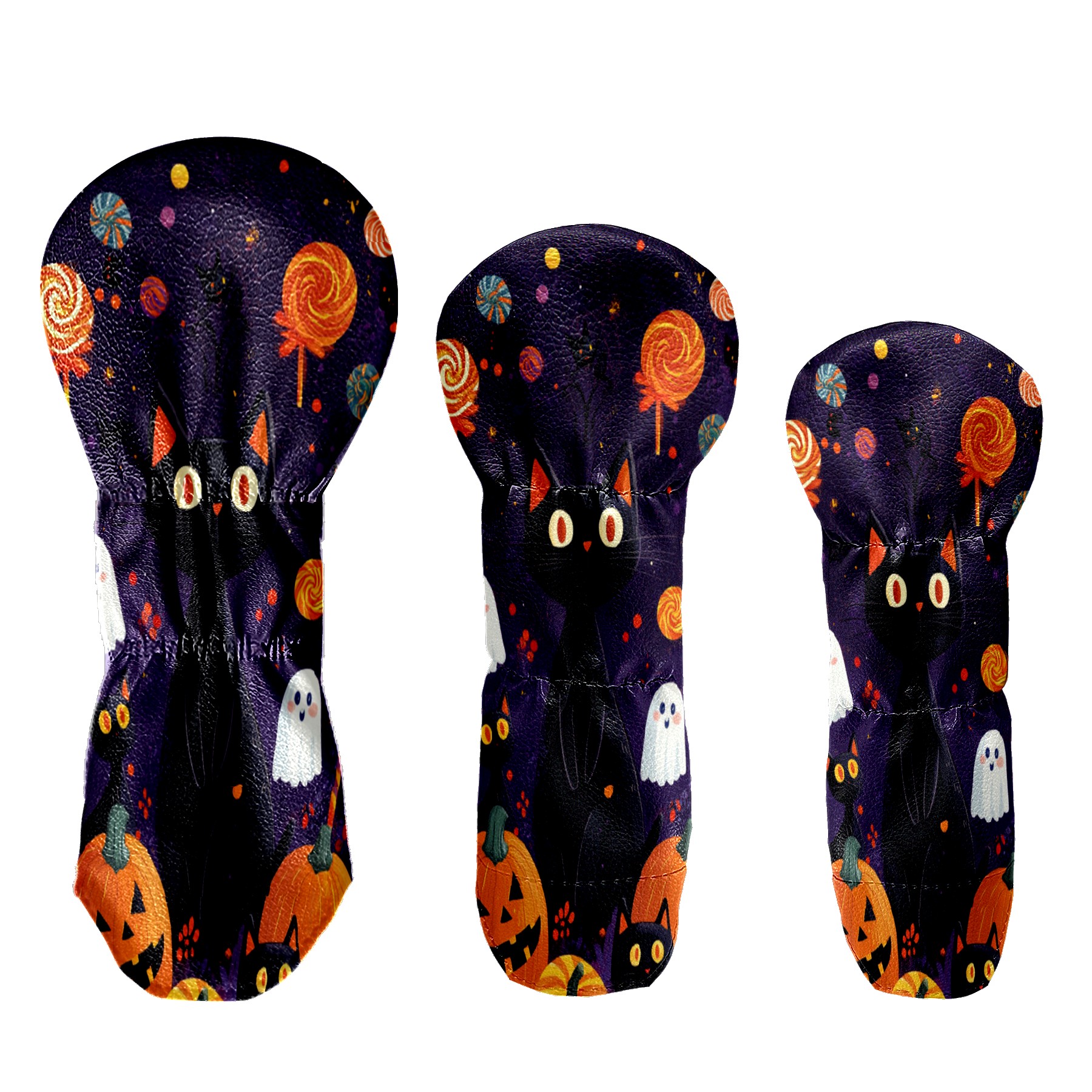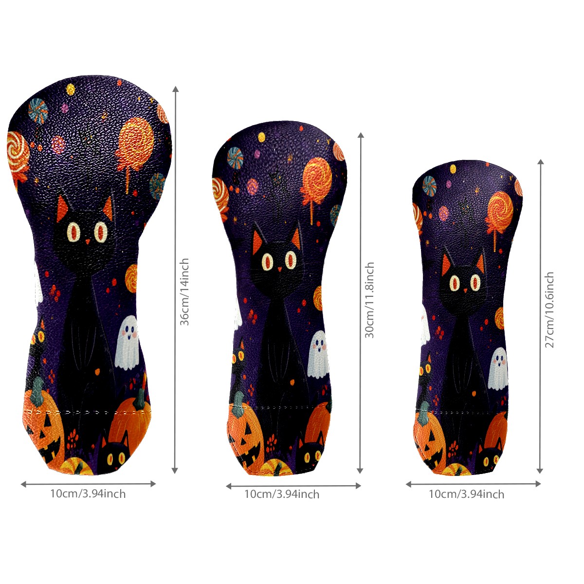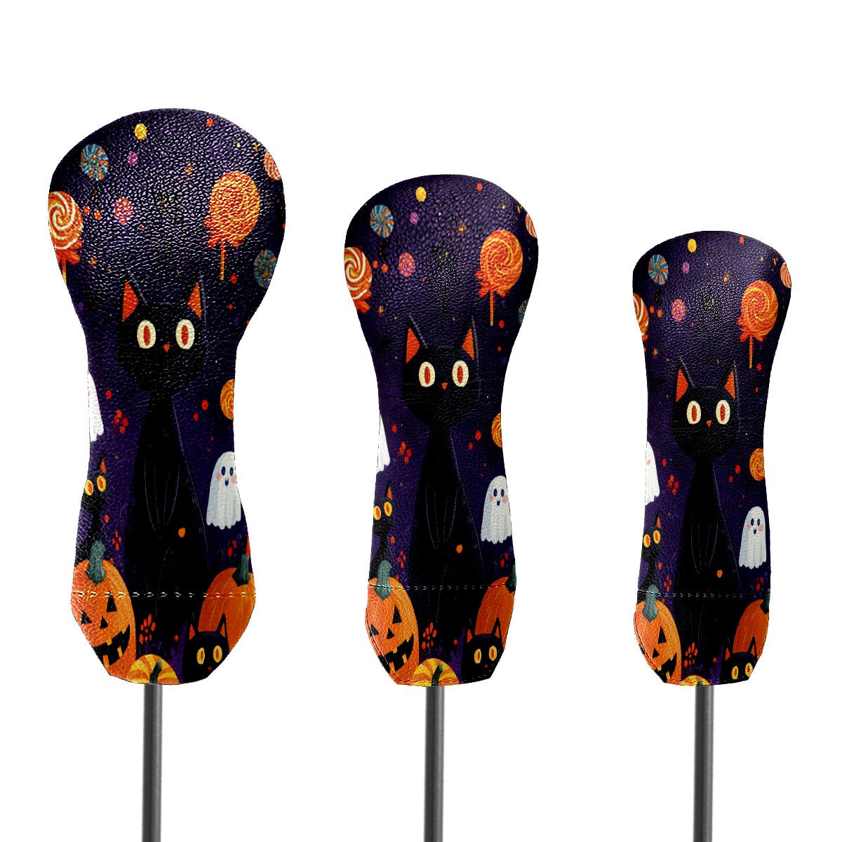 3 Pack PU Leather Golf Club Head Covers - Driver, Fairway Wood & Hybrid, Funny Golf Accessories, Ideal Golf Gift Pumpkin Cat Purple