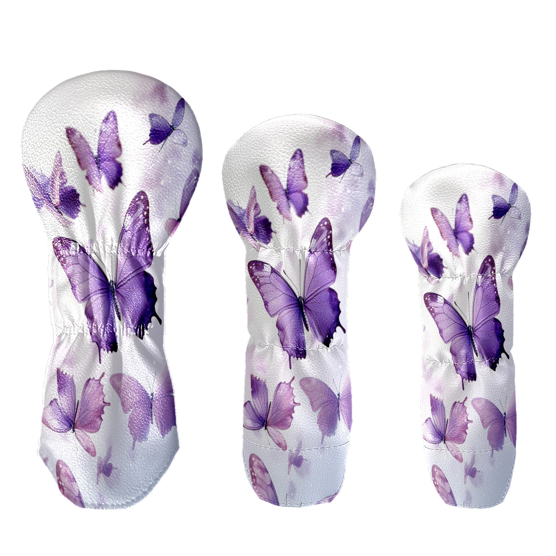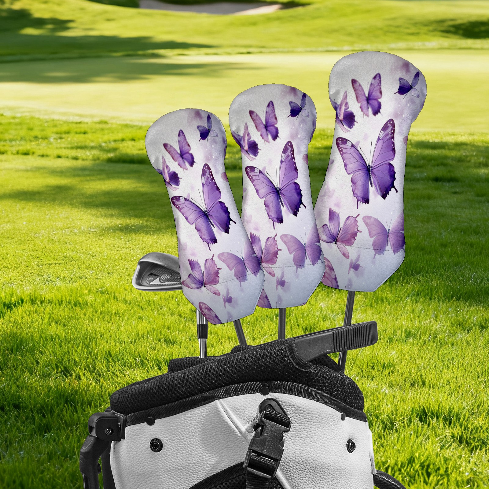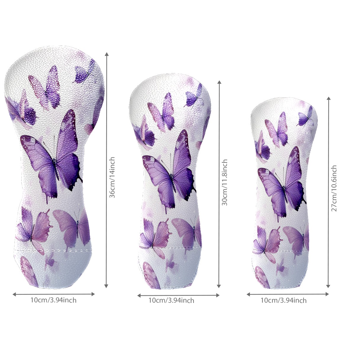 3 Pack PU Leather Golf Club Head Covers - Driver, Fairway Wood & Hybrid, Funny Golf Accessories, Ideal Golf Gift Purple Butterfly Pattern