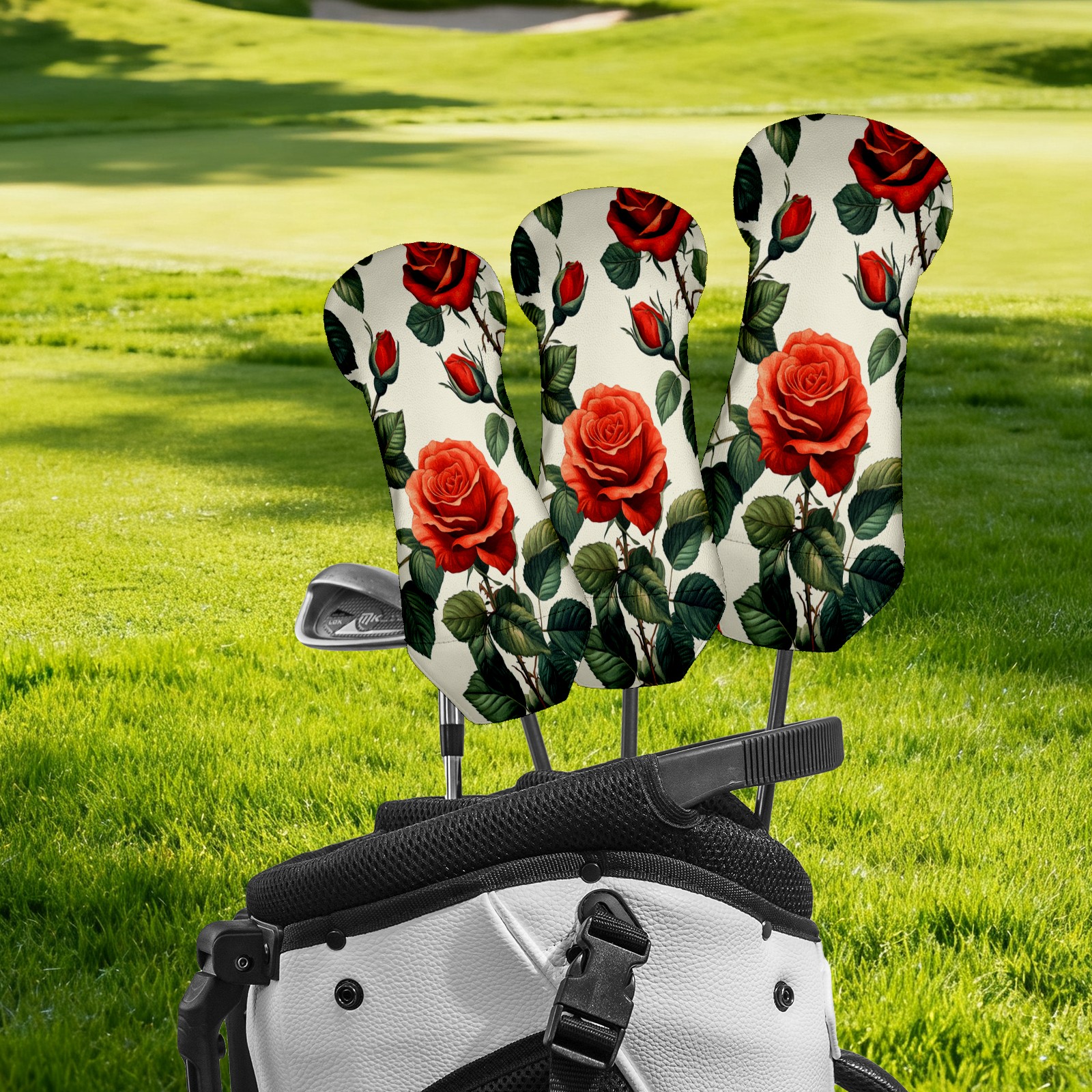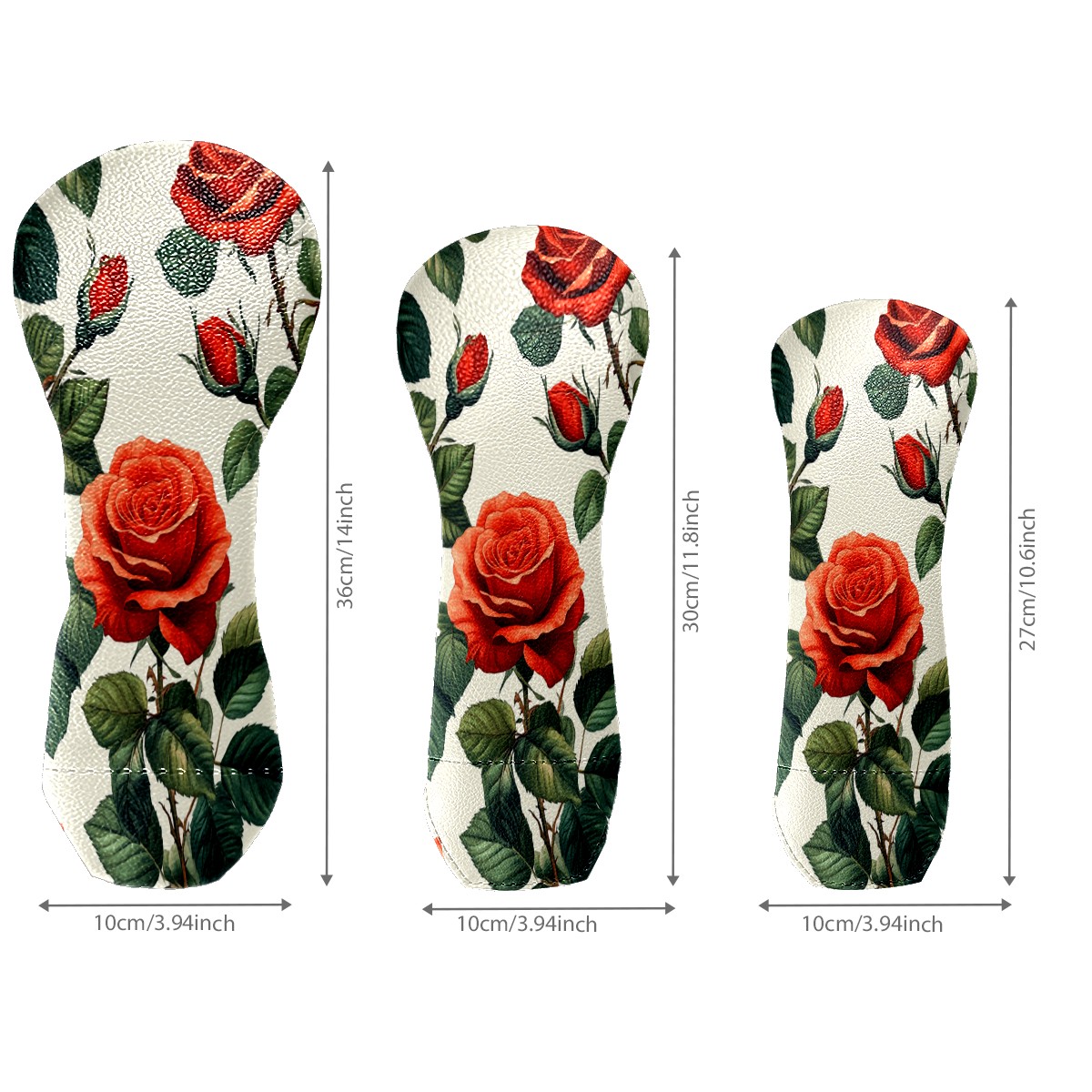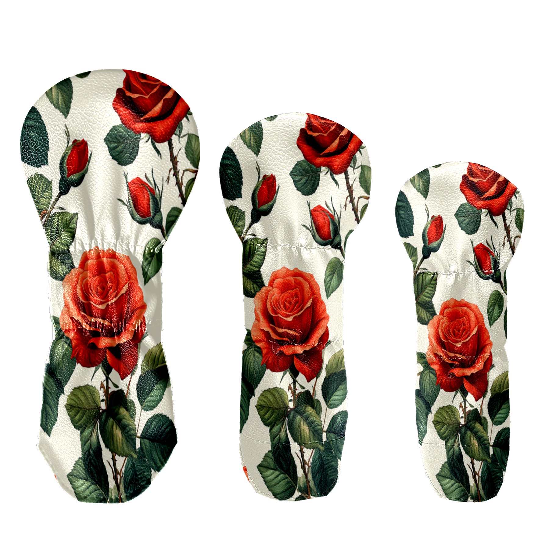 3 Pack PU Leather Golf Club Head Covers - Driver, Fairway Wood & Hybrid, Funny Golf Accessories, Ideal Golf Gift Red Rose Pattern