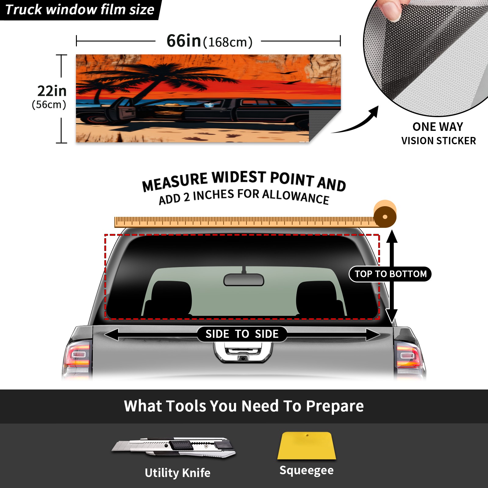 <p>This car's rear window decoration sticker measures 66 ''x22' '(with an additional 2 inches reserved for easy installation) and is compatible with most pickup trucks, SUVs, and sedans in universal specifications. Our truck's rear window film is made of high-quality PVC vinyl material, which is waterproof, sun resistant, and weather resistant, effectively resisting ultraviolet rays and preventing fading. Unique one-way transparent design, opaque pattern from the outside, protecting privacy inside the car; The view inside the car is clear and transparent, without affecting the observation of the road conditions outside the car. Easy installation, easy to locate by tearing off the sticker, and excess parts can be cut and removed; Easy disassembly without residue. Dazzling design paired with vibrant colors, making your car stand out instantly and increasing its return rate<br></p>