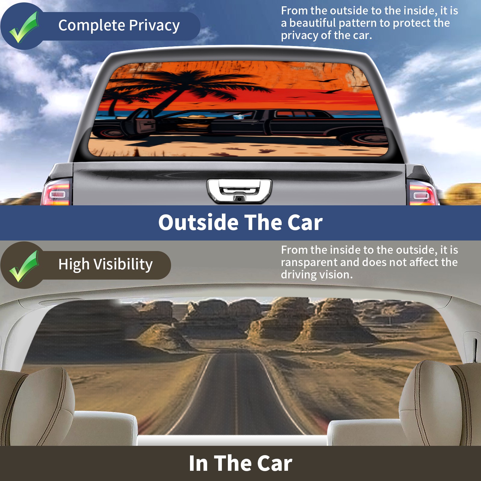 • <p>This car's rear window decoration sticker measures 66 ''x22' '(with an additional 2 inches reserved for easy installation) and is compatible with most pickup trucks, SUVs, and sedans in universal specifications. Our truck's rear window film is made of high-quality PVC vinyl material, which is waterproof, sun resistant, and weather resistant, effectively resisting ultraviolet rays and preventing fading. Unique one-way transparent design, opaque pattern from the outside, protecting privacy inside the car; The view inside the car is clear and transparent, without affecting the observation of the road conditions outside the car. Easy installation, easy to locate by tearing off the sticker, and excess parts can be cut and removed; Easy disassembly without residue. Dazzling design paired with vibrant colors, making your car stand out instantly and increasing its return rate<br></p>