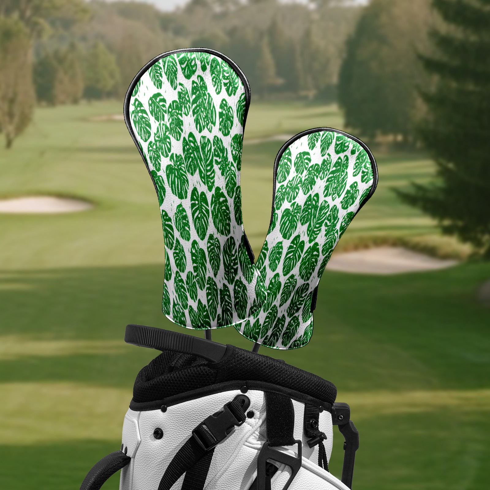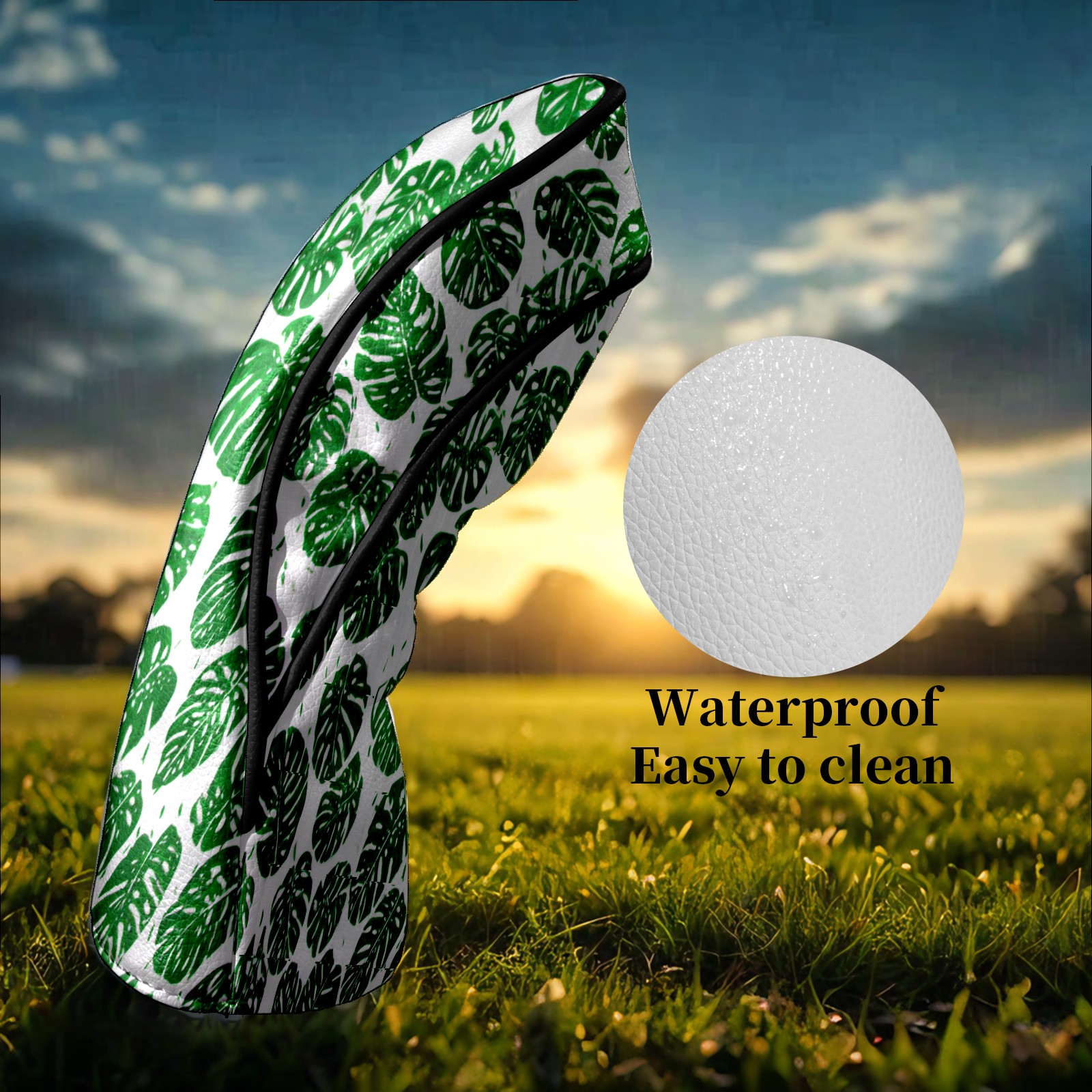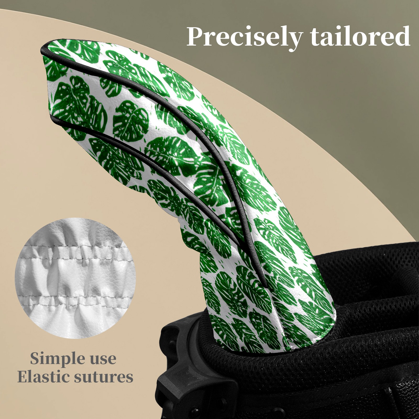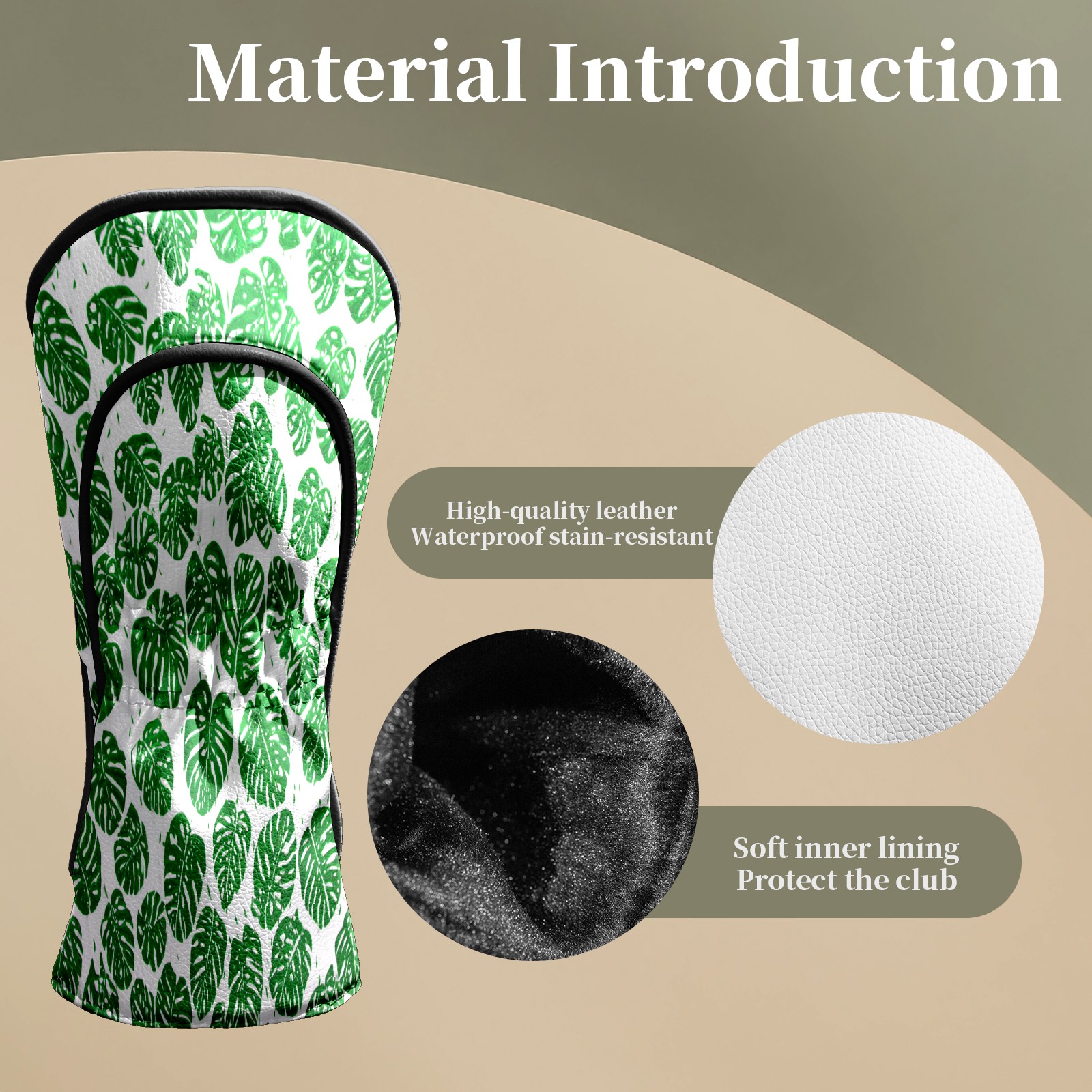 Counullo Golf Head Covers - Green Leaves White Driver Fairway Headcover, Durable PU Leather & Soft Velvet Lining, Secure Elastic Band, Perfect Christmas Golf Gift for Men