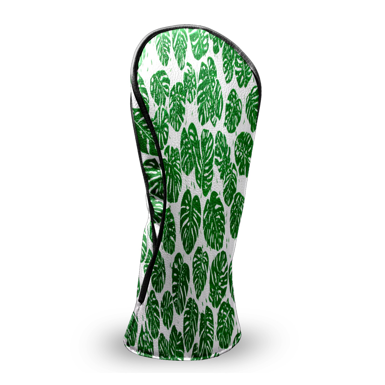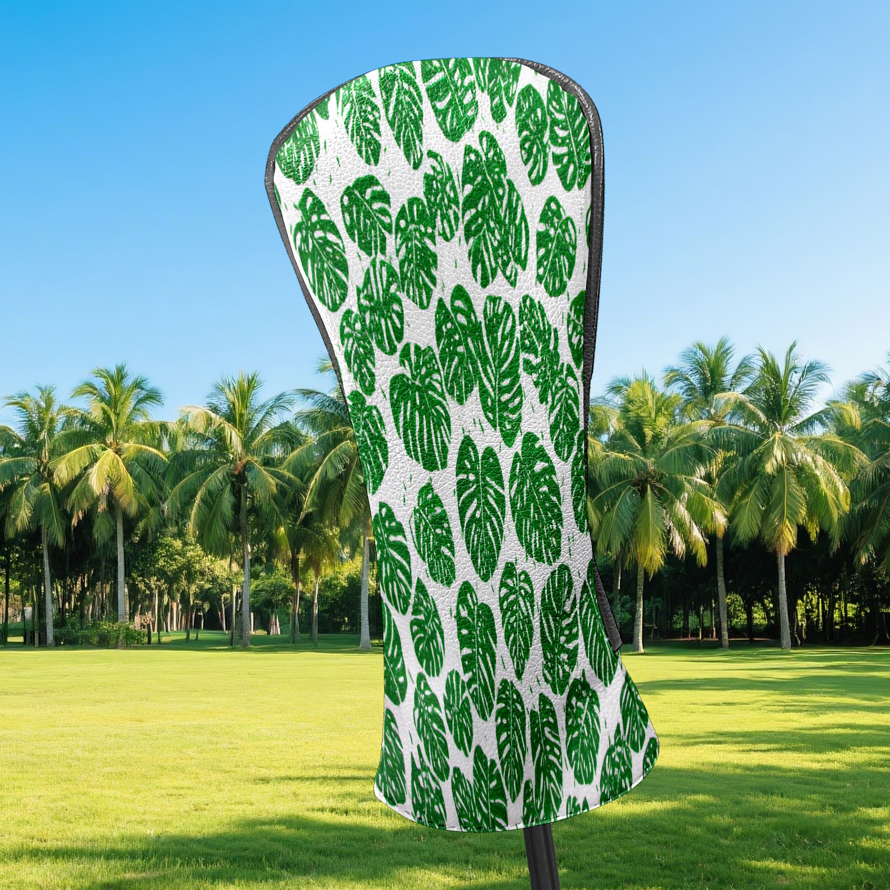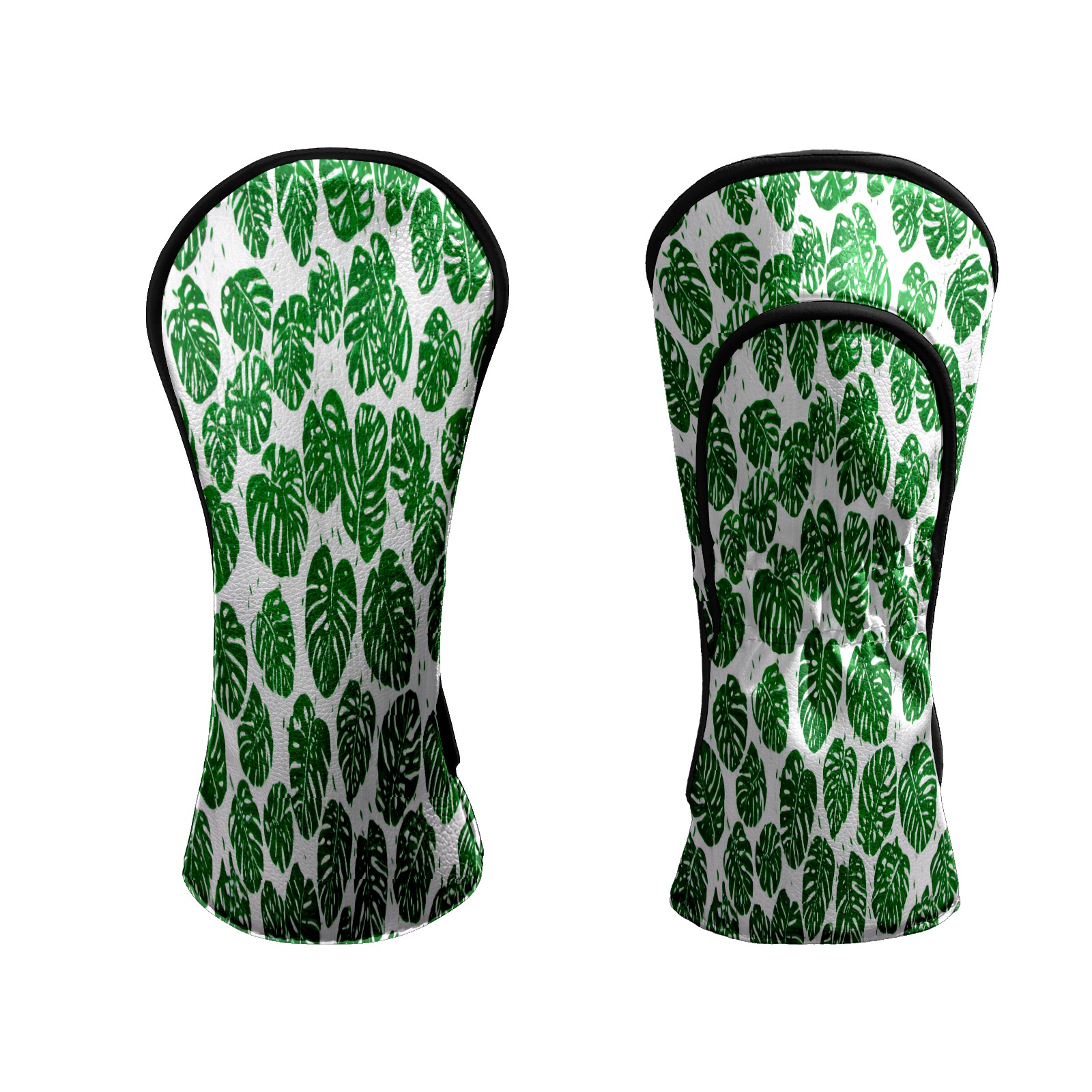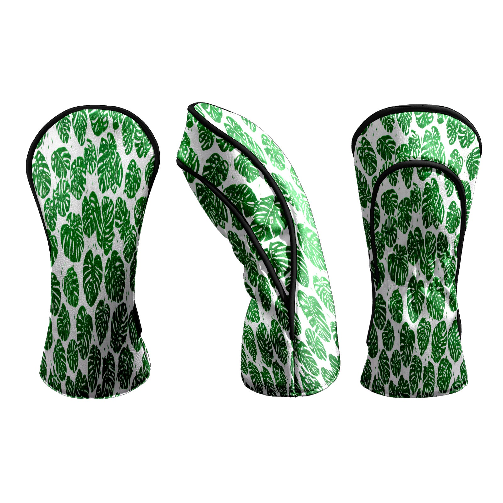 Counullo Golf Head Covers - Green Leaves White Driver Fairway Headcover, Durable PU Leather & Soft Velvet Lining, Secure Elastic Band, Perfect Christmas Golf Gift for Men