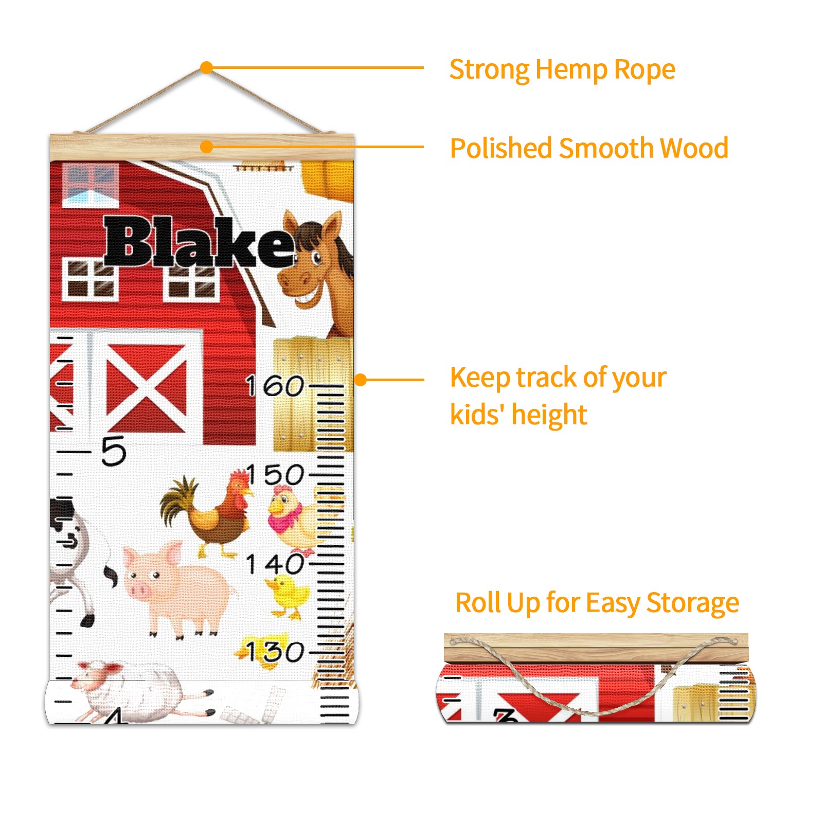 Personalized Kids Name Growth Chart Ruler for Wall Wood Frame Canvas Height Measure Chart 13.4x56 in Hanging Growth Chart Farm Animals Horse Red Barn12.1 Boys Girls Room Decor