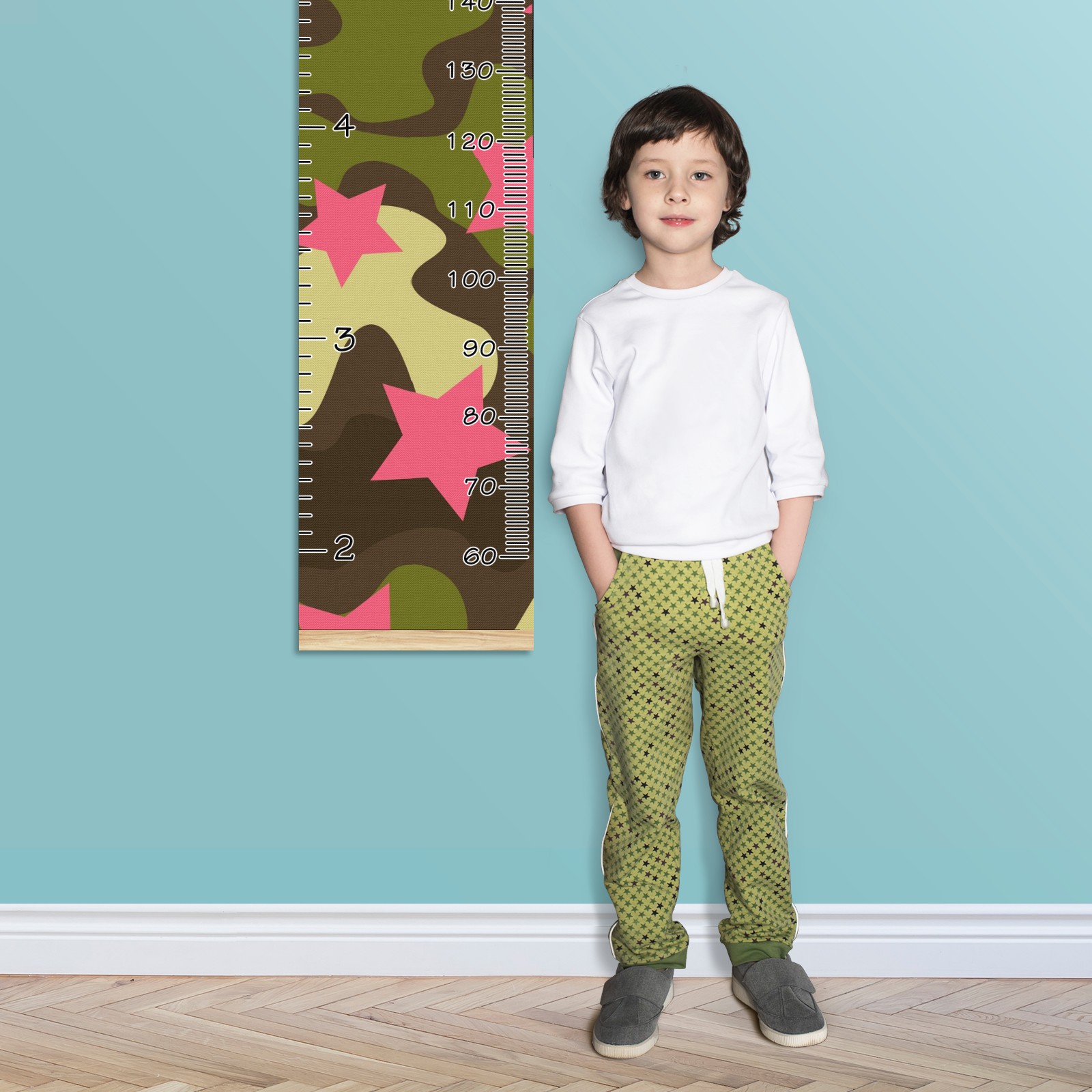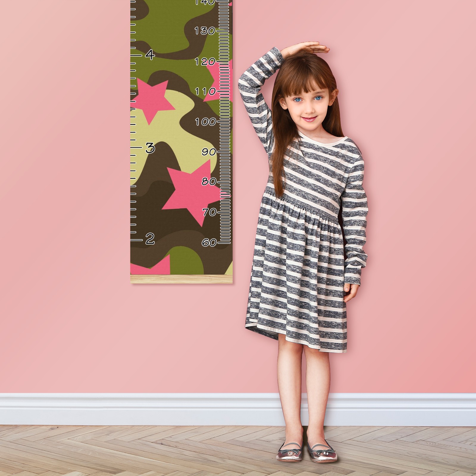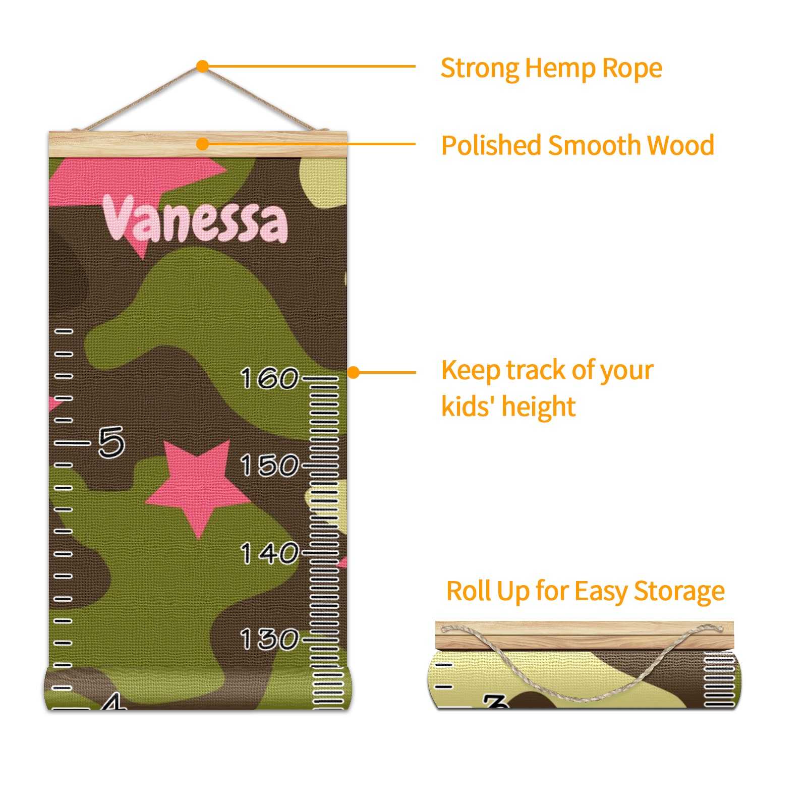 Personalized Kids Name Growth Chart Ruler for Wall Wood Frame Canvas Height Measure Chart 13.4x56 in Hanging Growth Chart Camouflage Print Pink Star12.1 Boys Girls Room Decor