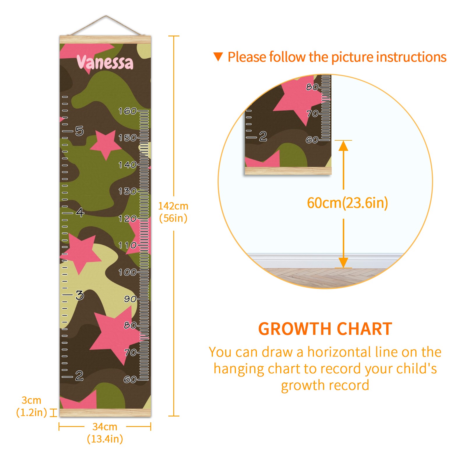 <p><b>Features:</b></p> <p>Rope for Hanging</p> <p>Material: Linen + Wood</p> <p>Dimensions: 13.4x56 inches</p> <p>Package Included: 1 * Baby Growth Chart</p> <p><b>Baby height growth chart can be used anywhere</b></p> <p>Ideal for kids nursery decoration, kids bedroom, interior walls or windows, playroom, living room, homedecoration.Add name and make the growth chart special!</p> <p><b>Easy to fold and carry</b></p> <p>With rope at the top of the growth chart, it is easy to install and remove.You can fold it and unfold any time any where.</p> <p><b>Perfect Gift Idea for Kids</b></p> <p>Environmental and non-toxic for kids use, it must be a perfect gift for baby, kids, girls, and boys.This is a best choice for your friend who have kids or baby as a popular gift.</p> <p><b>Easy to read</b></p> <p>Measurement accrate with 2 scales, Centimeters and feet. The letters are big enough, very easy to read.</p> <p><b>60cm(23.6inch) Over Ground Design</b></p> <p>Not only can protect from dust and other damage, but also will not interfere in floor cleaning.</p>