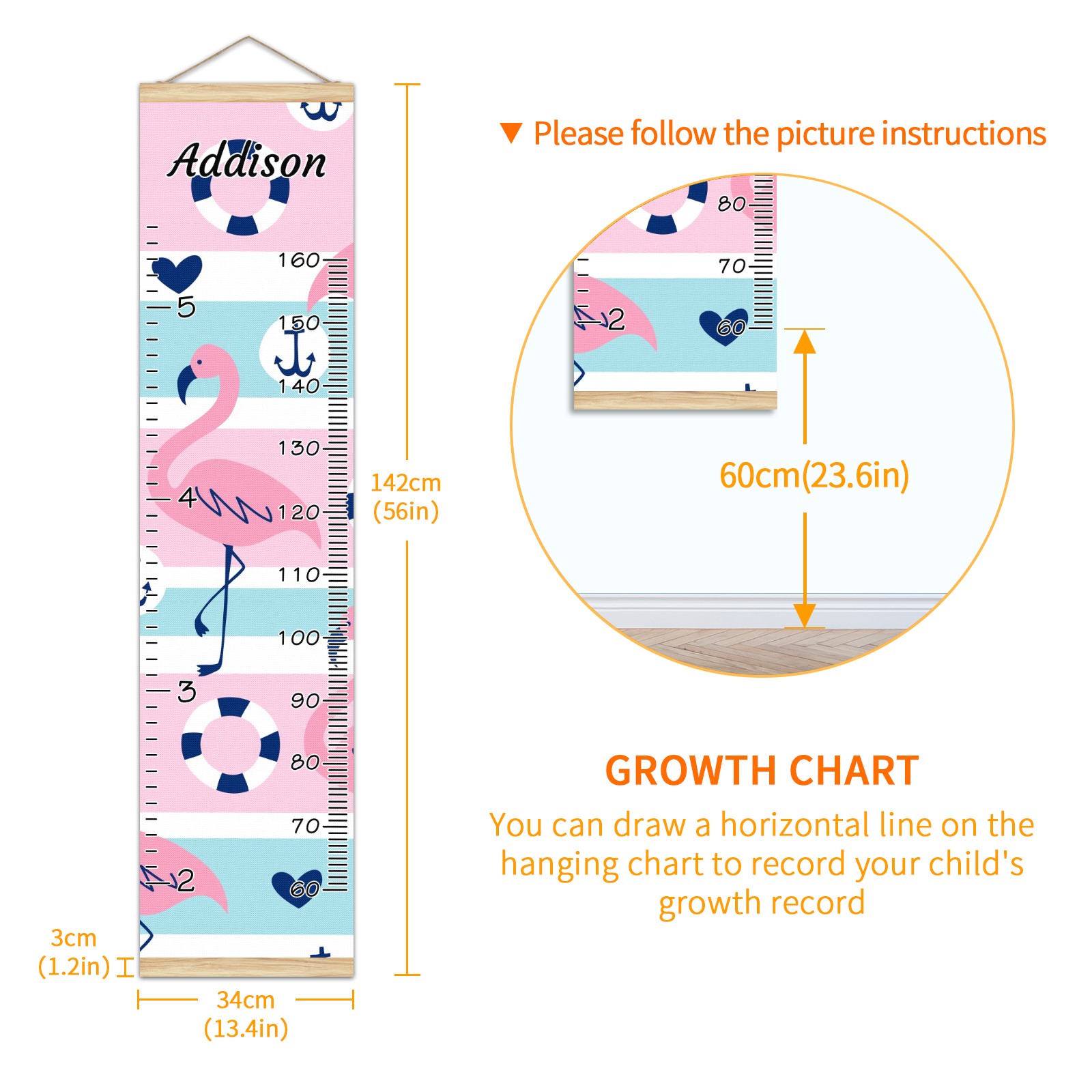<p><b>Features:</b></p> <p>Rope for Hanging</p> <p>Material: Linen + Wood</p> <p>Dimensions: 13.4x56 inches</p> <p>Package Included: 1 * Baby Growth Chart</p> <p><b>Baby height growth chart can be used anywhere</b></p> <p>Ideal for kids nursery decoration, kids bedroom, interior walls or windows, playroom, living room, homedecoration.Add name and make the growth chart special!</p> <p><b>Easy to fold and carry</b></p> <p>With rope at the top of the growth chart, it is easy to install and remove.You can fold it and unfold any time any where.</p> <p><b>Perfect Gift Idea for Kids</b></p> <p>Environmental and non-toxic for kids use, it must be a perfect gift for baby, kids, girls, and boys.This is a best choice for your friend who have kids or baby as a popular gift.</p> <p><b>Easy to read</b></p> <p>Measurement accrate with 2 scales, Centimeters and feet. The letters are big enough, very easy to read.</p> <p><b>60cm(23.6inch) Over Ground Design</b></p> <p>Not only can protect from dust and other damage, but also will not interfere in floor cleaning.</p>