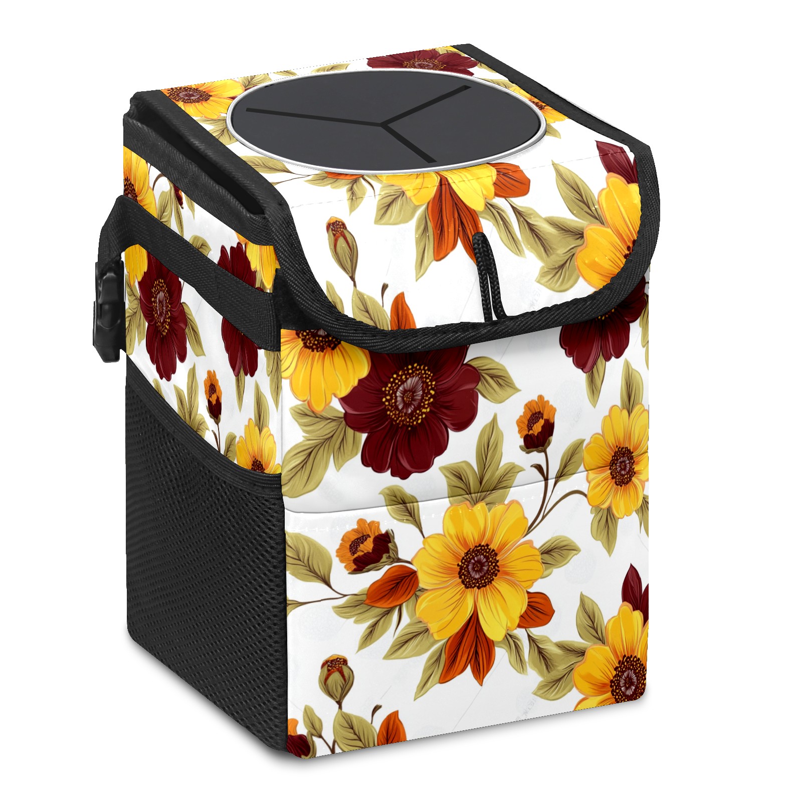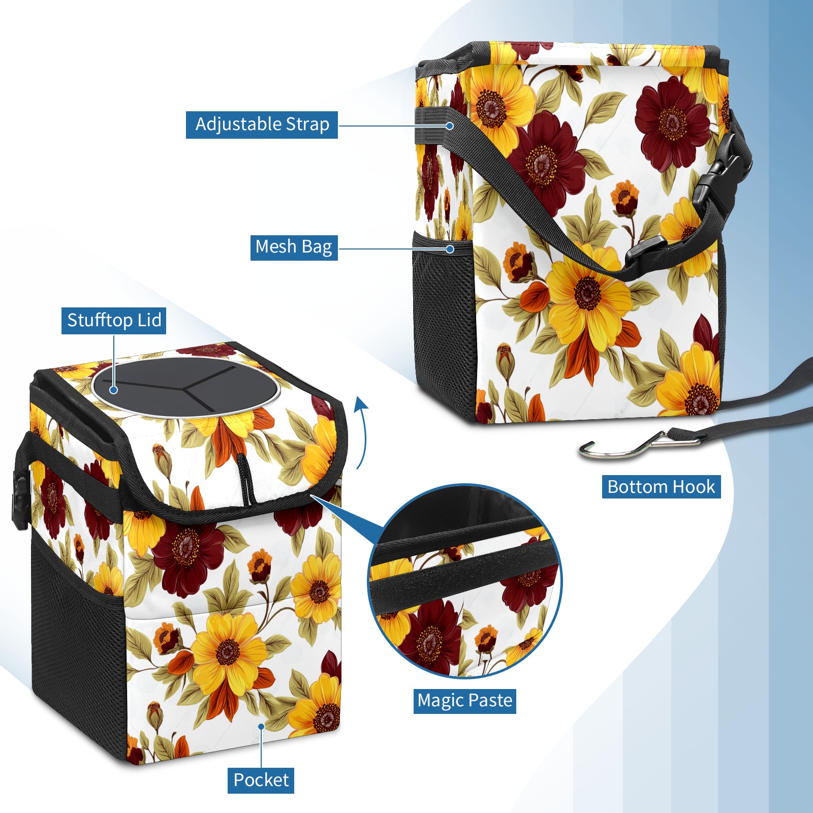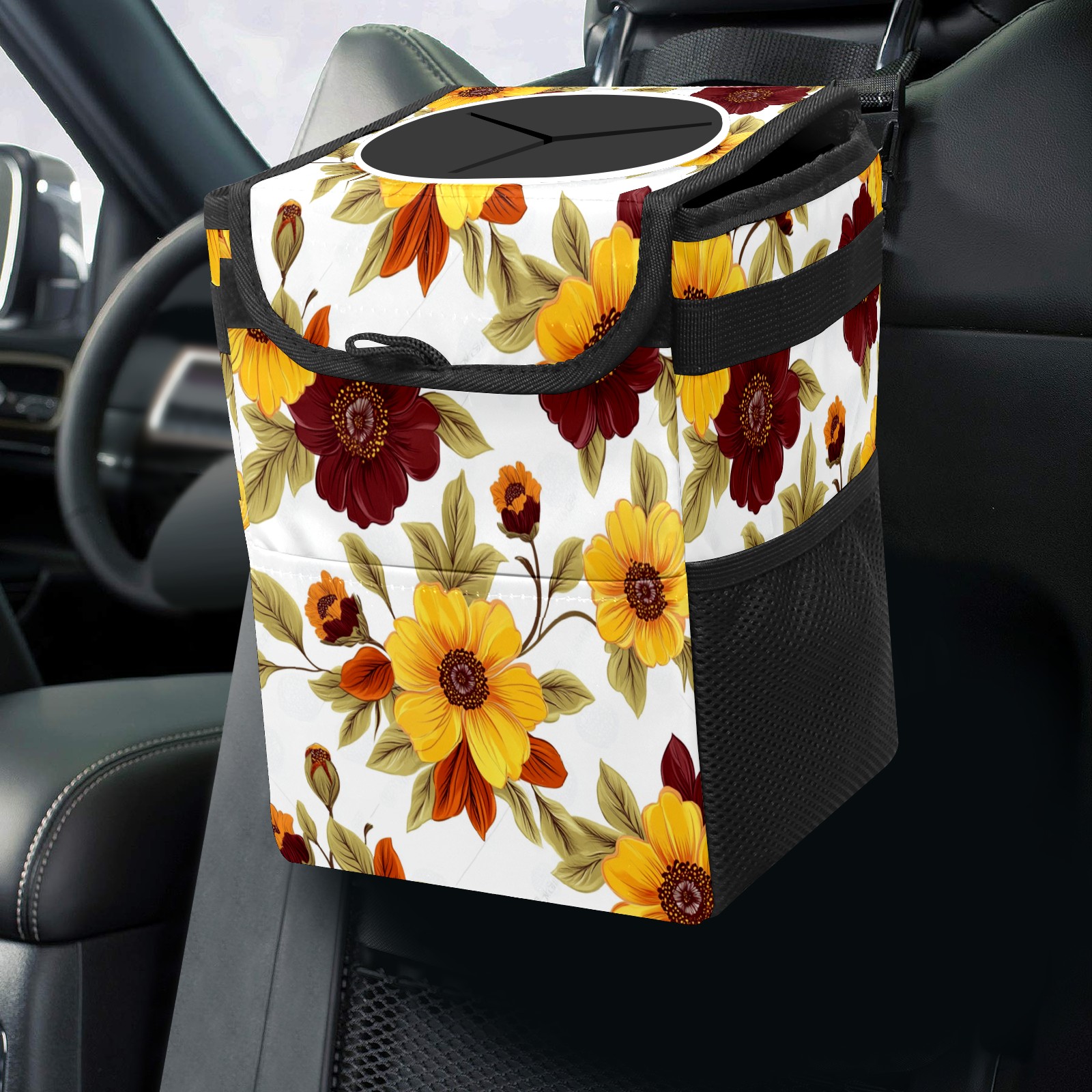Universal Hanging Car Trash Can - Leakproof Design with Secure Lid | Fits SUV, Truck, Van | Front & Back Seat Friendly | Smart Automotive Accessory Marigold & Red Flower Pattern