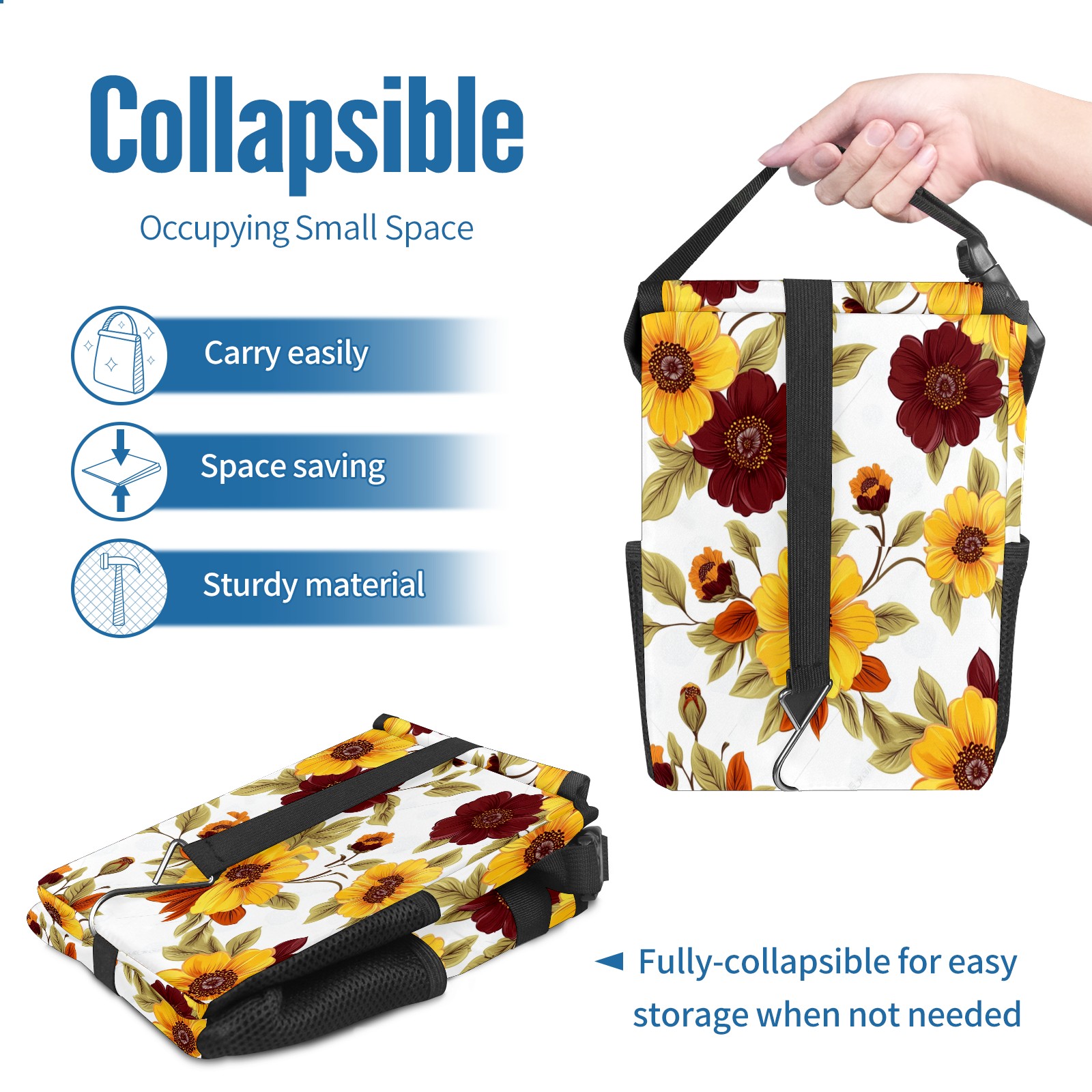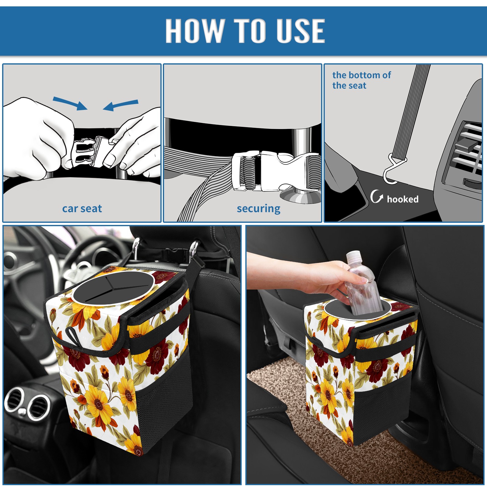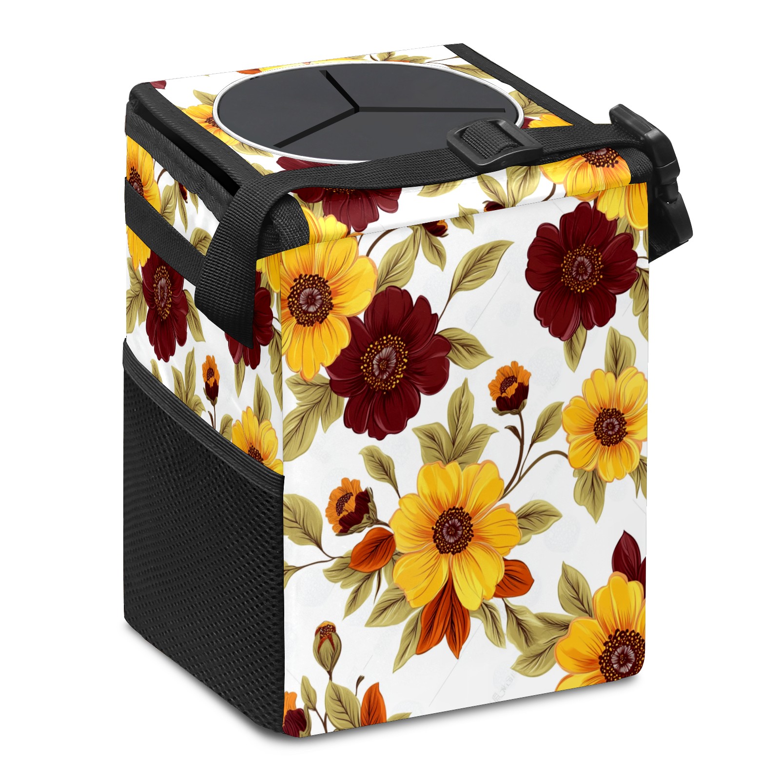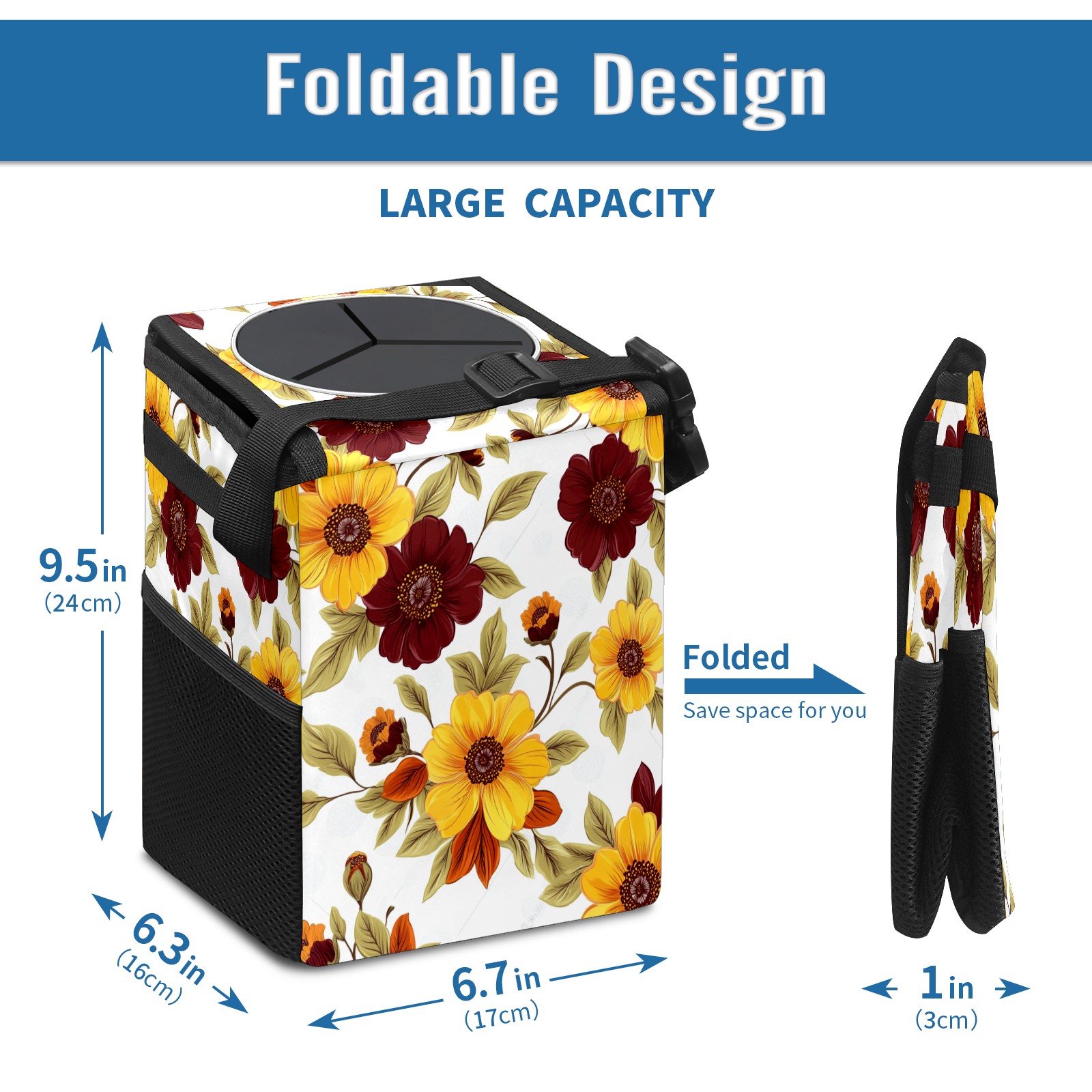 Universal Hanging Car Trash Can - Leakproof Design with Secure Lid | Fits SUV, Truck, Van | Front & Back Seat Friendly | Smart Automotive Accessory Marigold & Red Flower Pattern