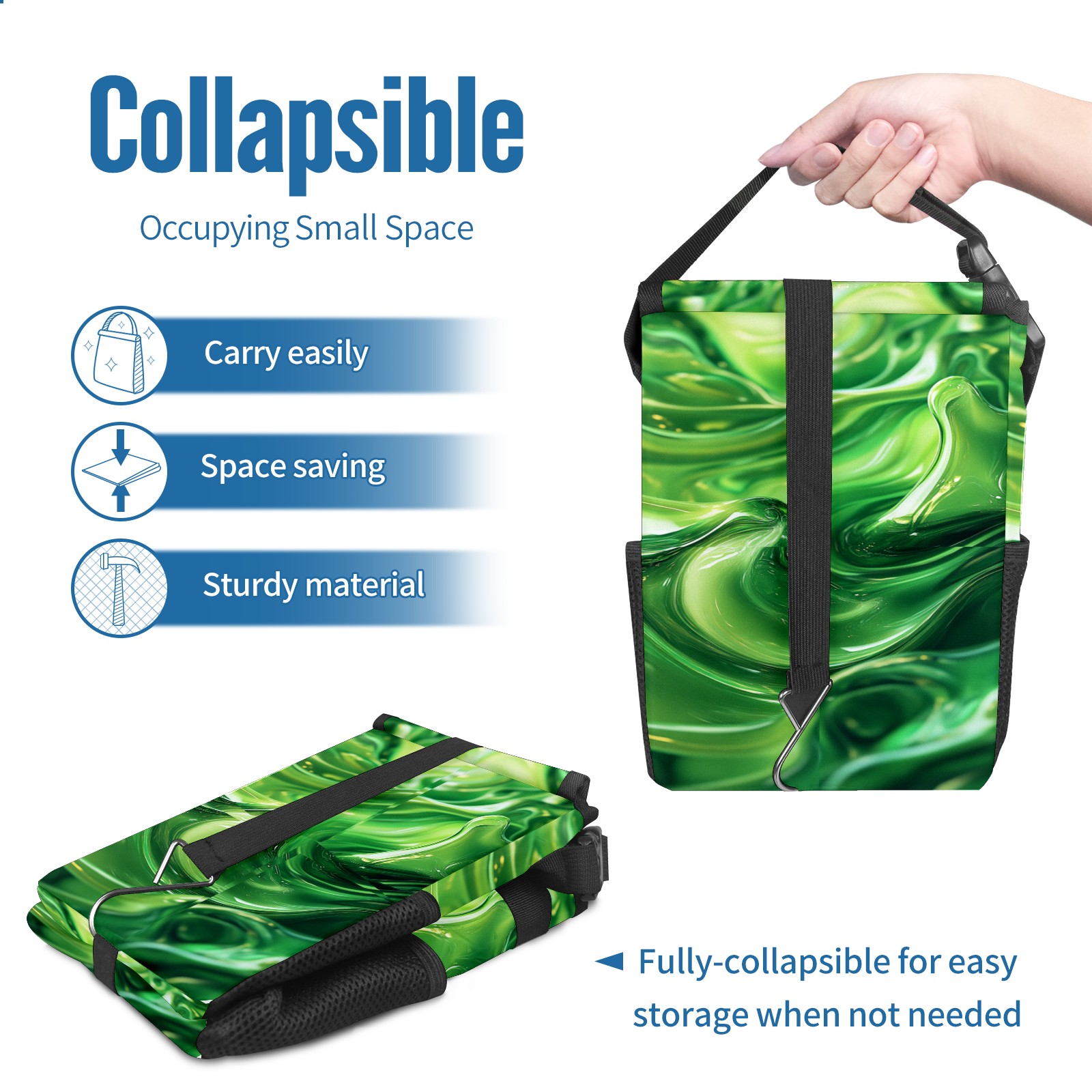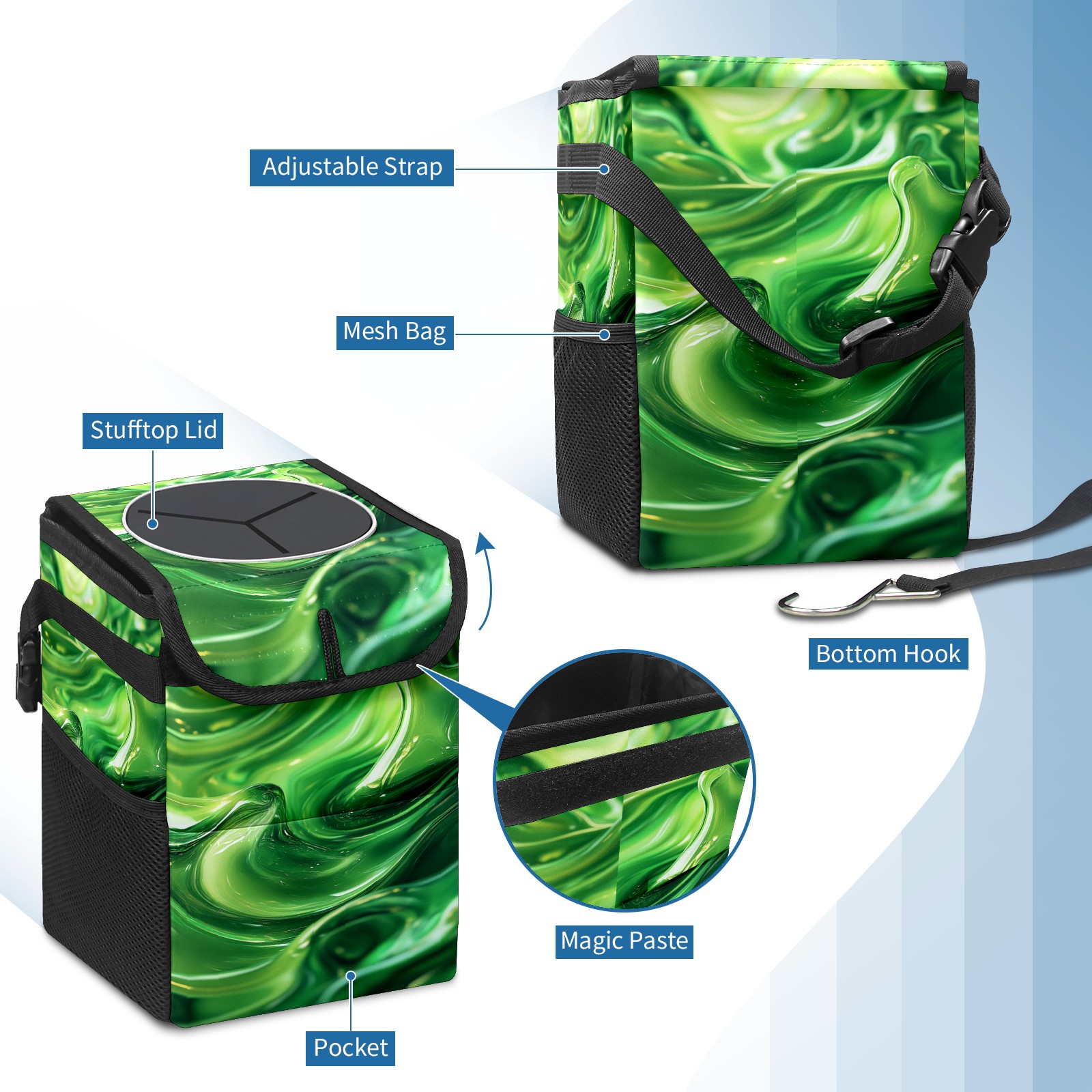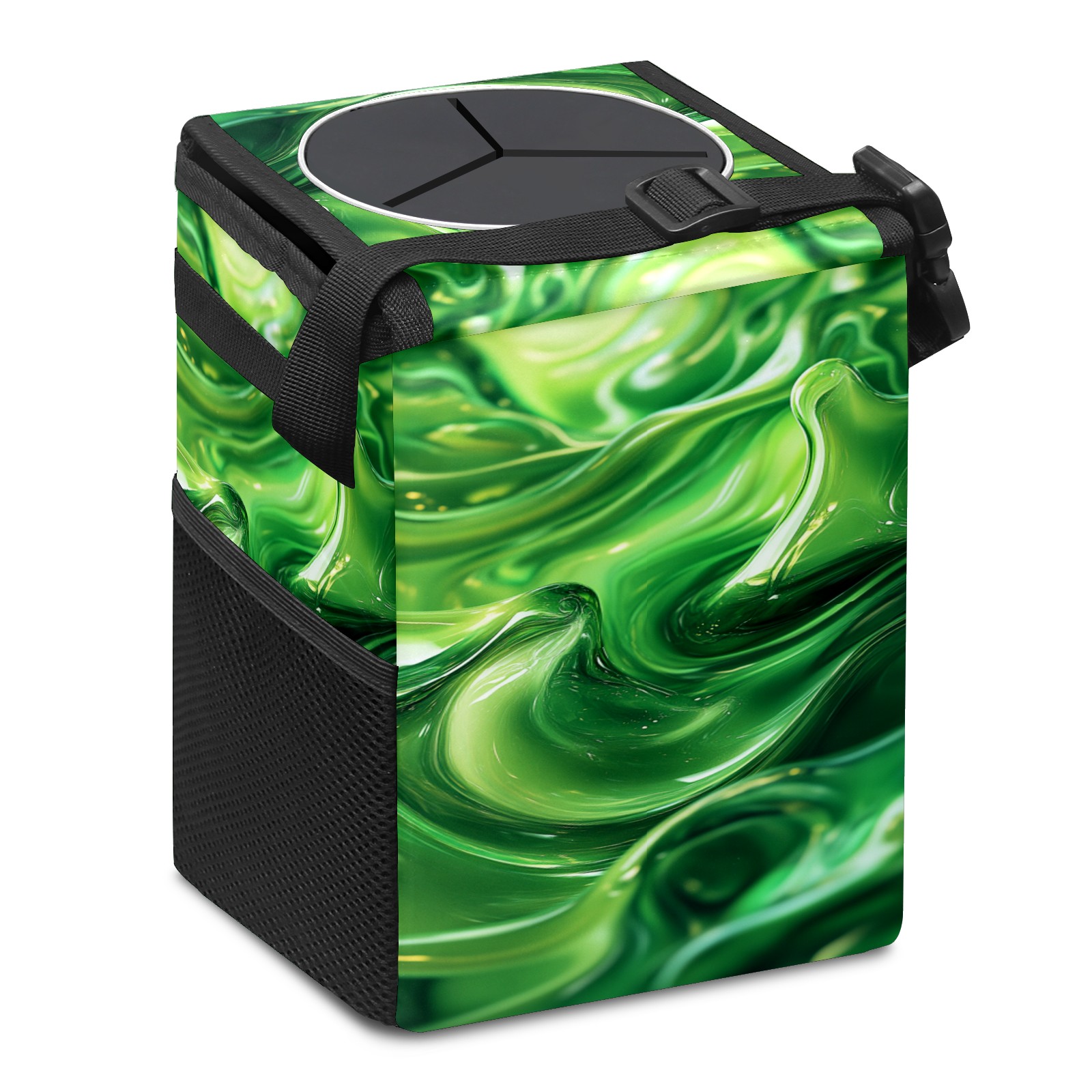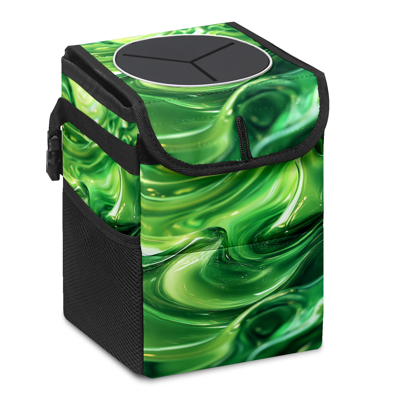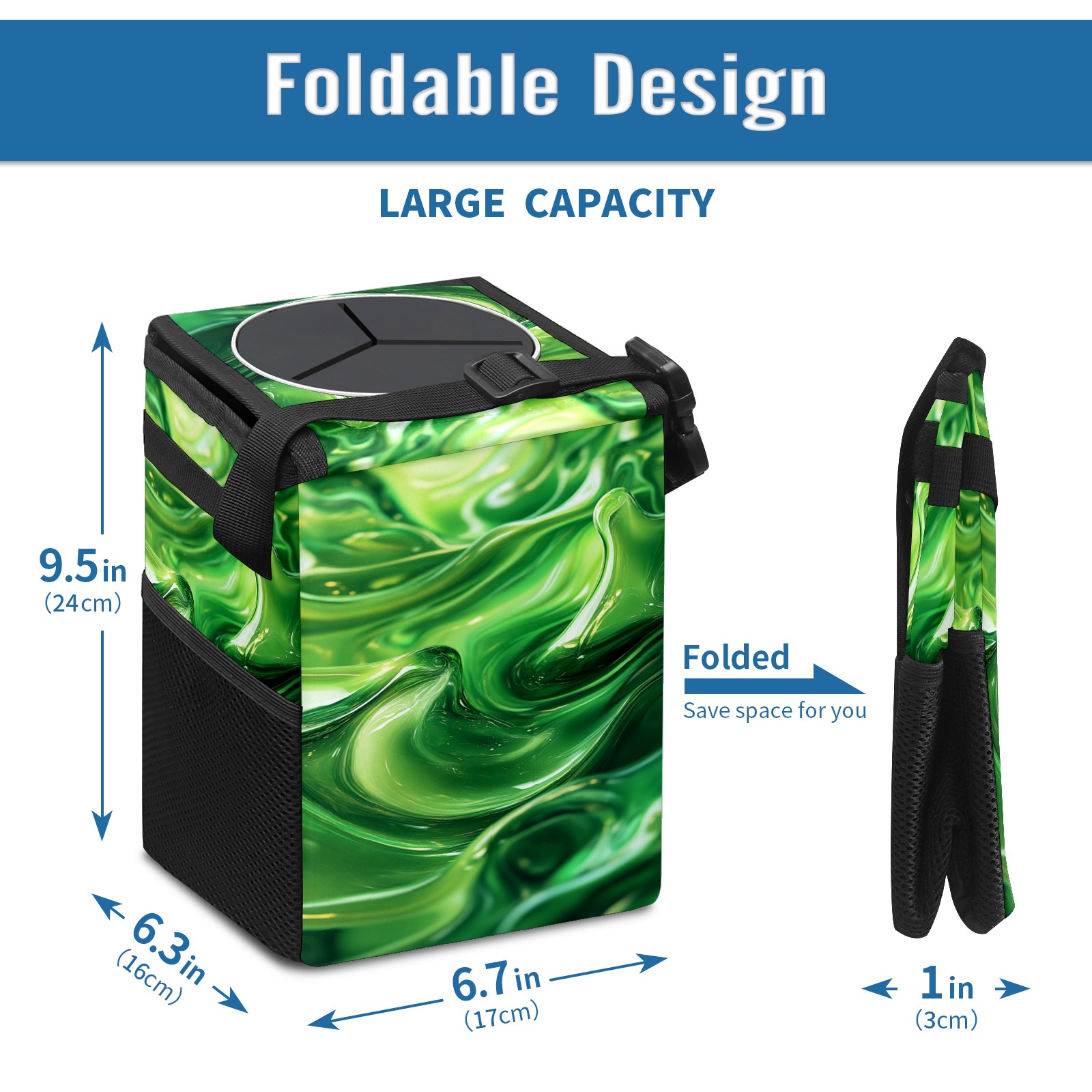 • <p>This multi-functional car trash can features a stylish printed design, combining practicality and aesthetics. Made with high-quality twill fabric and woven straps, it's sturdy and durable. Dimensions: 24×17×16cm (9.5×6.7×6.3 inches). The top rubber opening lid makes disposing of trash easy, while side mesh pockets and a front pocket easily store snacks, mobile phones, and other small items. Equipped with a dual securing system of straps and elastic hooks, it can be flexibly hung behind headrests, inside armrest boxes, or hooked to the bottom of seat cushions. Not only can it be used as a trash can, but it can also function as a food or miscellaneous item storage box, achieving multiple uses. When not in use, it can be folded for storage, saving space and creating a clean and tidy environment for your car.<br></p>