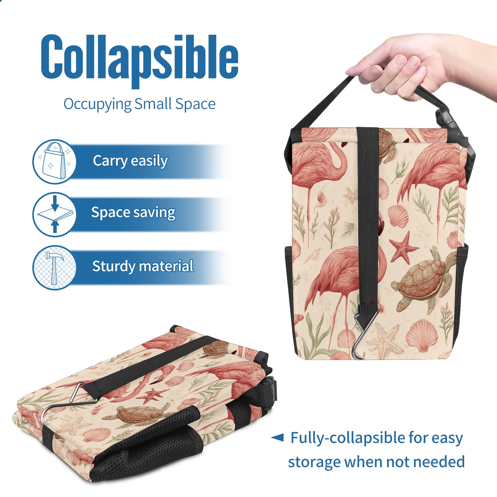• <p>This multi-functional car trash can features a stylish printed design, combining practicality and aesthetics. Made with high-quality twill fabric and woven straps, it's sturdy and durable. Dimensions: 24×17×16cm (9.5×6.7×6.3 inches). The top rubber opening lid makes disposing of trash easy, while side mesh pockets and a front pocket easily store snacks, mobile phones, and other small items. Equipped with a dual securing system of straps and elastic hooks, it can be flexibly hung behind headrests, inside armrest boxes, or hooked to the bottom of seat cushions. Not only can it be used as a trash can, but it can also function as a food or miscellaneous item storage box, achieving multiple uses. When not in use, it can be folded for storage, saving space and creating a clean and tidy environment for your car.<br></p>
