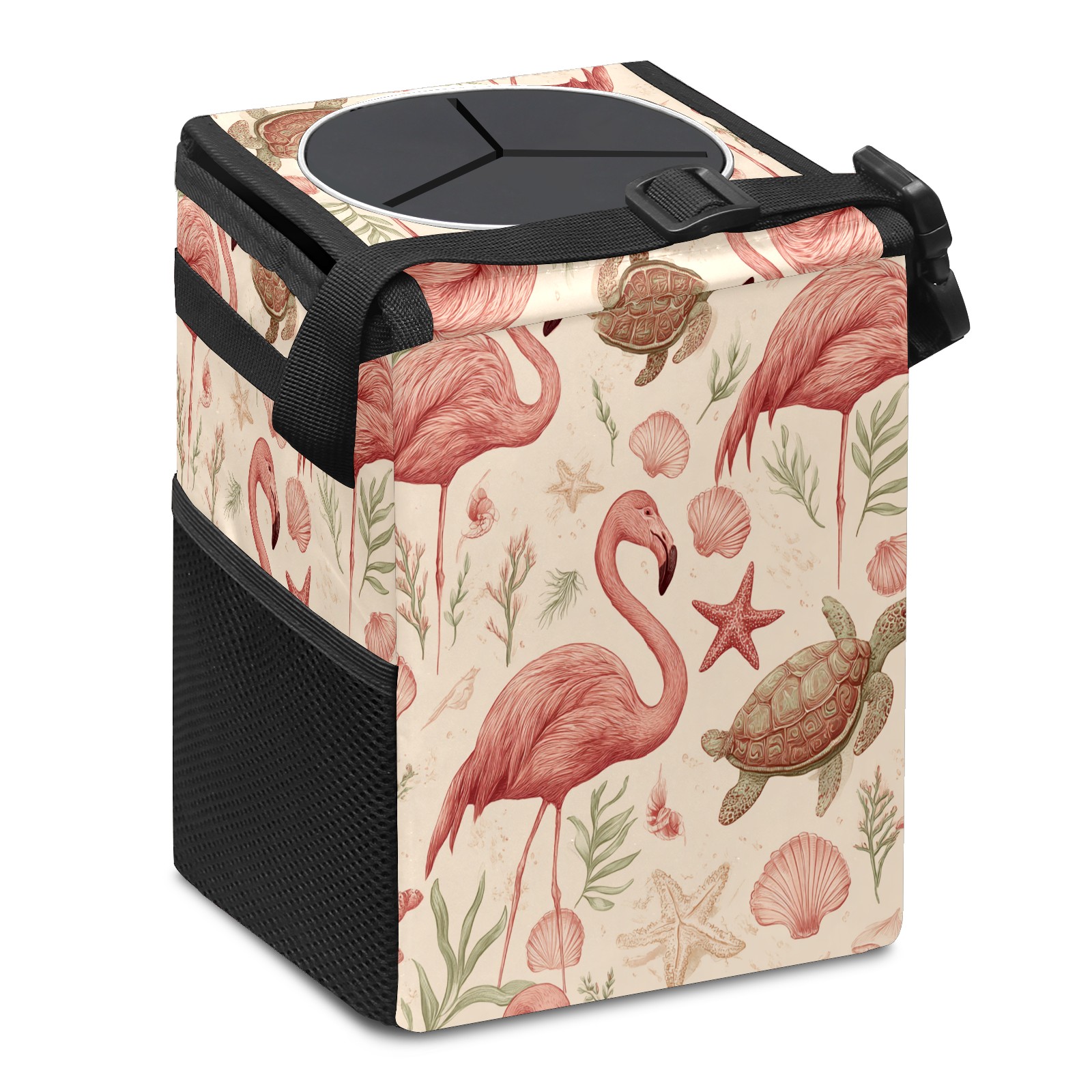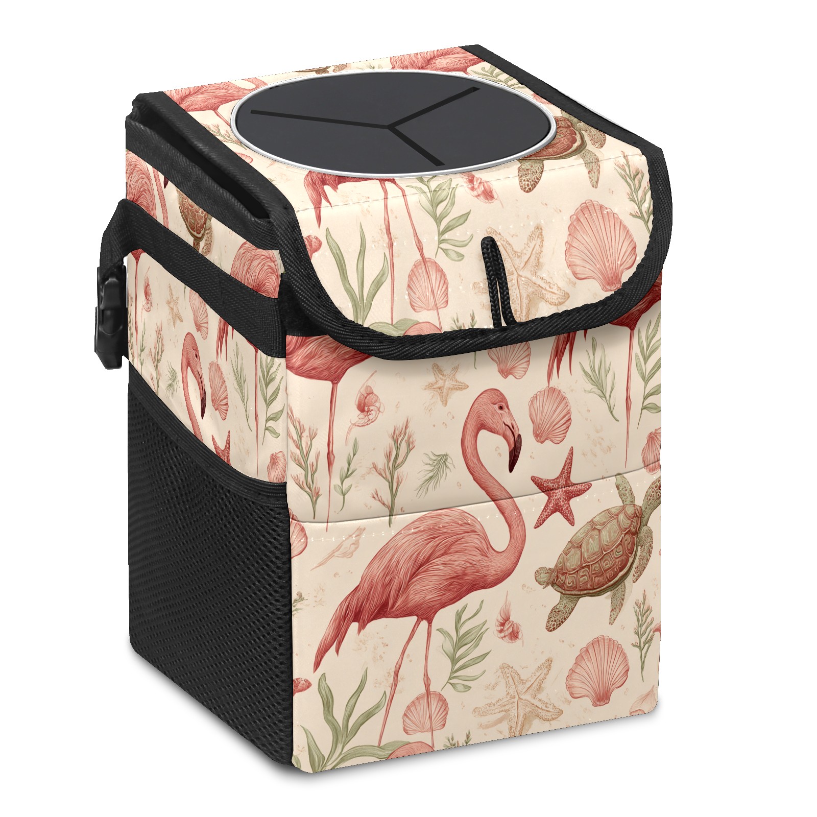 Universal Hanging Car Trash Can - Leakproof Design with Secure Lid | Fits SUV, Truck, Van | Front & Back Seat Friendly | Smart Automotive Accessory Flamingos Turtles Beige