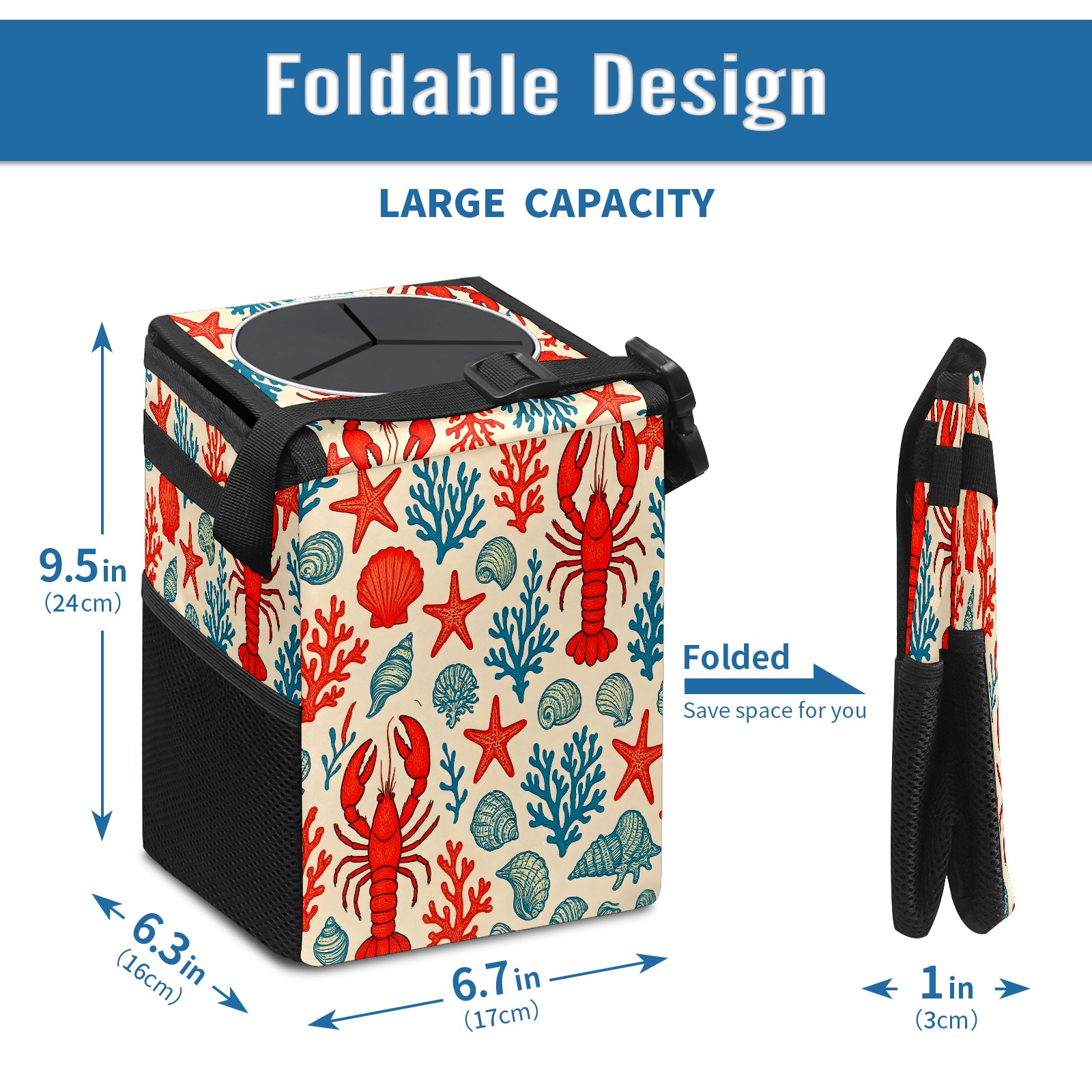• <p>This multi-functional car trash can features a stylish printed design, combining practicality and aesthetics. Made with high-quality twill fabric and woven straps, it's sturdy and durable. Dimensions: 24×17×16cm (9.5×6.7×6.3 inches). The top rubber opening lid makes disposing of trash easy, while side mesh pockets and a front pocket easily store snacks, mobile phones, and other small items. Equipped with a dual securing system of straps and elastic hooks, it can be flexibly hung behind headrests, inside armrest boxes, or hooked to the bottom of seat cushions. Not only can it be used as a trash can, but it can also function as a food or miscellaneous item storage box, achieving multiple uses. When not in use, it can be folded for storage, saving space and creating a clean and tidy environment for your car.<br></p>