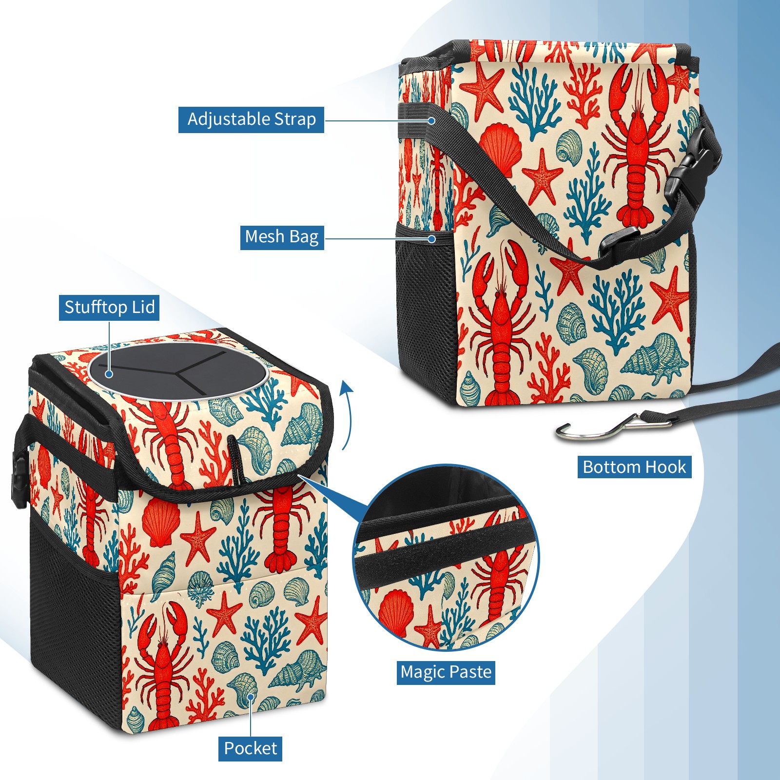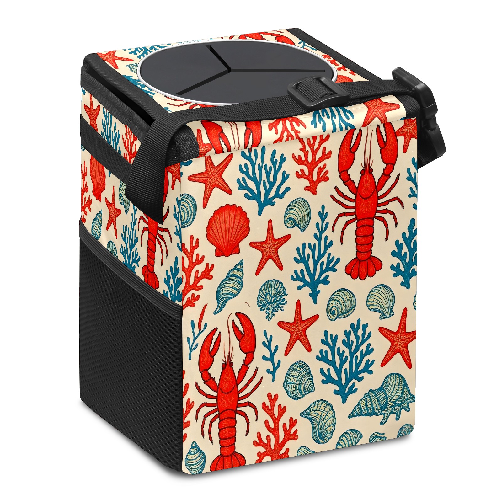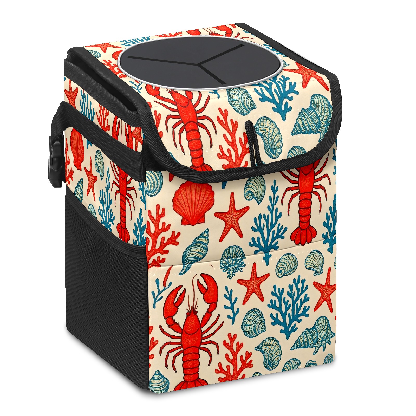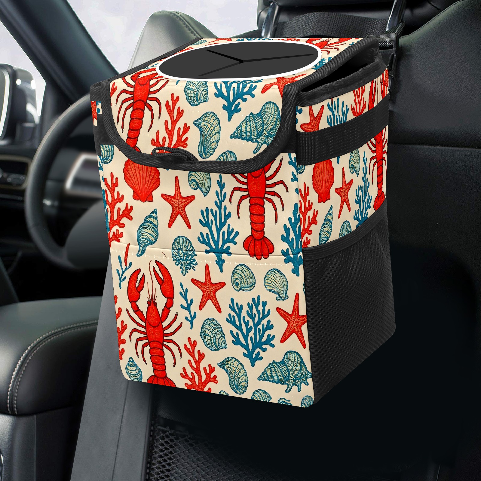 Universal Hanging Car Trash Can - Leakproof Design with Secure Lid | Fits SUV, Truck, Van | Front & Back Seat Friendly | Smart Automotive Accessory Lobster Starfish Red