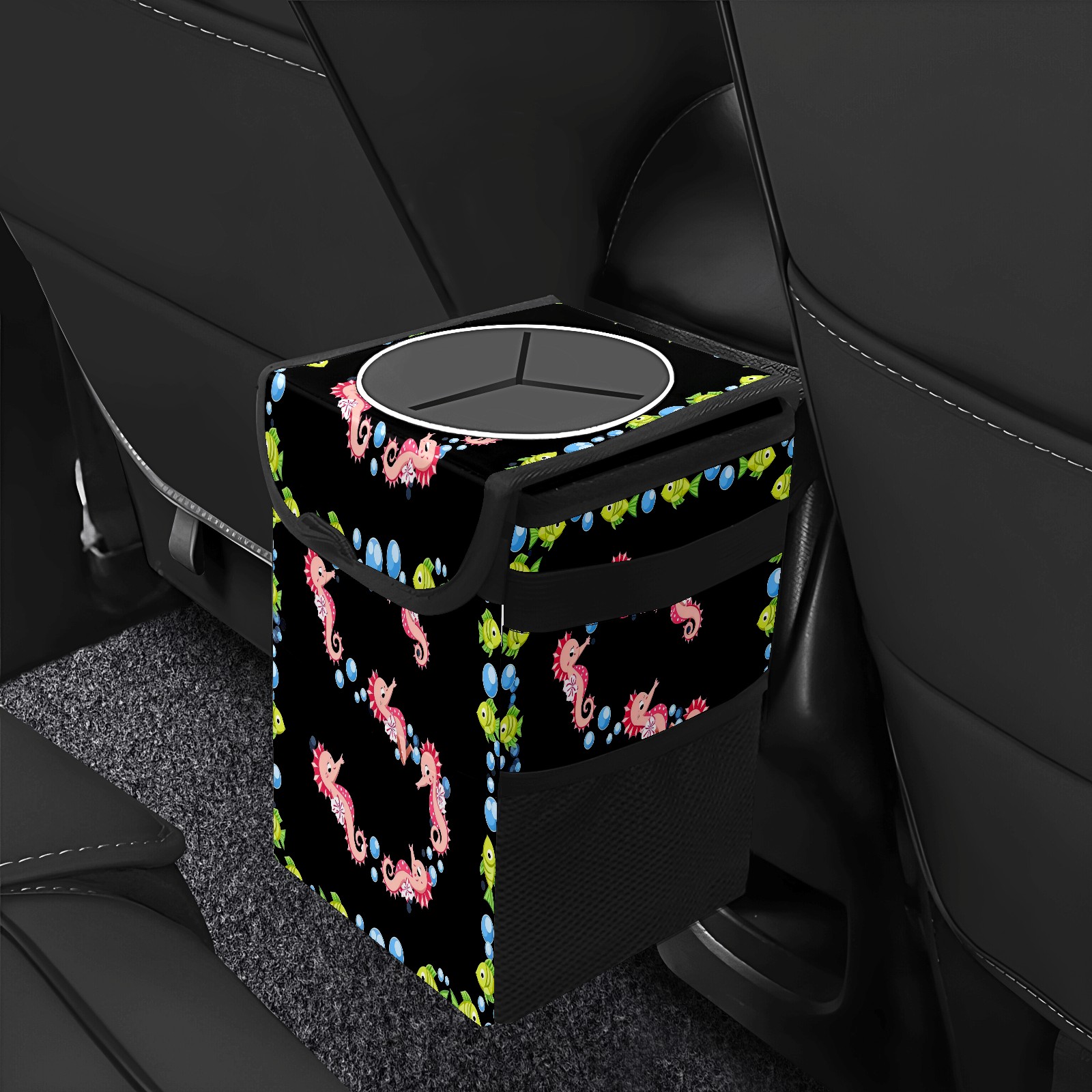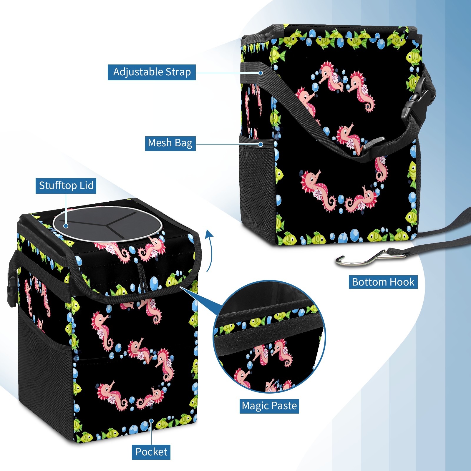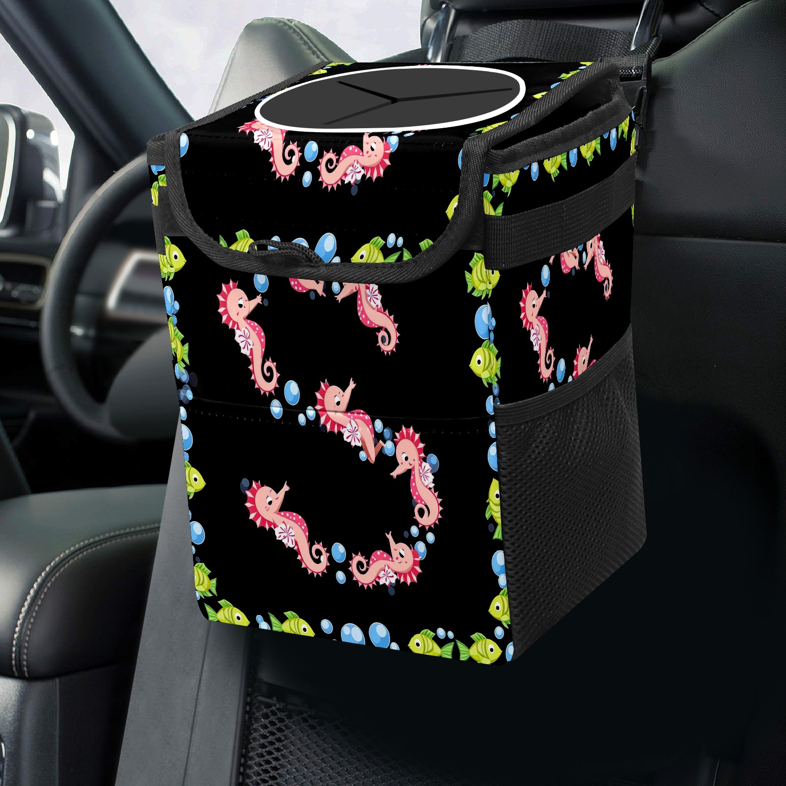 Universal Hanging Car Trash Can - Leakproof Design with Secure Lid | Fits SUV, Truck, Van | Front & Back Seat Friendly | Smart Automotive Accessory Seahorse Fish Black