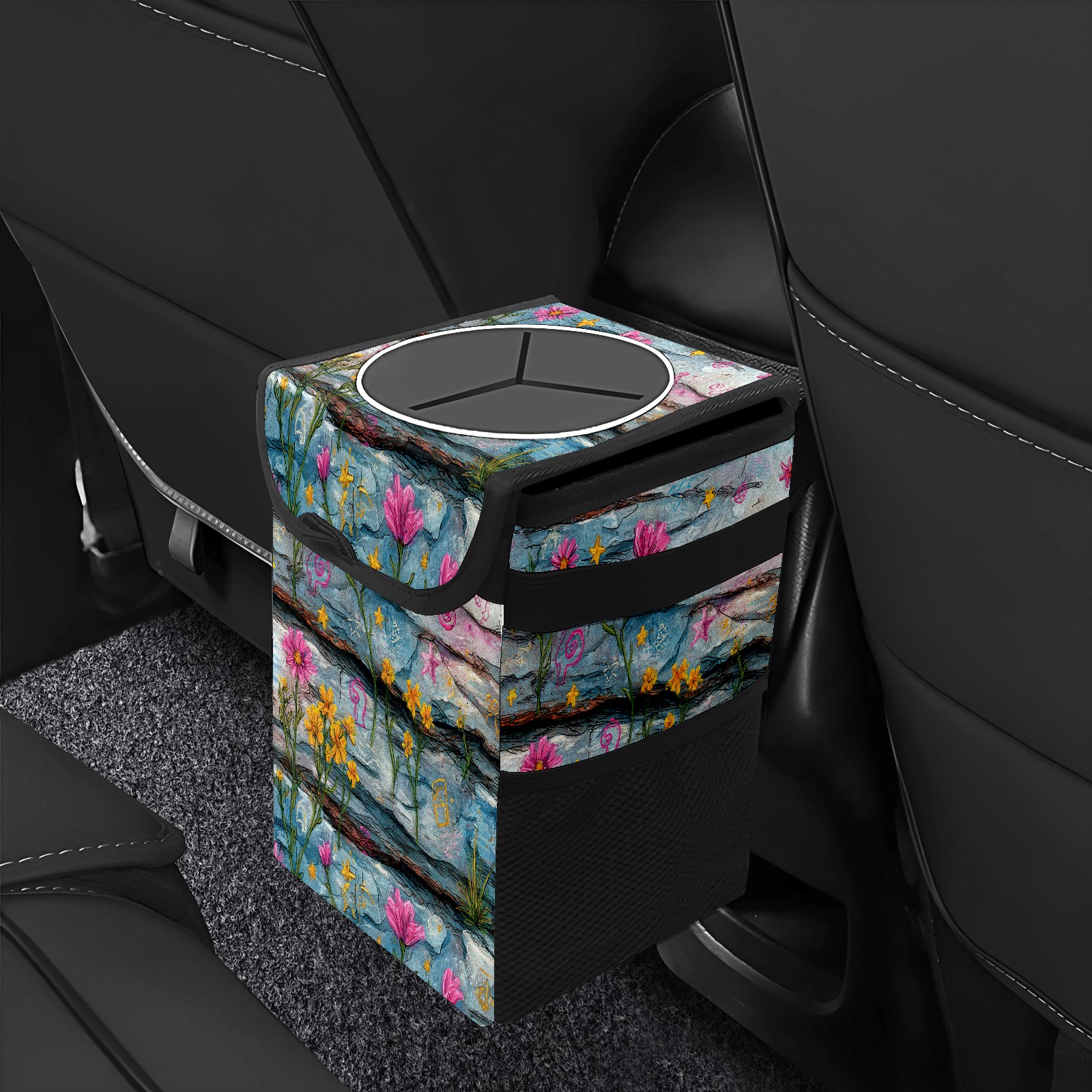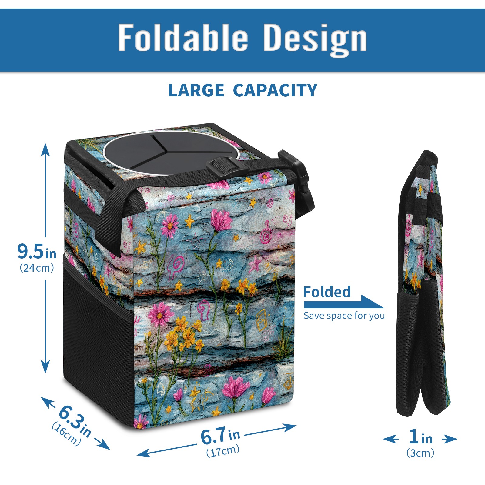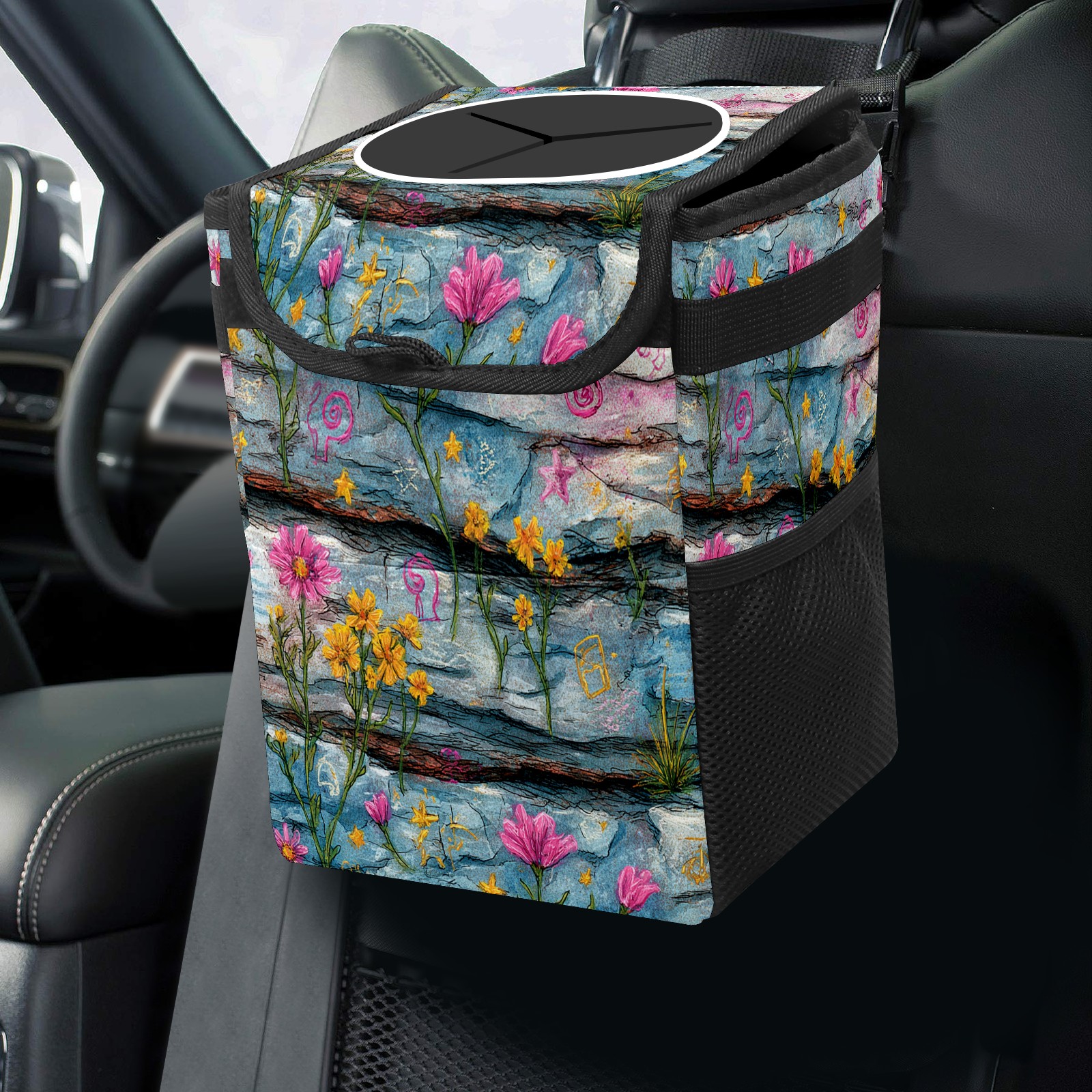 • <p>This multi-functional car trash can features a stylish printed design, combining practicality and aesthetics. Made with high-quality twill fabric and woven straps, it's sturdy and durable. Dimensions: 24×17×16cm (9.5×6.7×6.3 inches). The top rubber opening lid makes disposing of trash easy, while side mesh pockets and a front pocket easily store snacks, mobile phones, and other small items. Equipped with a dual securing system of straps and elastic hooks, it can be flexibly hung behind headrests, inside armrest boxes, or hooked to the bottom of seat cushions. Not only can it be used as a trash can, but it can also function as a food or miscellaneous item storage box, achieving multiple uses. When not in use, it can be folded for storage, saving space and creating a clean and tidy environment for your car.<br></p>