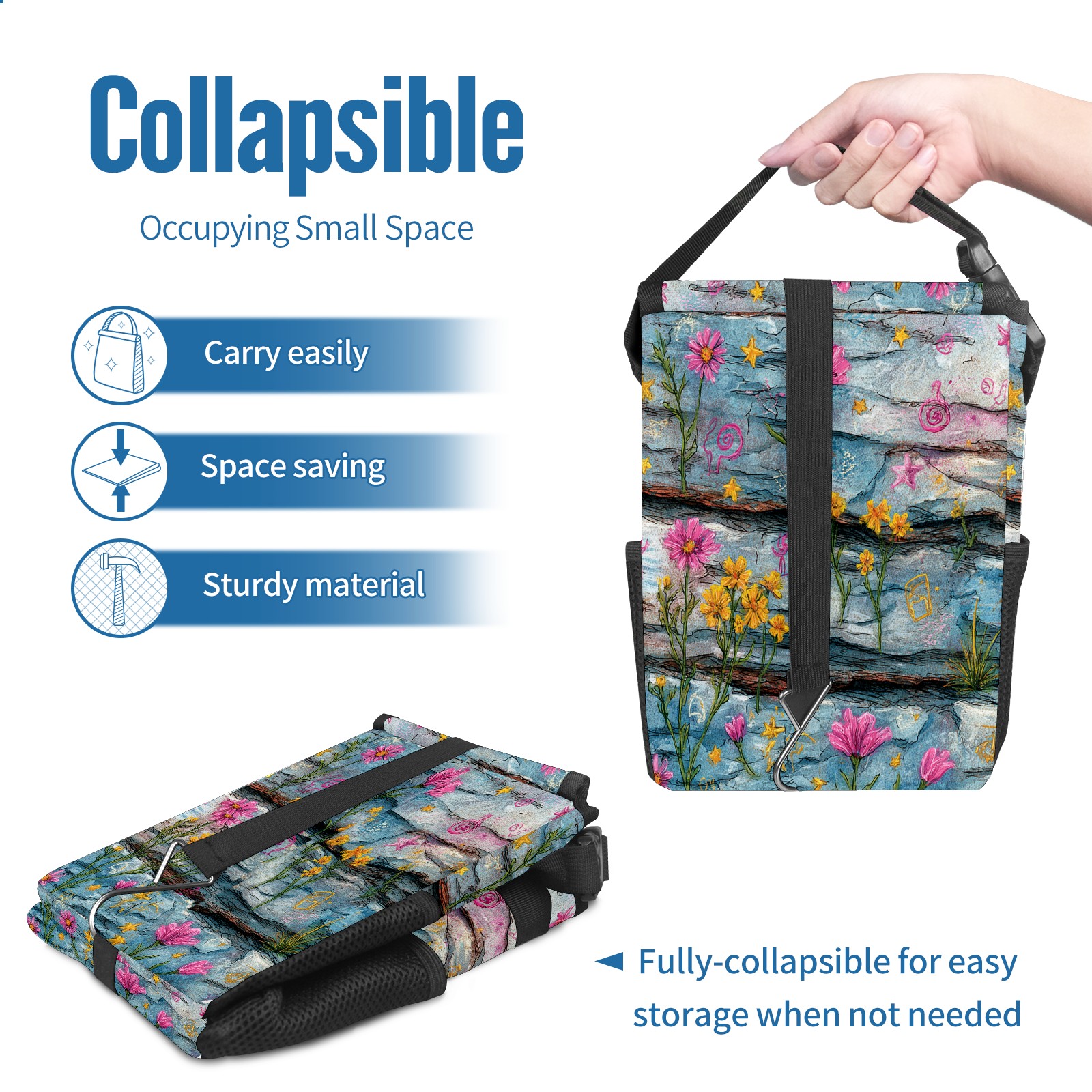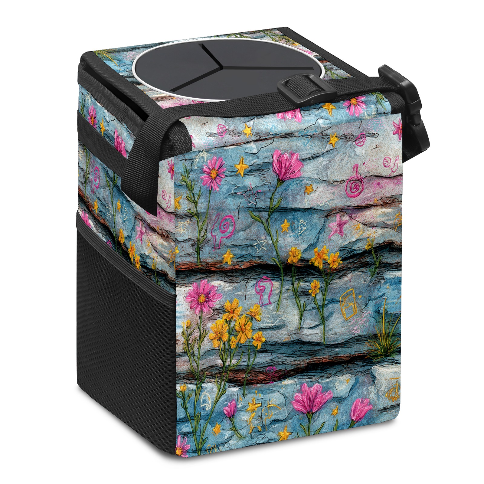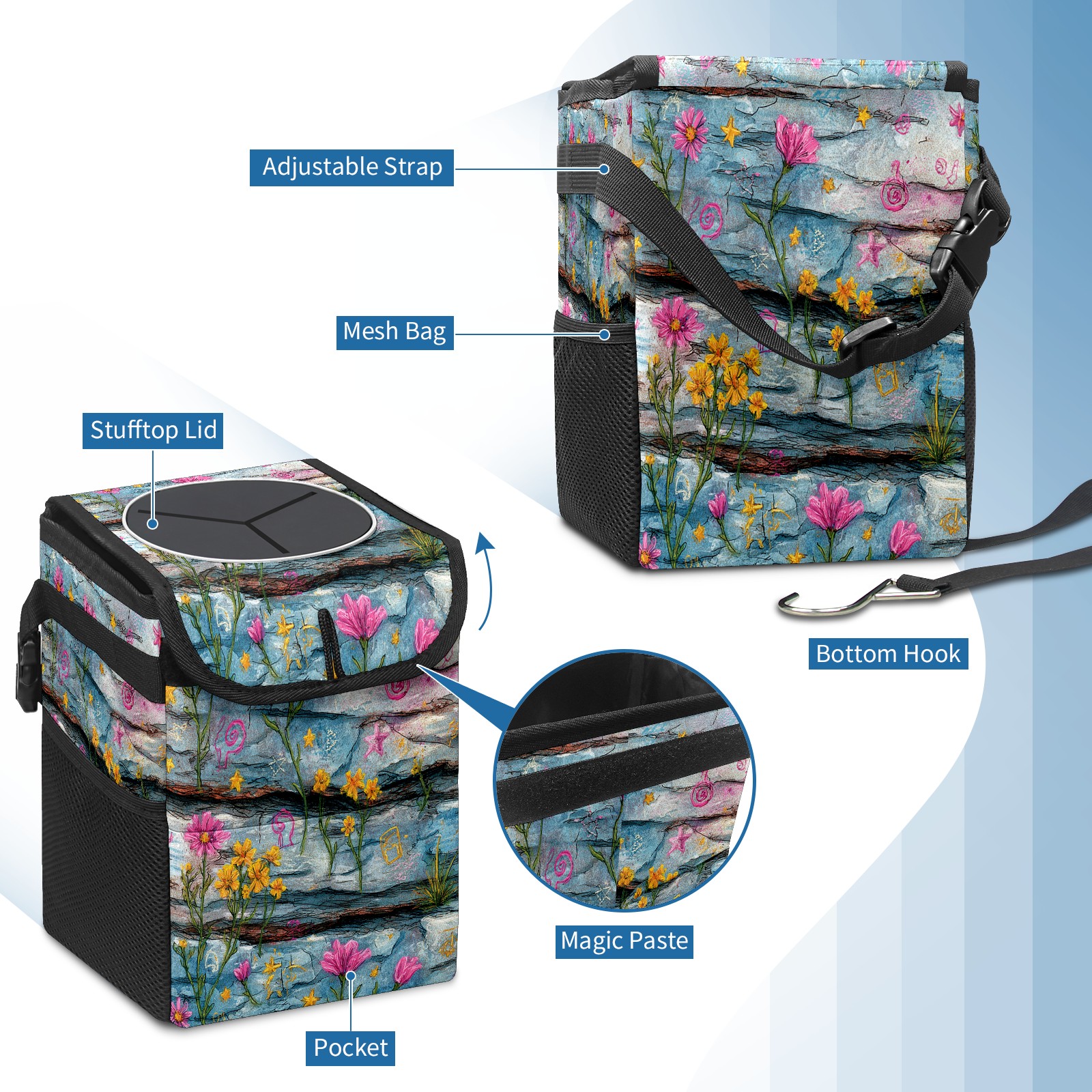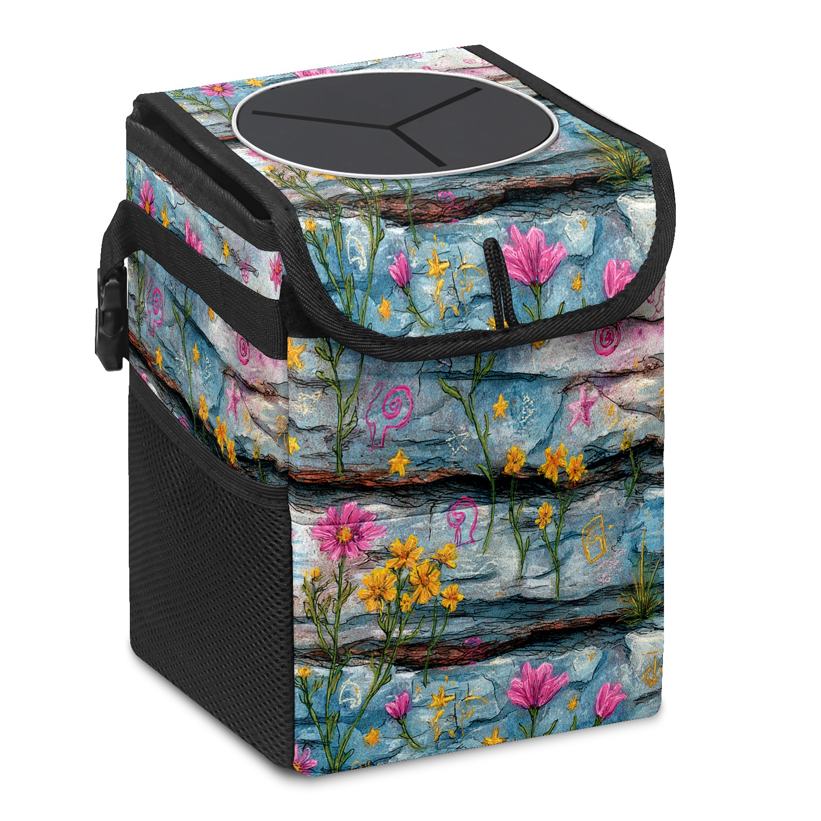 • <p>This multi-functional car trash can features a stylish printed design, combining practicality and aesthetics. Made with high-quality twill fabric and woven straps, it's sturdy and durable. Dimensions: 24×17×16cm (9.5×6.7×6.3 inches). The top rubber opening lid makes disposing of trash easy, while side mesh pockets and a front pocket easily store snacks, mobile phones, and other small items. Equipped with a dual securing system of straps and elastic hooks, it can be flexibly hung behind headrests, inside armrest boxes, or hooked to the bottom of seat cushions. Not only can it be used as a trash can, but it can also function as a food or miscellaneous item storage box, achieving multiple uses. When not in use, it can be folded for storage, saving space and creating a clean and tidy environment for your car.<br></p>