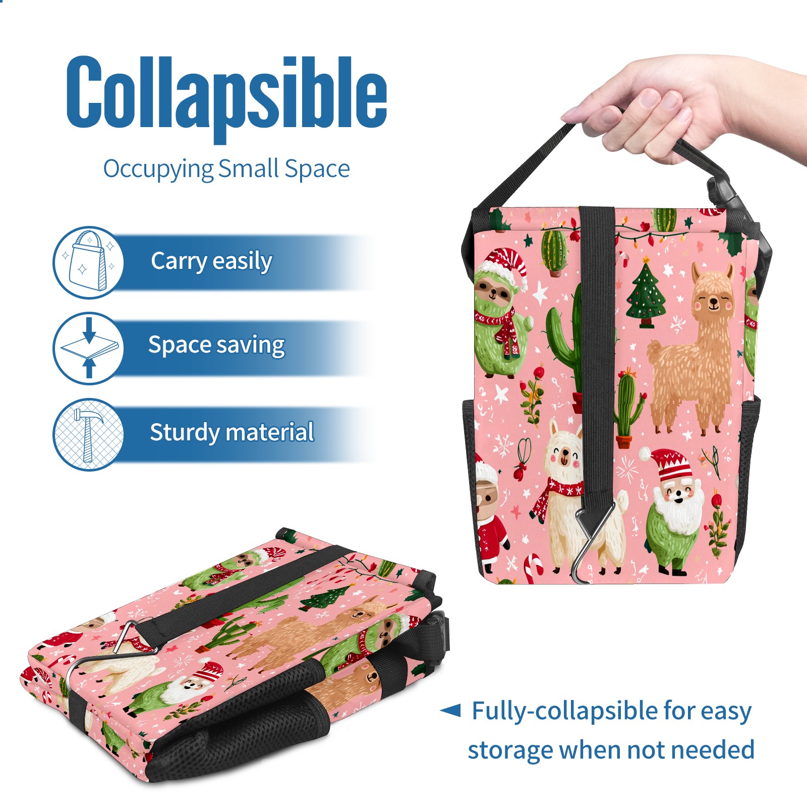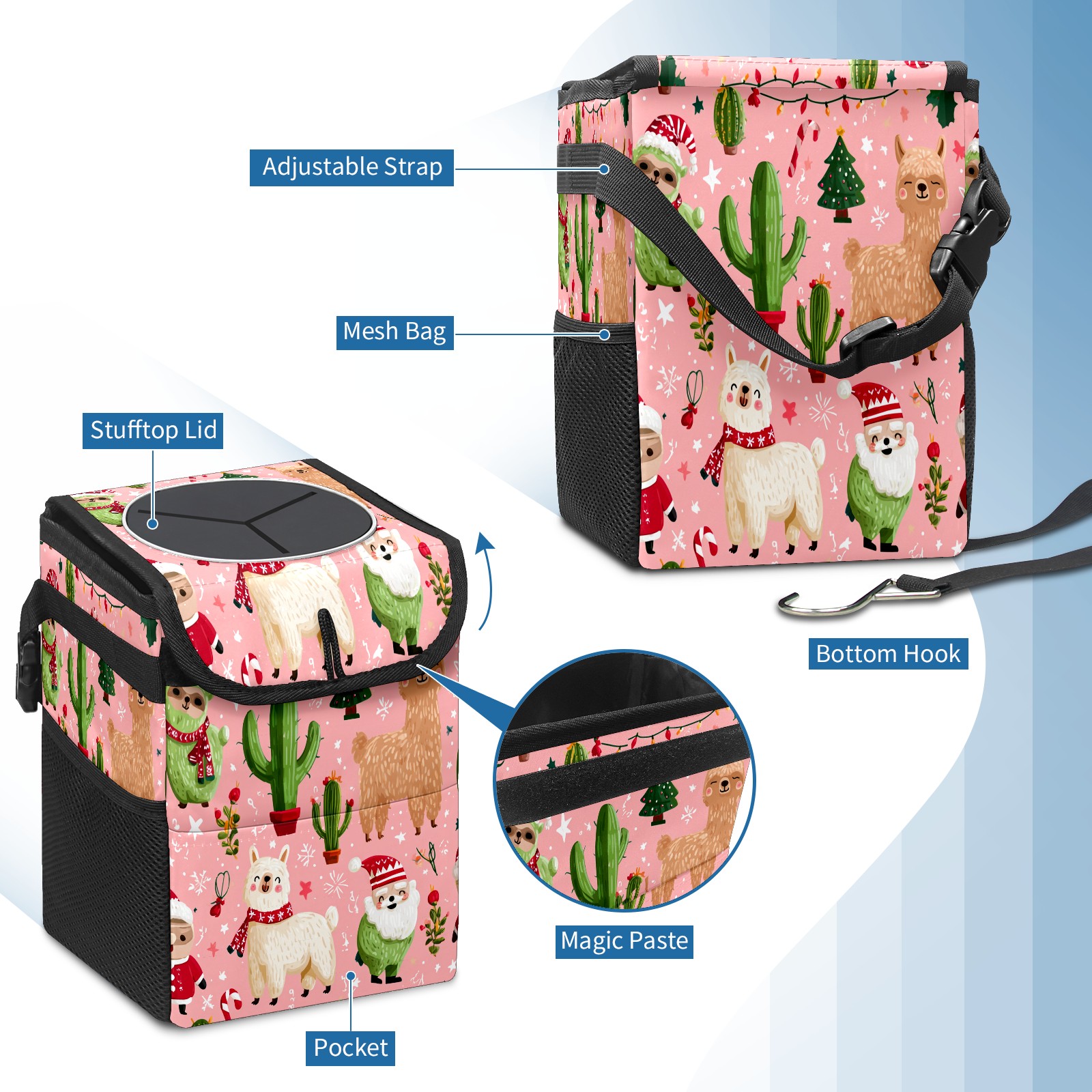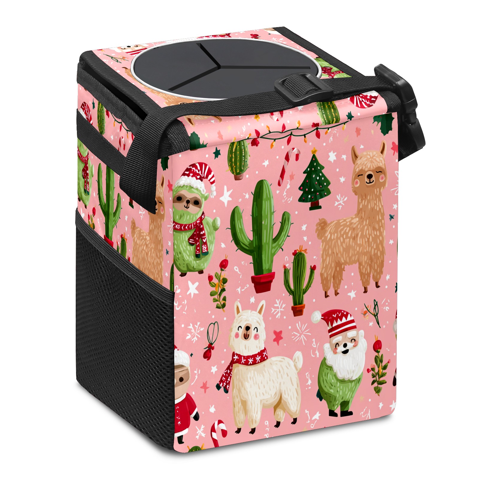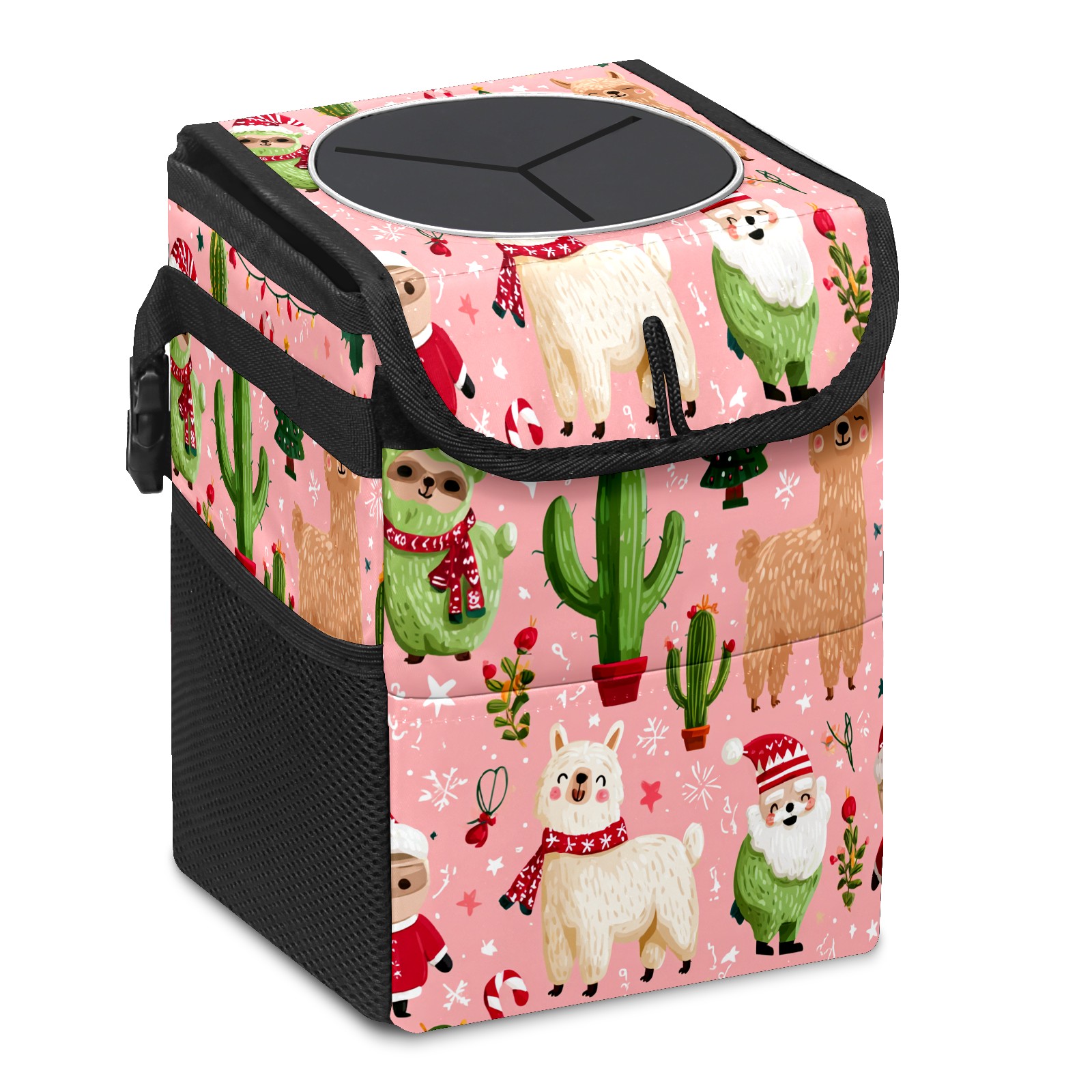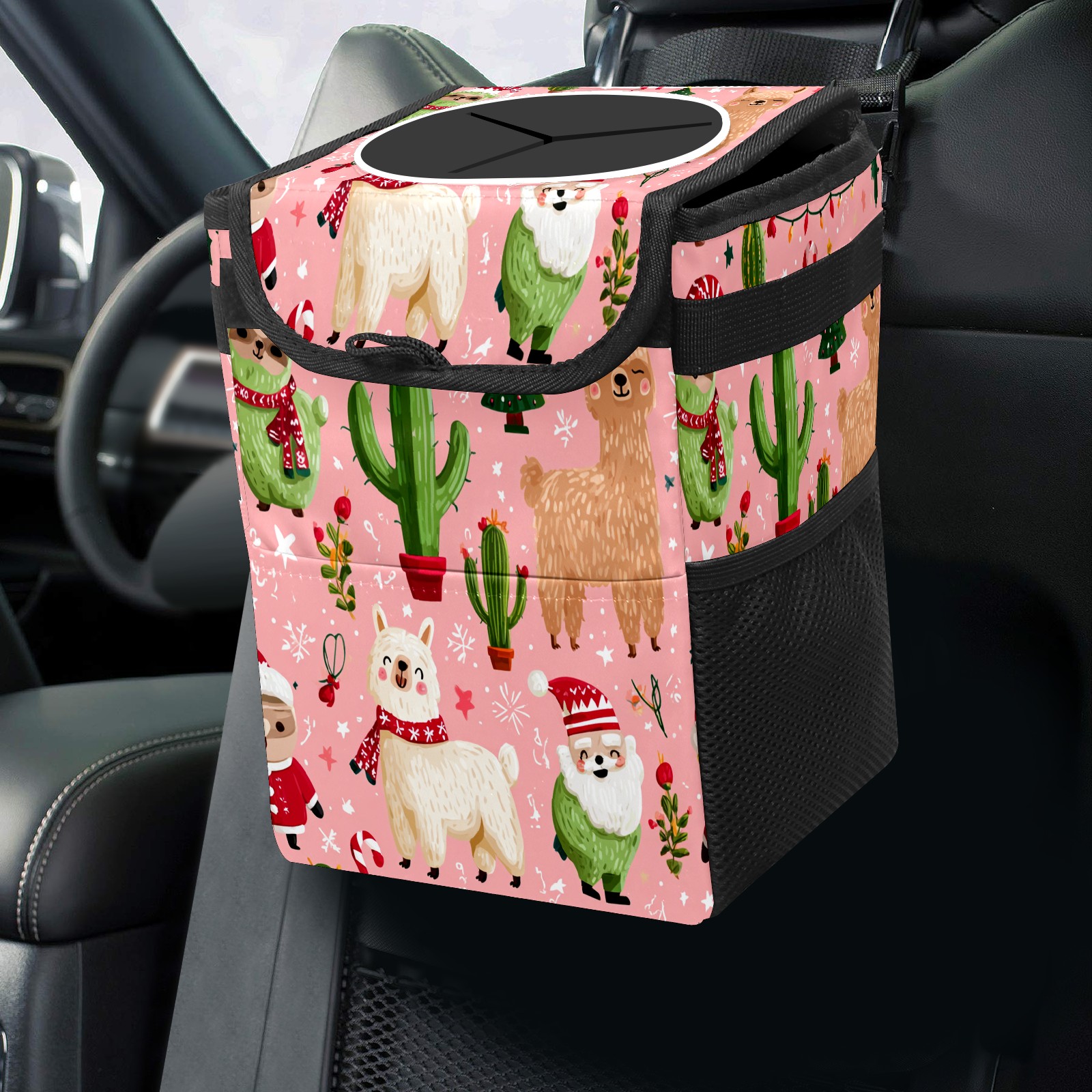Universal Hanging Car Trash Can - Leakproof Design with Secure Lid | Fits SUV, Truck, Van | Front & Back Seat Friendly | Smart Automotive Accessory Christmas Llama Pink