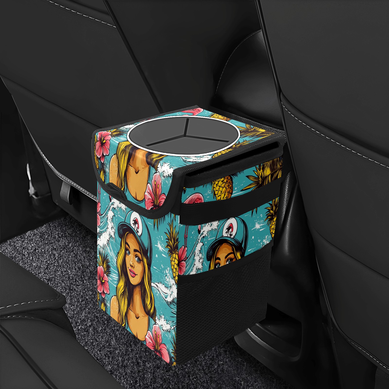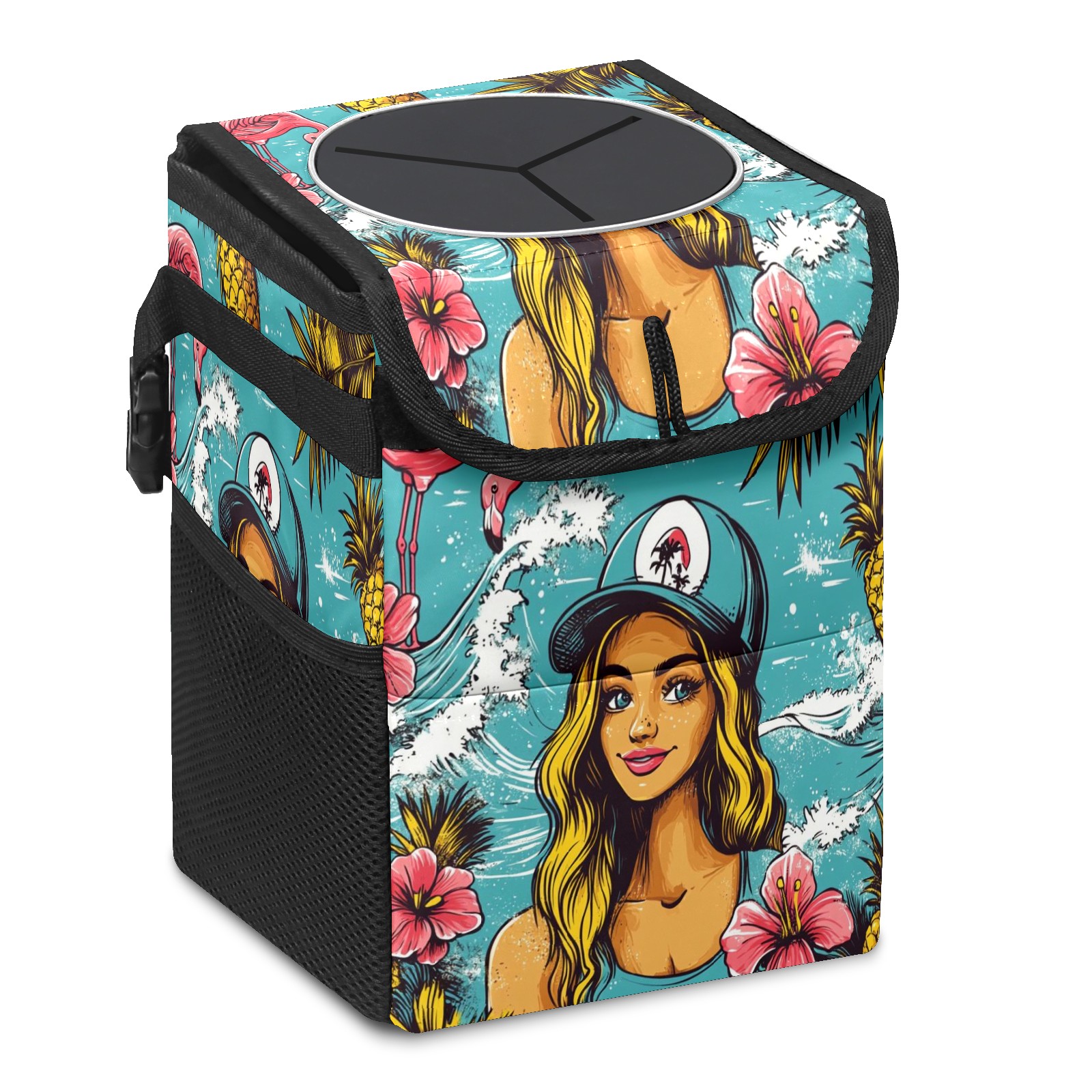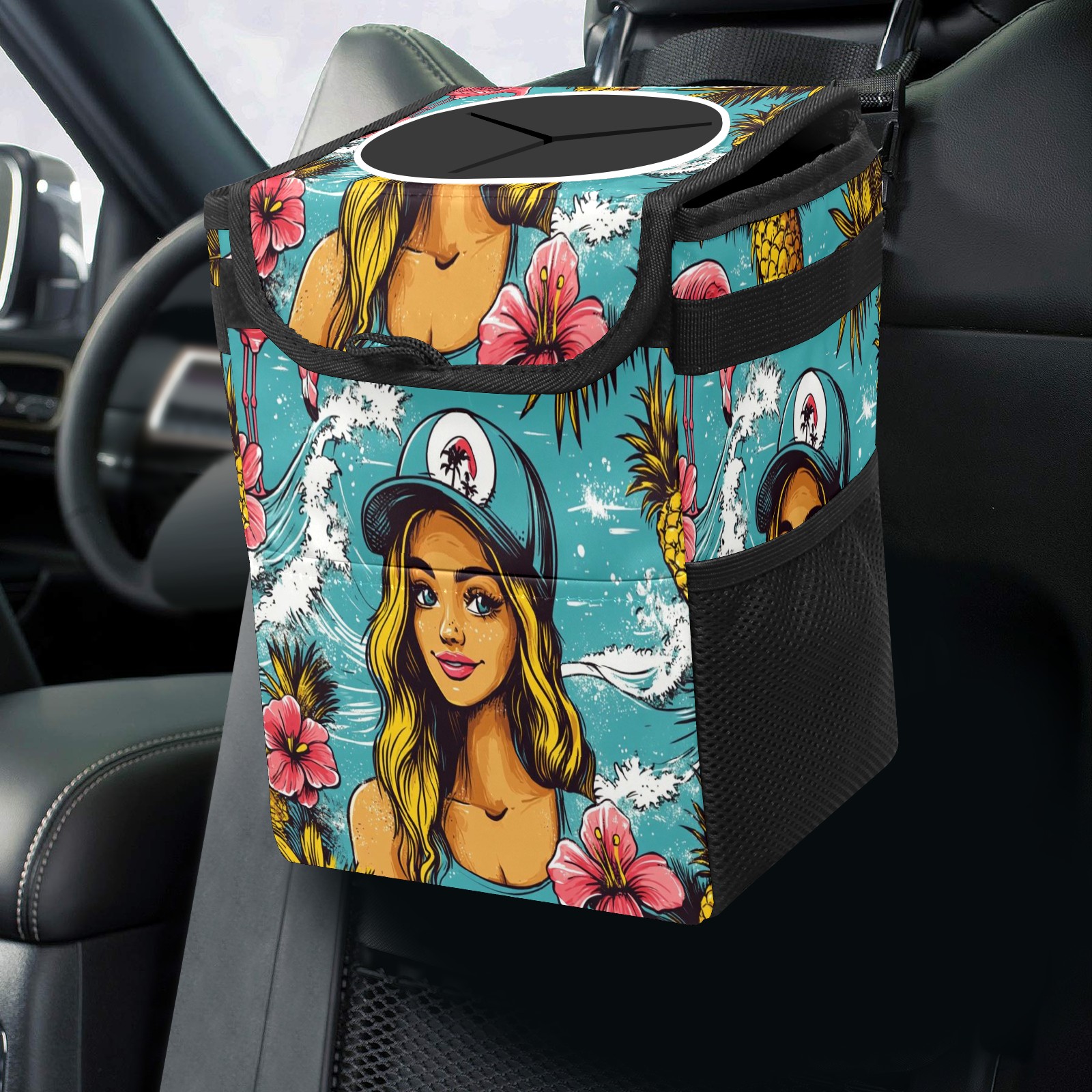 Universal Hanging Car Trash Can - Leakproof Design with Secure Lid | Fits SUV, Truck, Van | Front & Back Seat Friendly | Smart Automotive Accessory Tropical Blonde Girl