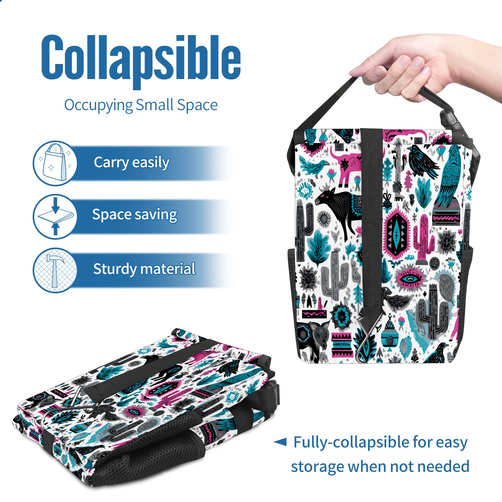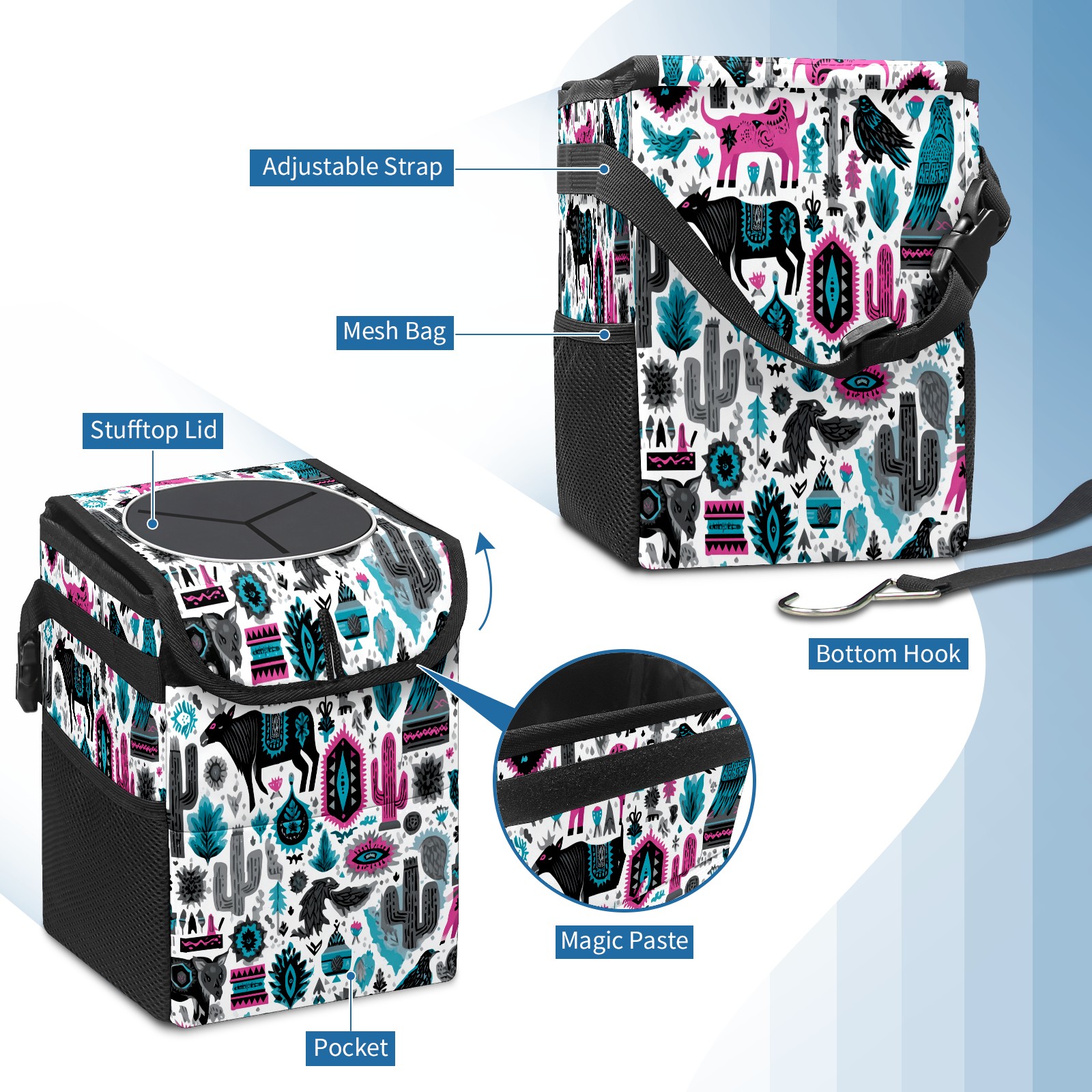 • <p>This multi-functional car trash can features a stylish printed design, combining practicality and aesthetics. Made with high-quality twill fabric and woven straps, it's sturdy and durable. Dimensions: 24×17×16cm (9.5×6.7×6.3 inches). The top rubber opening lid makes disposing of trash easy, while side mesh pockets and a front pocket easily store snacks, mobile phones, and other small items. Equipped with a dual securing system of straps and elastic hooks, it can be flexibly hung behind headrests, inside armrest boxes, or hooked to the bottom of seat cushions. Not only can it be used as a trash can, but it can also function as a food or miscellaneous item storage box, achieving multiple uses. When not in use, it can be folded for storage, saving space and creating a clean and tidy environment for your car.<br></p>