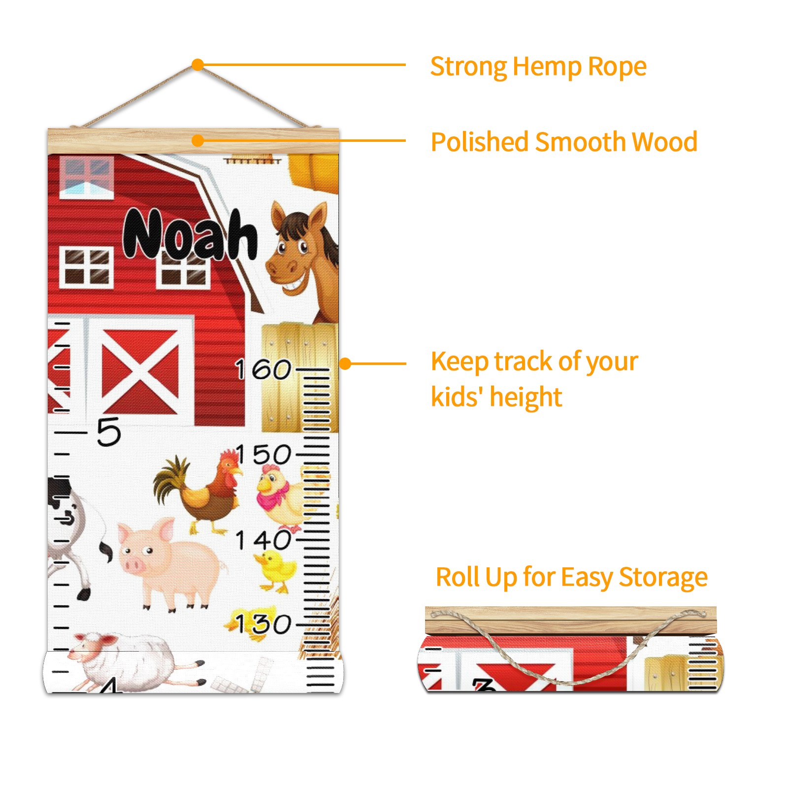 Personalized Kids Name Growth Chart Ruler for Wall Wood Frame Canvas Height Measure Chart 13.4x56 in Hanging Growth Chart Farm Animals Horse Red Barn12.1-1 Boys Girls Room Decor