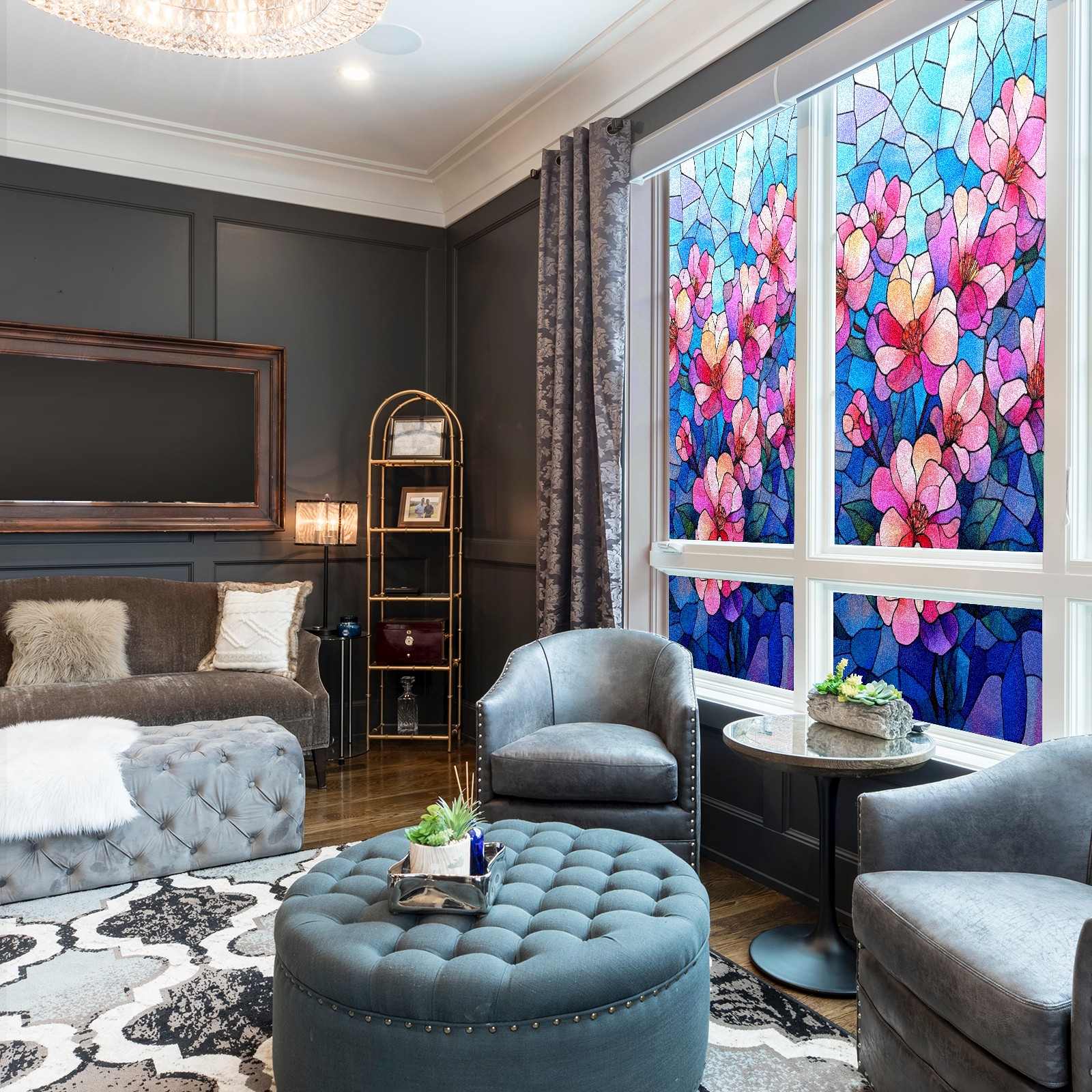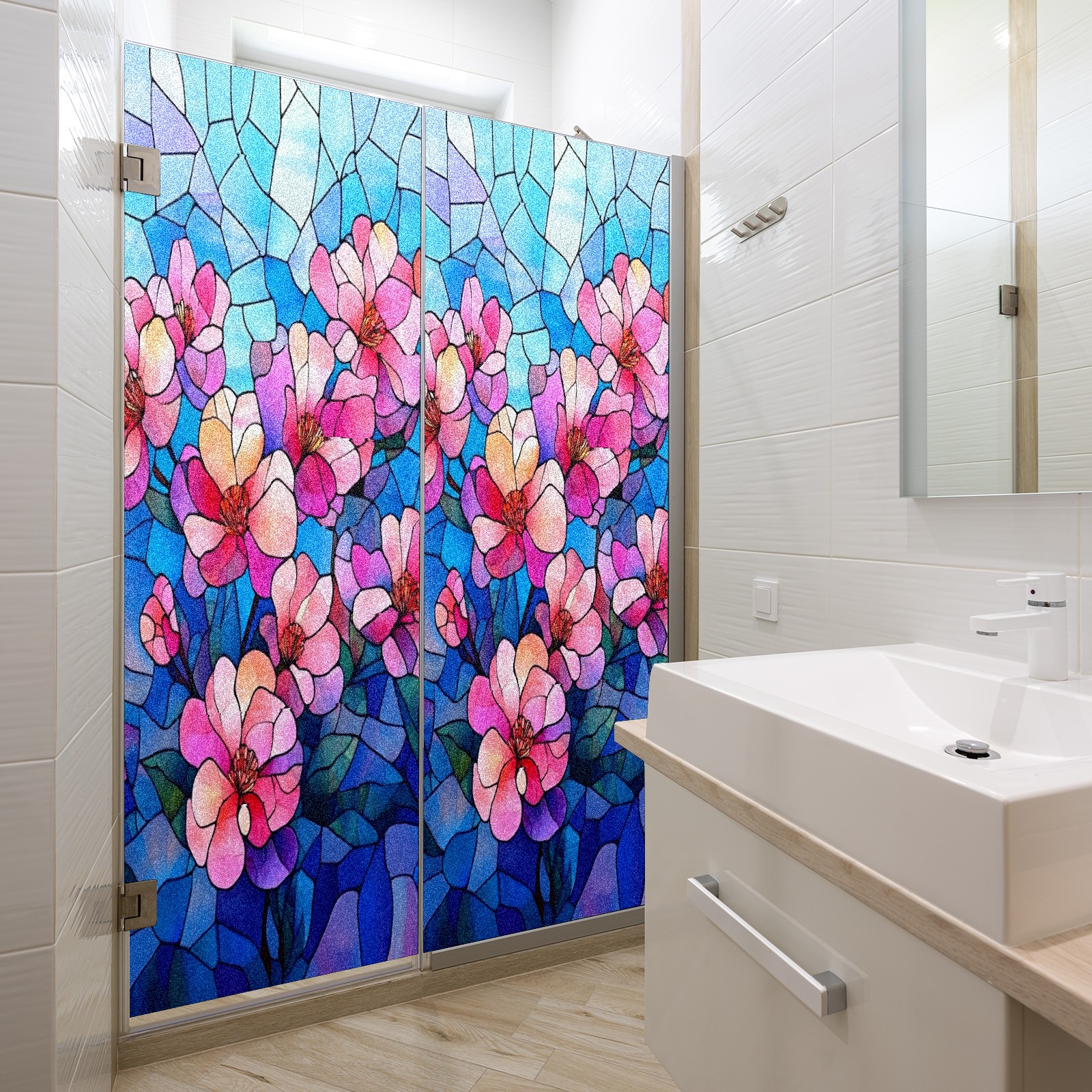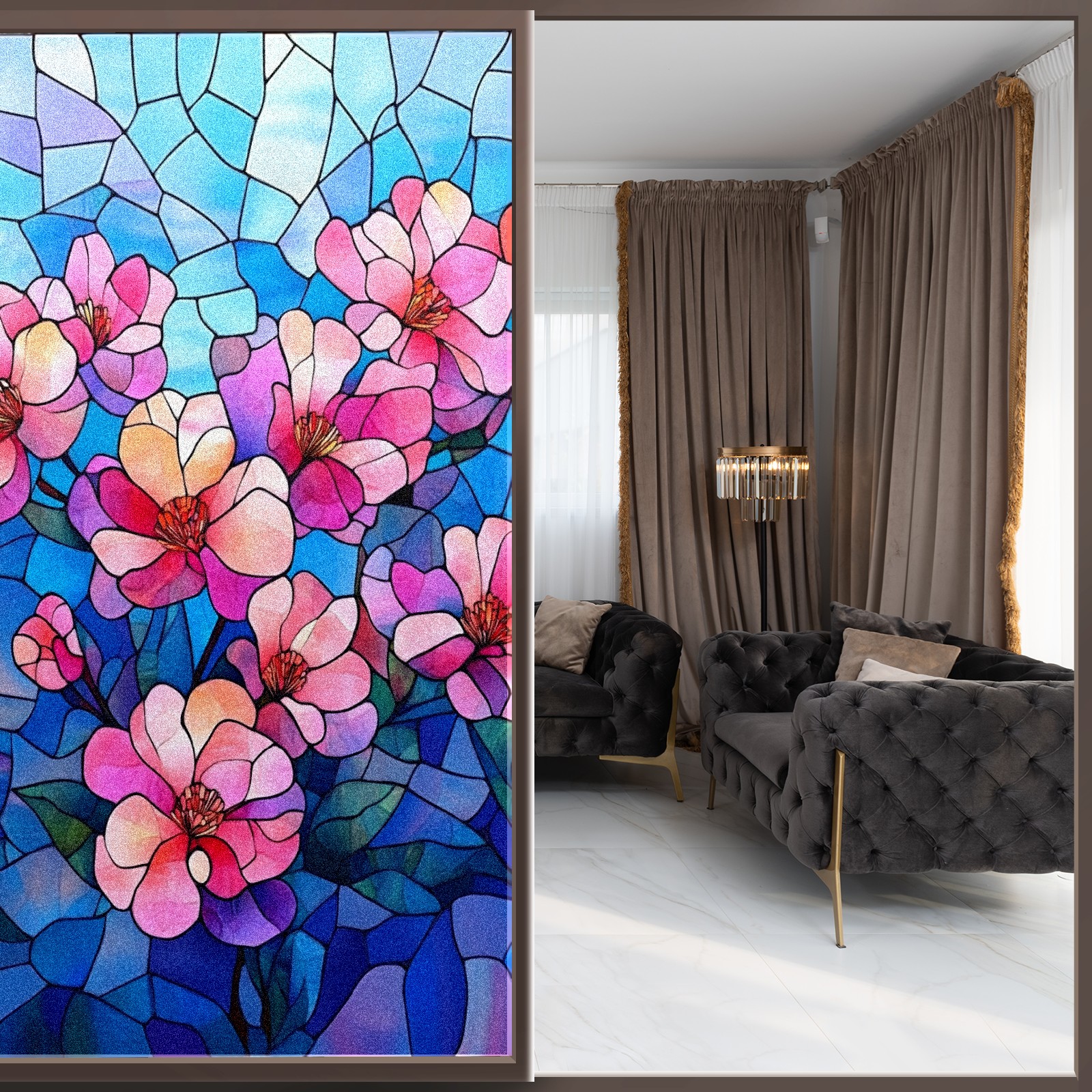 Stained Glass Window Film - Decorative Privacy Film for Windows, Peel and Stick Window Film for Bathroom/Office/Shower, Reusable and Easy to Cut 17.7"x23.6" (Pink Flowers)
