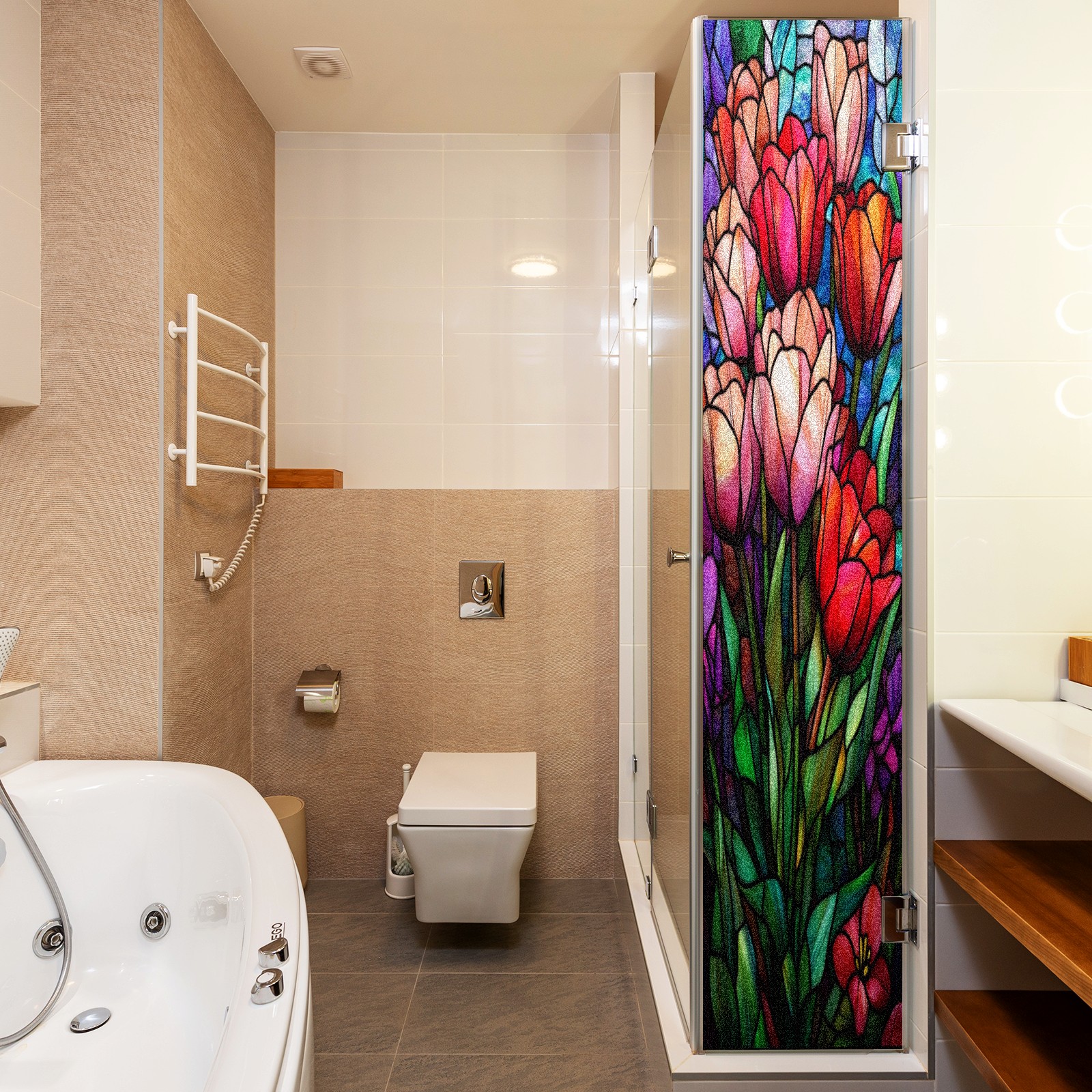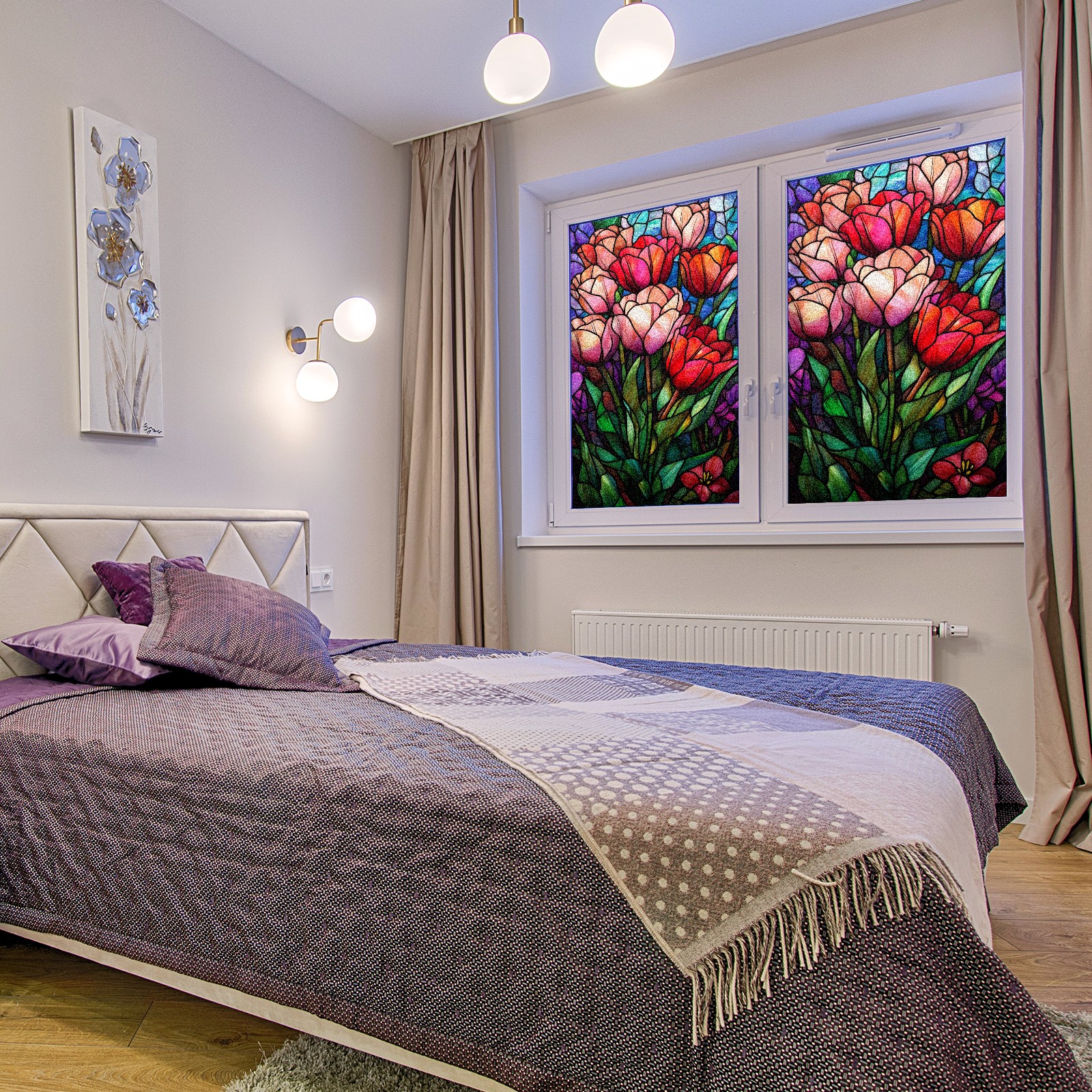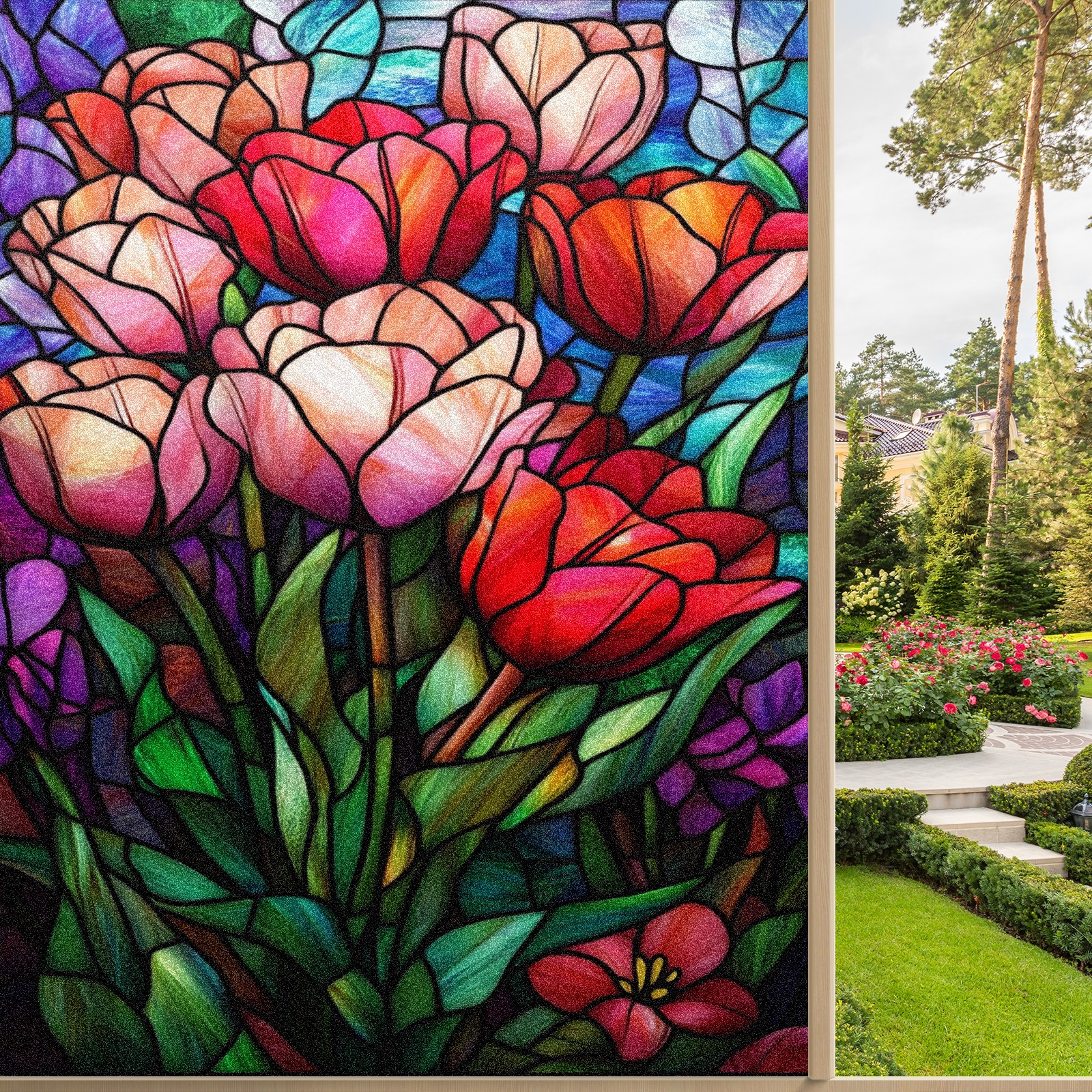 Stained Glass Window Film - Decorative Privacy Film for Windows, Peel and Stick Window Film for Bathroom/Office/Shower, Reusable and Easy to Cut 17.7"x23.6" (Tulips)