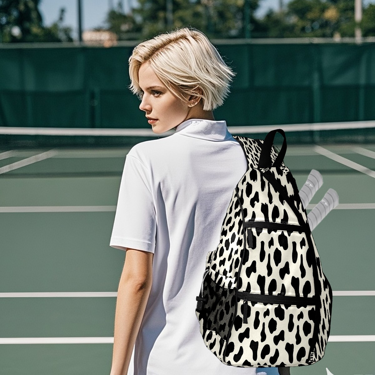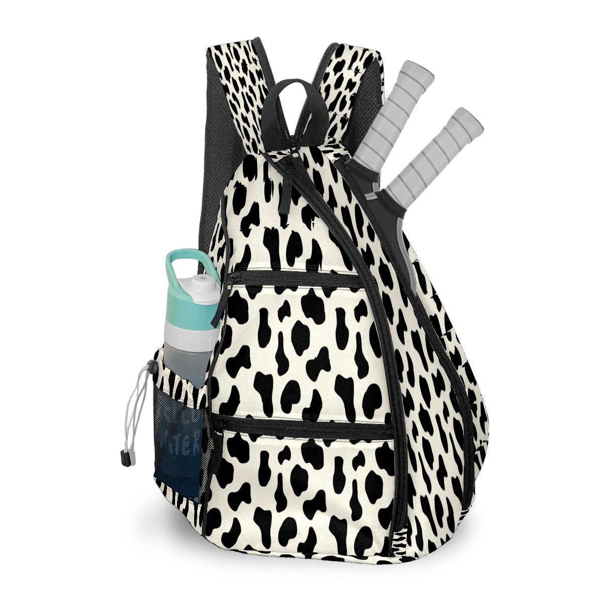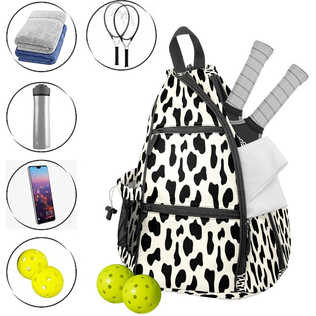 Pickleball Bags for Men Women Backpack with Large Capacity Lightweight Adjustable Pickle ball Sling Bag Hold Paddles, Balls, Accessories Black Cow Animal Print