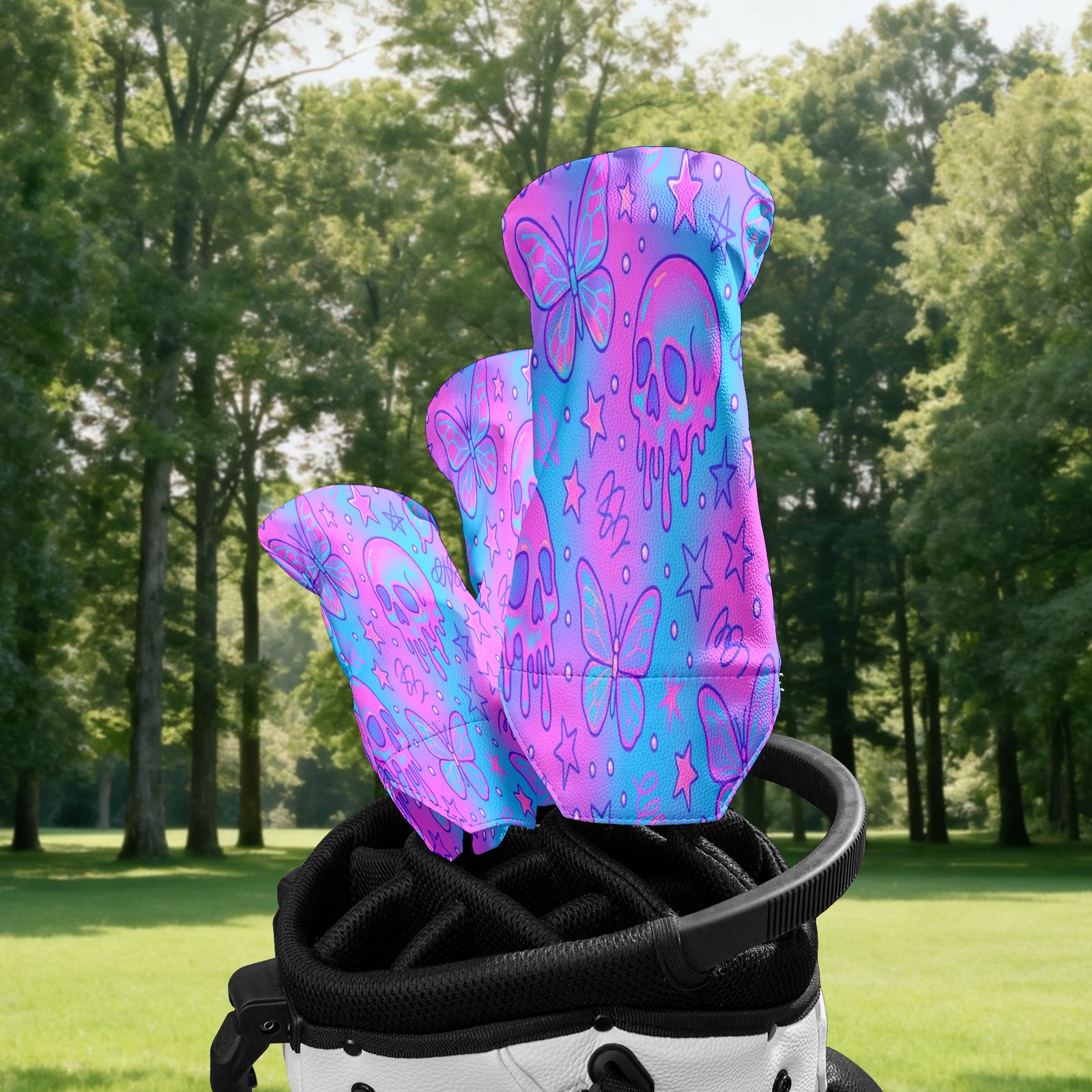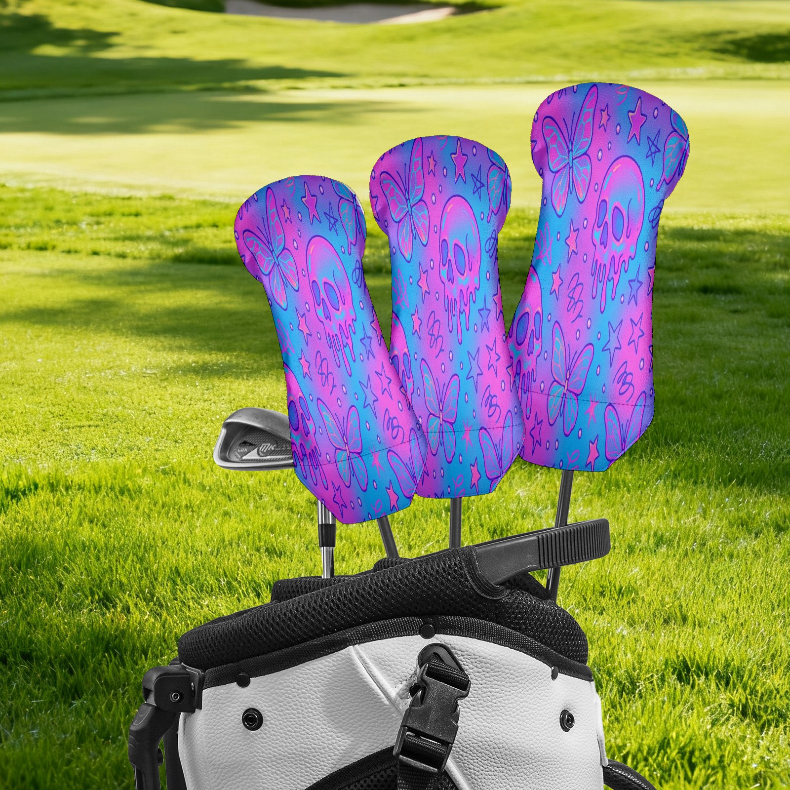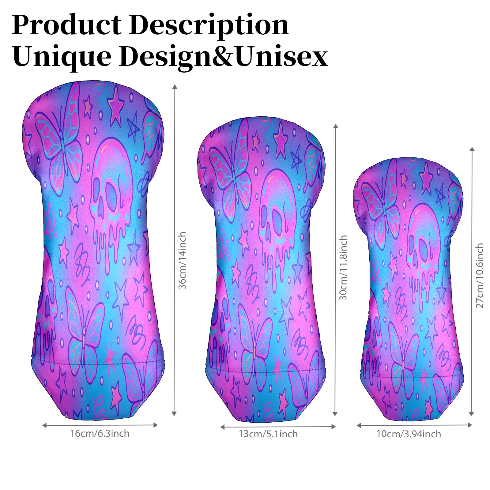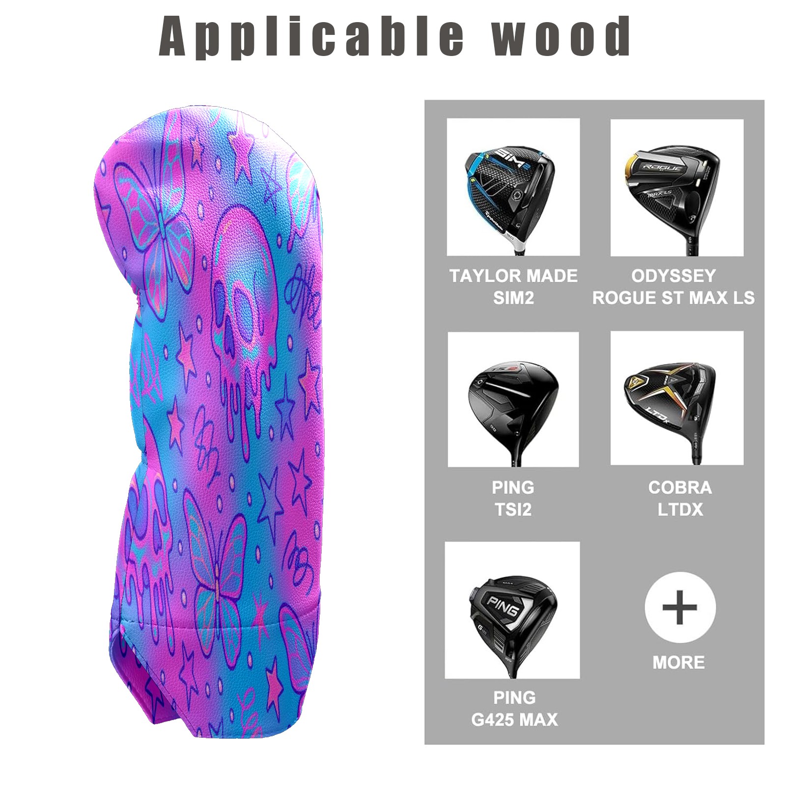 Counullo Golf Club Covers Pink Skulls Butterflies - Driver/Fairway/Hybrid/3 Wood Headcover, Premium PU Leather Soft Velvet Lining, Waterproof Golf Gift for Enthusiasts