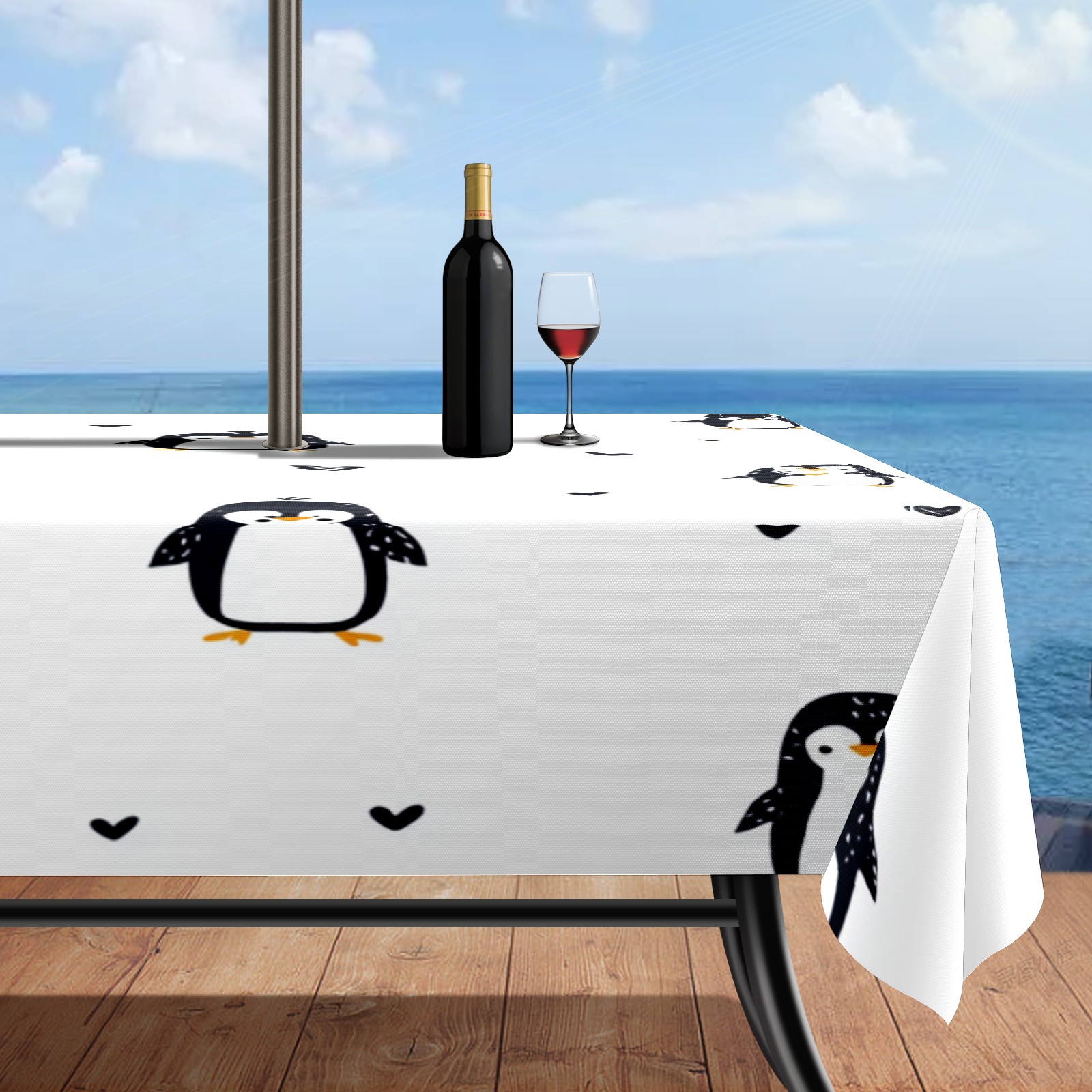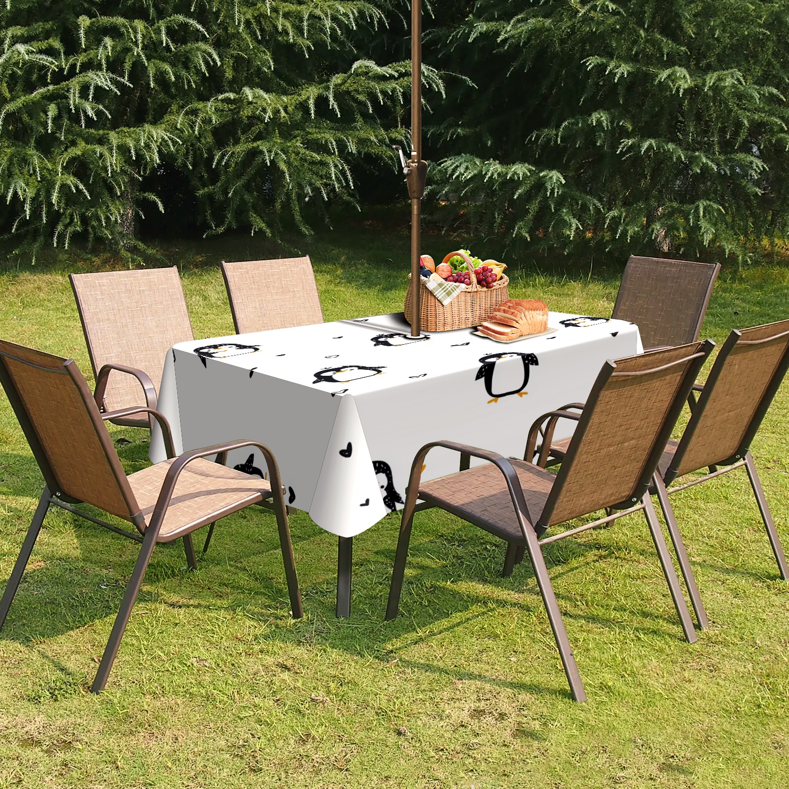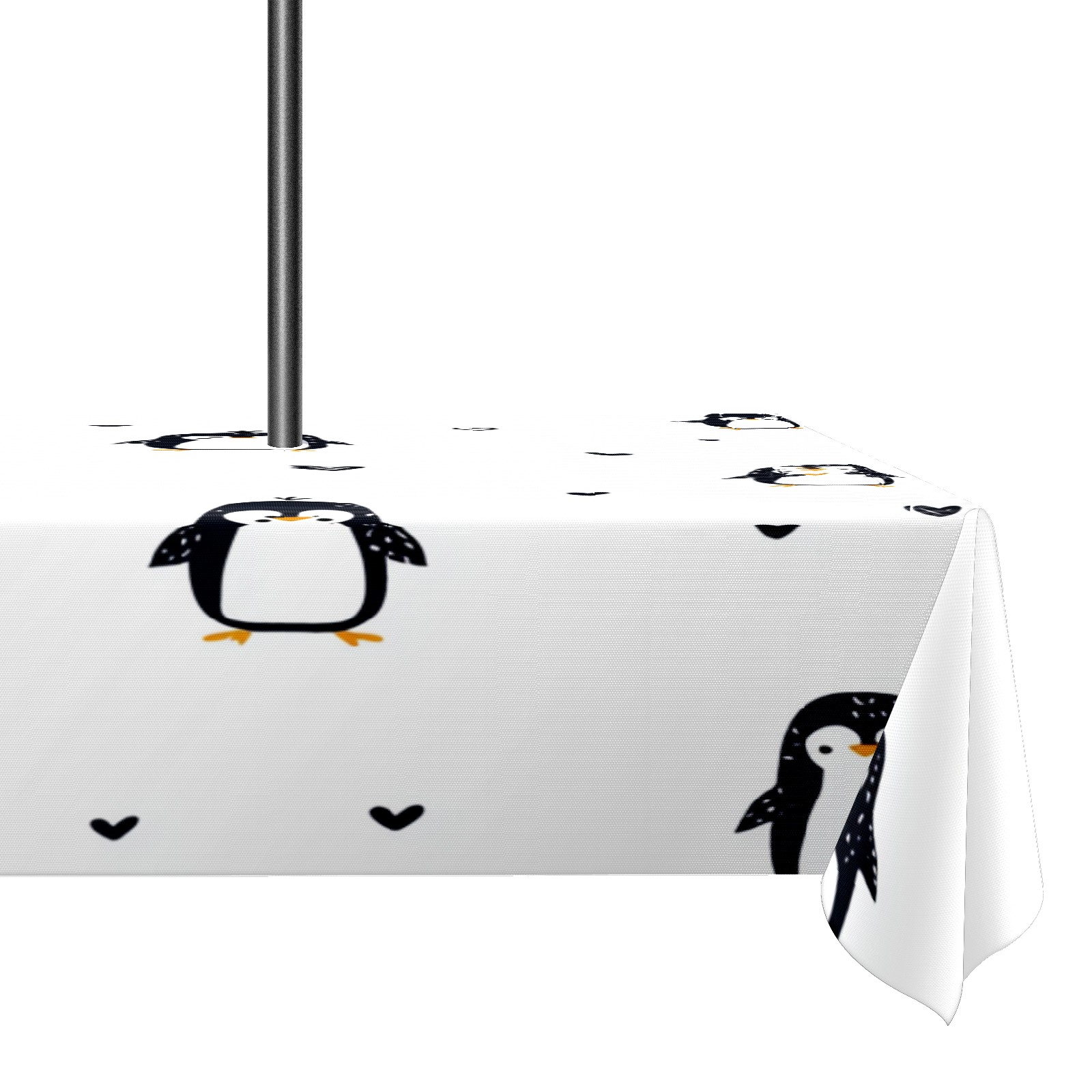 Waterproof Umbrella Hole Tablecloth Square, 52x70 Inch Rectangle Polyester Table Cover Zippered Design for Outdoor/Indoor Use White Penguin Pattern