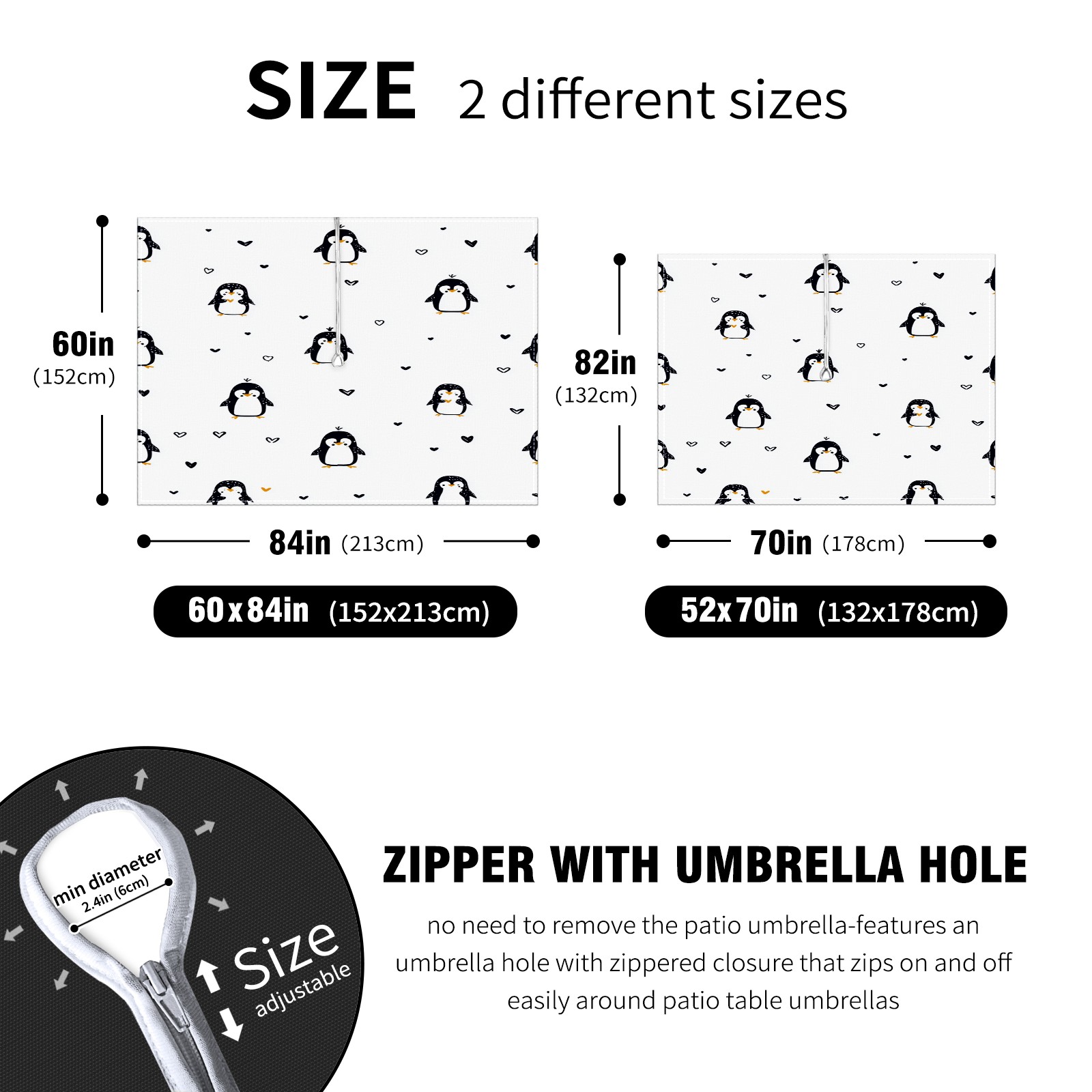 • <p>This premium polyester tablecloth features an innovative umbrella-hole zipper design for easy installation without disassembling a parasol, and offers 2.4-inch adjustable umbrella hole size. Available in 52x70 inch and 60x84 inch sizes, it perfectly fits various dining tables. Its waterproof and stain-resistant properties effectively protect against spills of coffee, juice, rain, and other liquids, keeping your table looking brand new. Daily maintenance is simple; stains wipe away easily. It is machine washable on a gentle cycle; wash in cold water and do not bleach.<br></p>