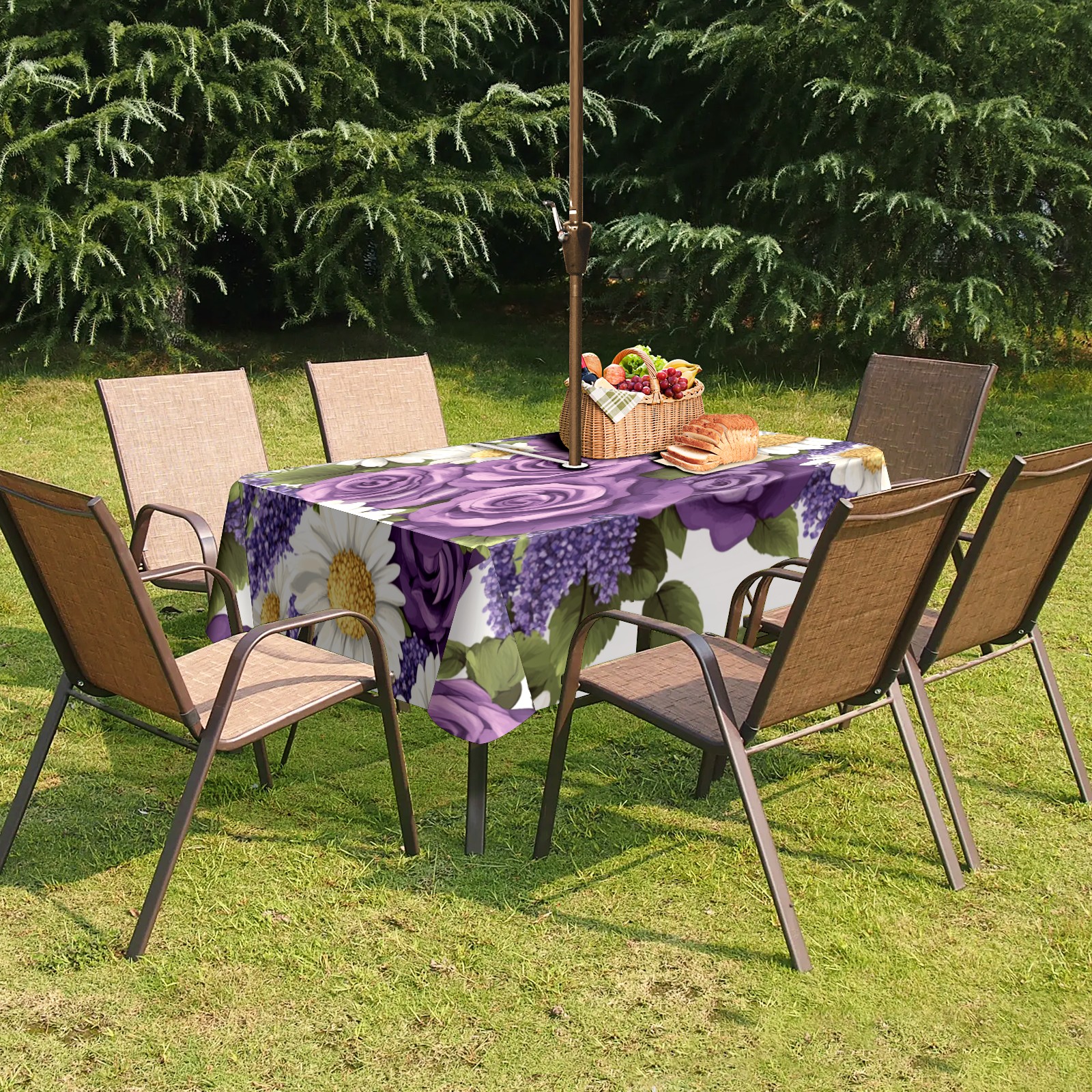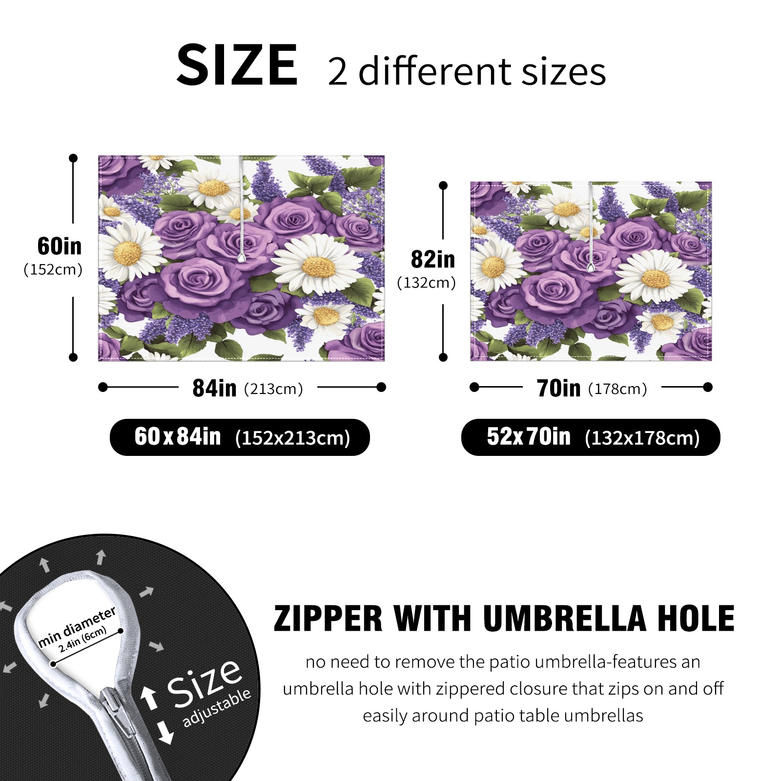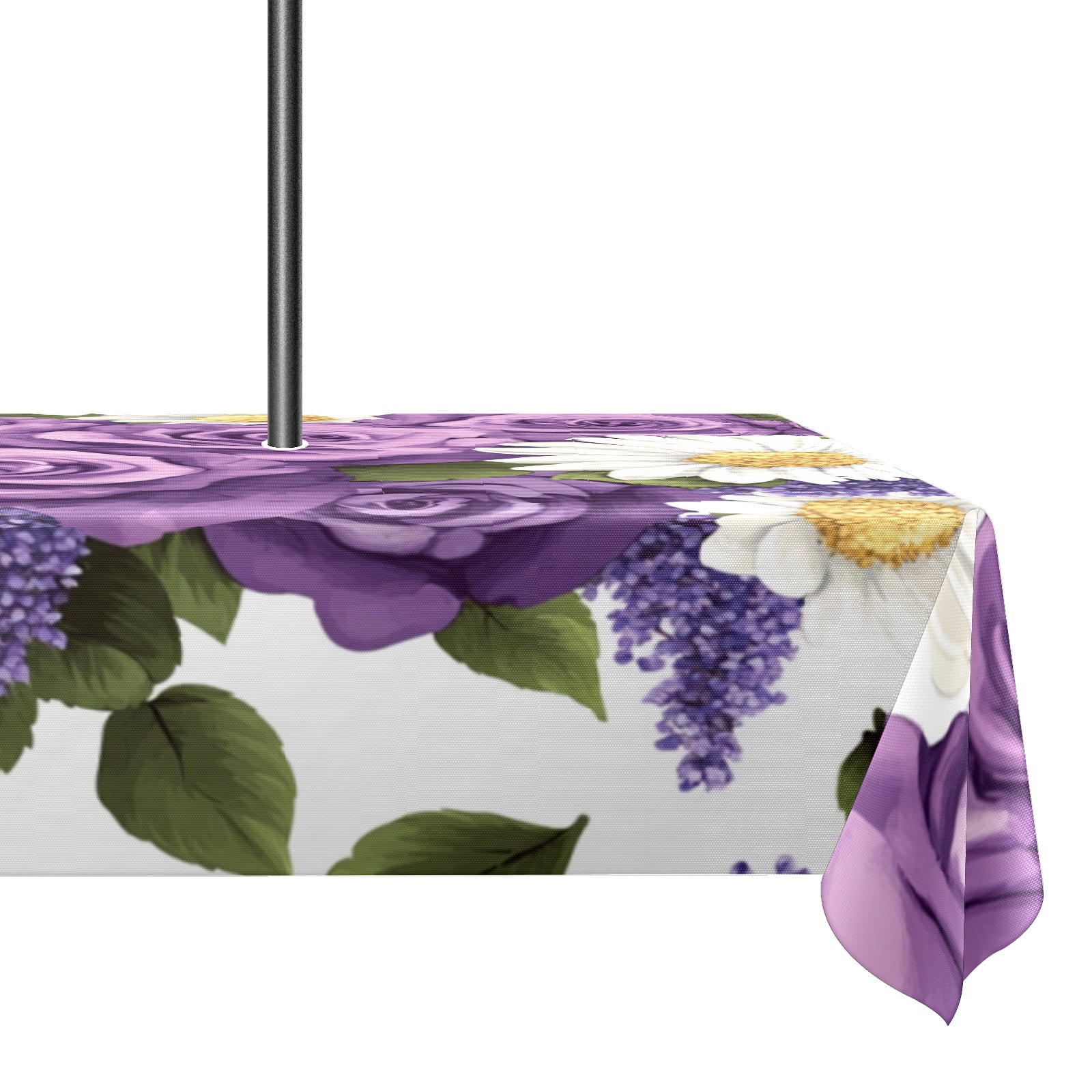 Waterproof Umbrella Hole Tablecloth Square, 52x70 Inch Rectangle Polyester Table Cover Zippered Design for Outdoor/Indoor Use Purple Rose & Daisy Pattern