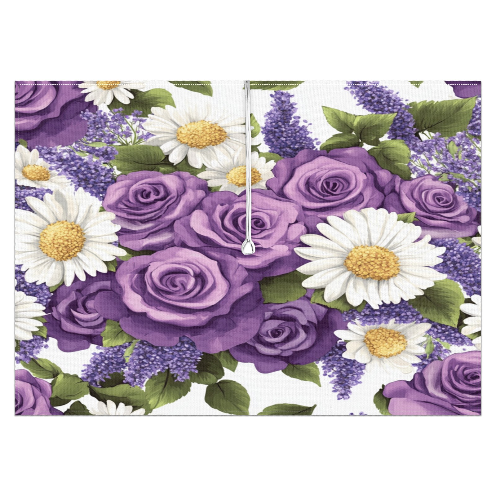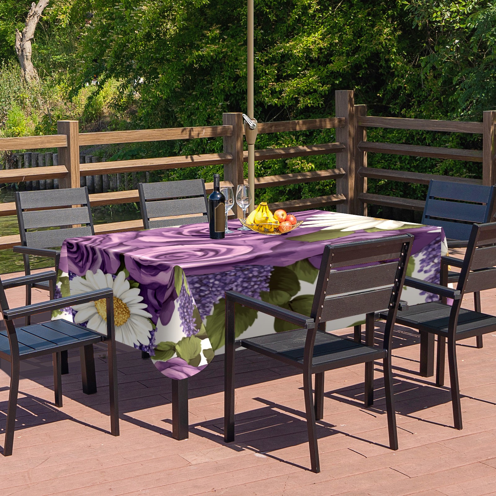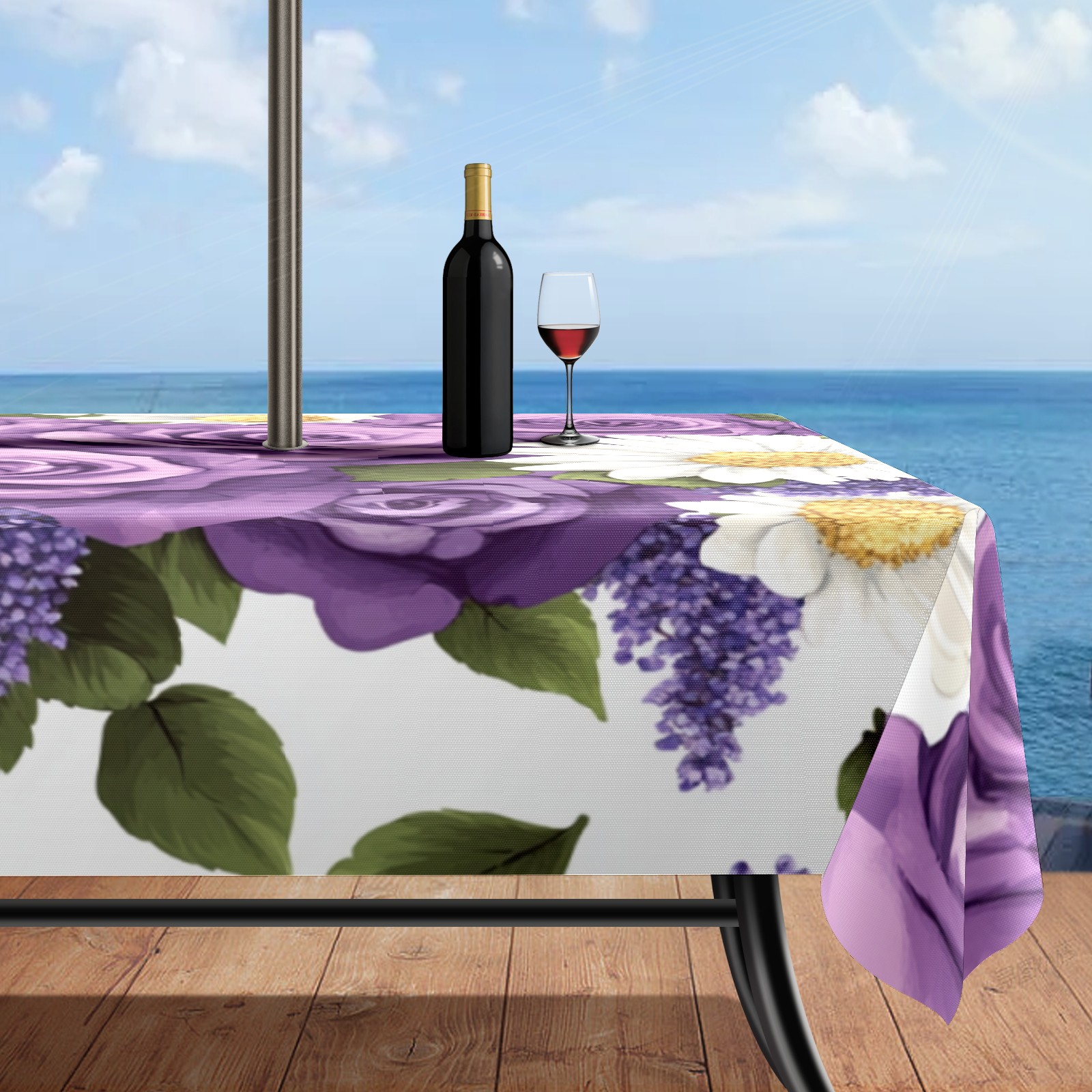 Waterproof Umbrella Hole Tablecloth Square, 52x70 Inch Rectangle Polyester Table Cover Zippered Design for Outdoor/Indoor Use Purple Rose & Daisy Pattern