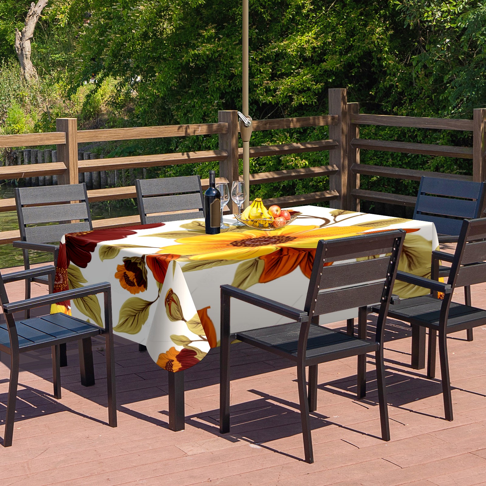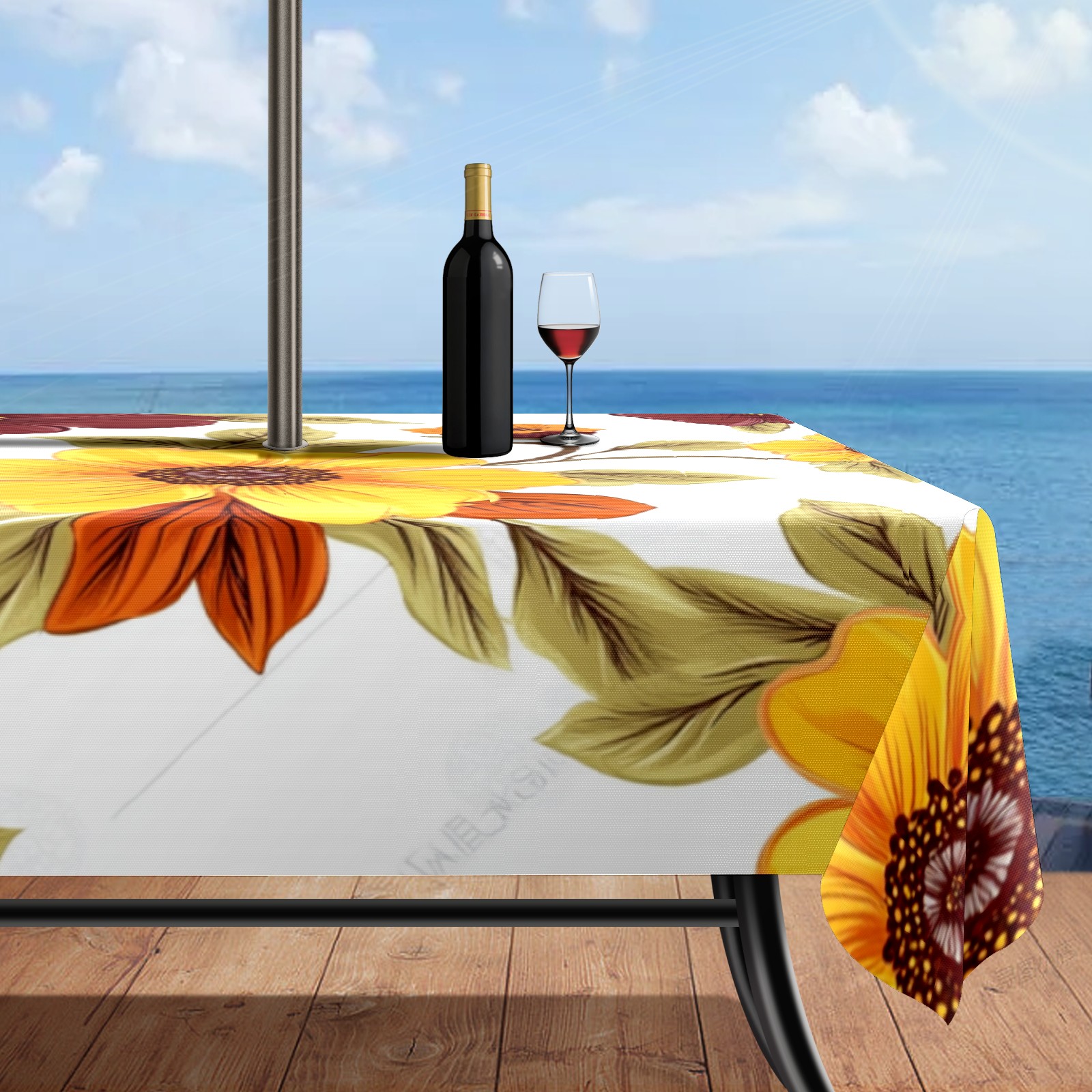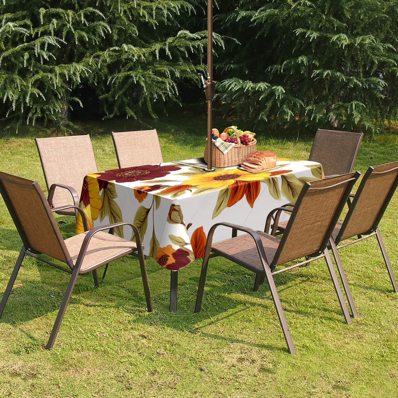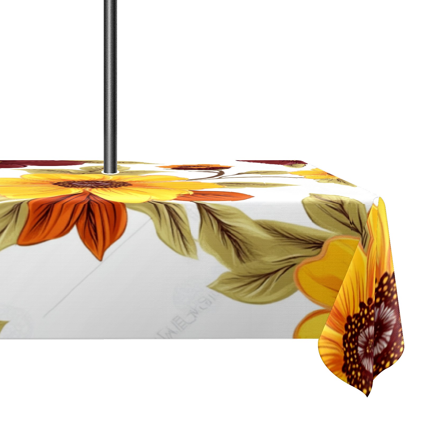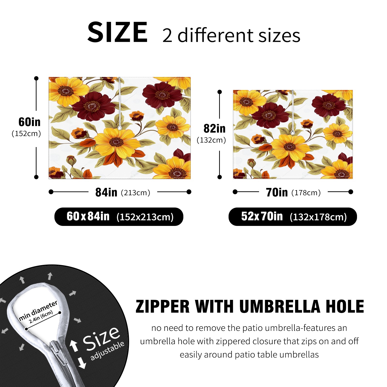 <p>This premium polyester tablecloth features an innovative umbrella-hole zipper design for easy installation without disassembling a parasol, and offers 2.4-inch adjustable umbrella hole size. Available in 52x70 inch and 60x84 inch sizes, it perfectly fits various dining tables. Its waterproof and stain-resistant properties effectively protect against spills of coffee, juice, rain, and other liquids, keeping your table looking brand new. Daily maintenance is simple; stains wipe away easily. It is machine washable on a gentle cycle; wash in cold water and do not bleach.<br></p>