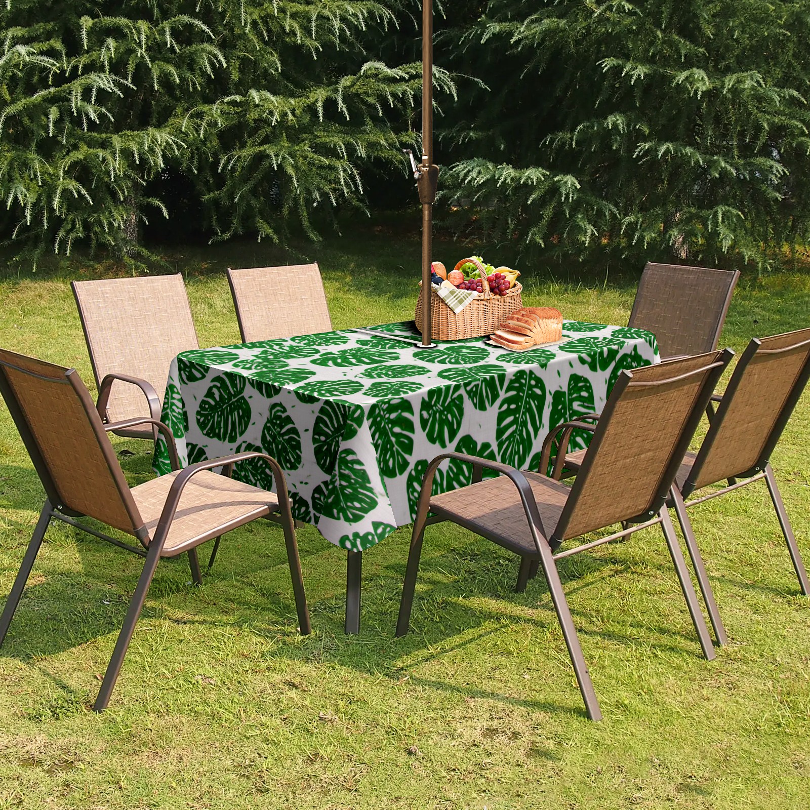 Waterproof Umbrella Hole Tablecloth Square, 52x70 Inch Rectangle Polyester Table Cover Zippered Design for Outdoor/Indoor Use Green Leaves White