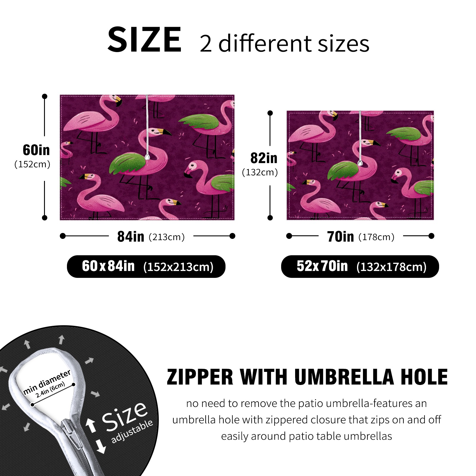 <p>This premium polyester tablecloth features an innovative umbrella-hole zipper design for easy installation without disassembling a parasol, and offers 2.4-inch adjustable umbrella hole size. Available in 52x70 inch and 60x84 inch sizes, it perfectly fits various dining tables. Its waterproof and stain-resistant properties effectively protect against spills of coffee, juice, rain, and other liquids, keeping your table looking brand new. Daily maintenance is simple; stains wipe away easily. It is machine washable on a gentle cycle; wash in cold water and do not bleach.<br></p>