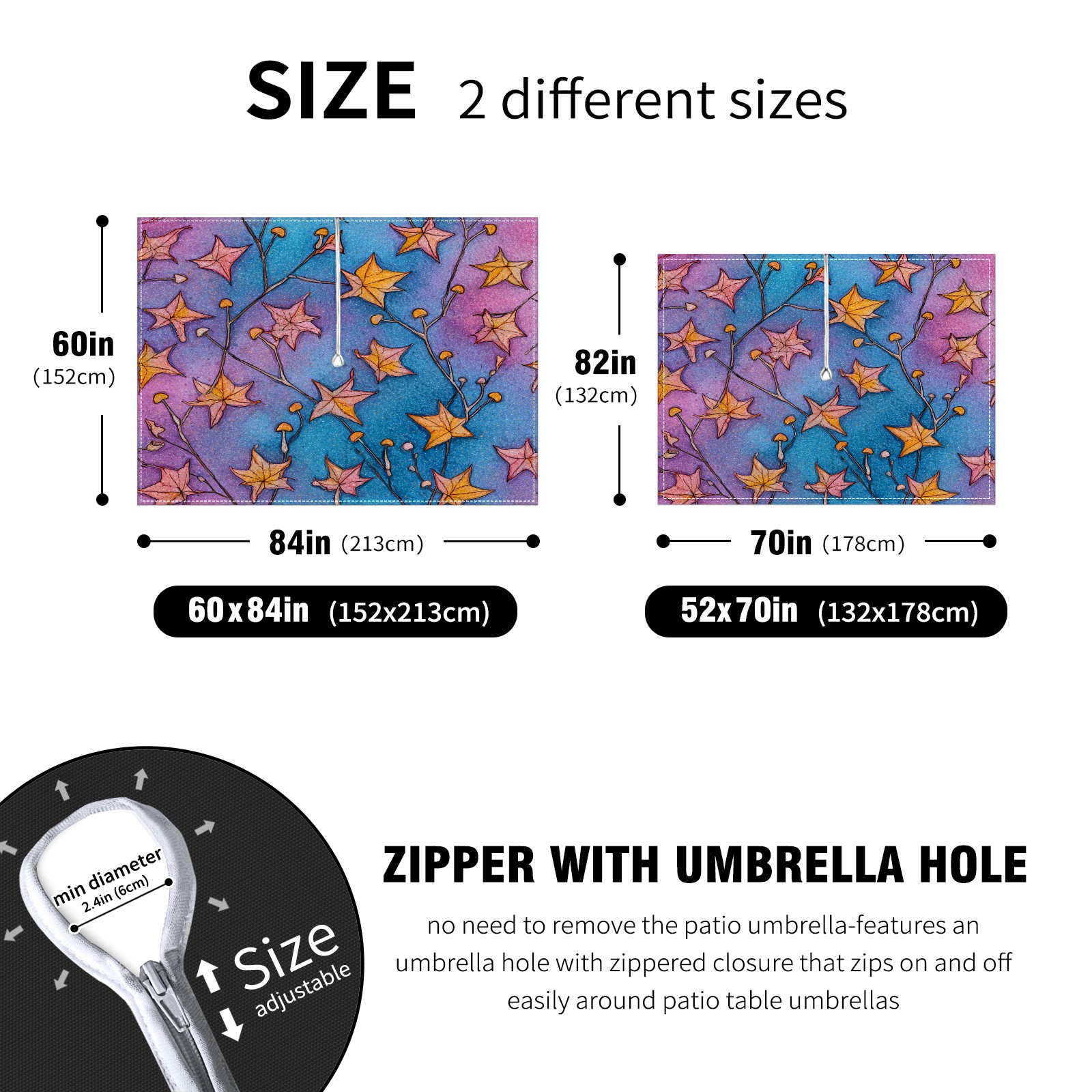 • <p>This premium polyester tablecloth features an innovative umbrella-hole zipper design for easy installation without disassembling a parasol, and offers 2.4-inch adjustable umbrella hole size. Available in 52x70 inch and 60x84 inch sizes, it perfectly fits various dining tables. Its waterproof and stain-resistant properties effectively protect against spills of coffee, juice, rain, and other liquids, keeping your table looking brand new. Daily maintenance is simple; stains wipe away easily. It is machine washable on a gentle cycle; wash in cold water and do not bleach.<br></p>