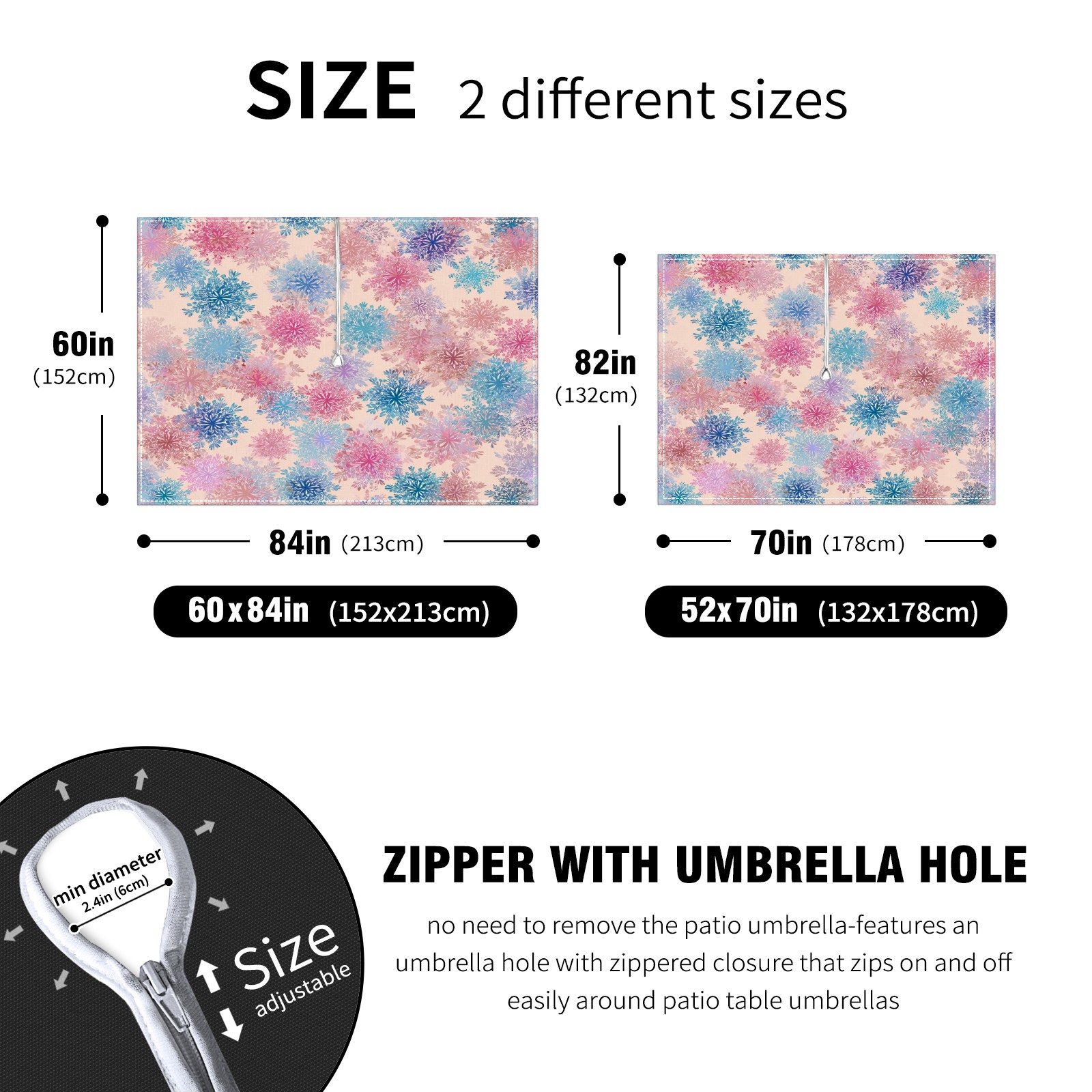 • <p>This premium polyester tablecloth features an innovative umbrella-hole zipper design for easy installation without disassembling a parasol, and offers 2.4-inch adjustable umbrella hole size. Available in 52x70 inch and 60x84 inch sizes, it perfectly fits various dining tables. Its waterproof and stain-resistant properties effectively protect against spills of coffee, juice, rain, and other liquids, keeping your table looking brand new. Daily maintenance is simple; stains wipe away easily. It is machine washable on a gentle cycle; wash in cold water and do not bleach.<br></p>