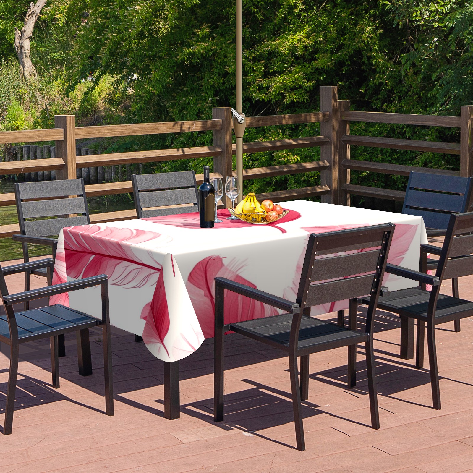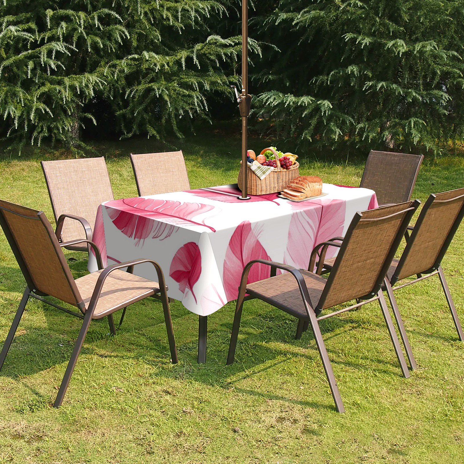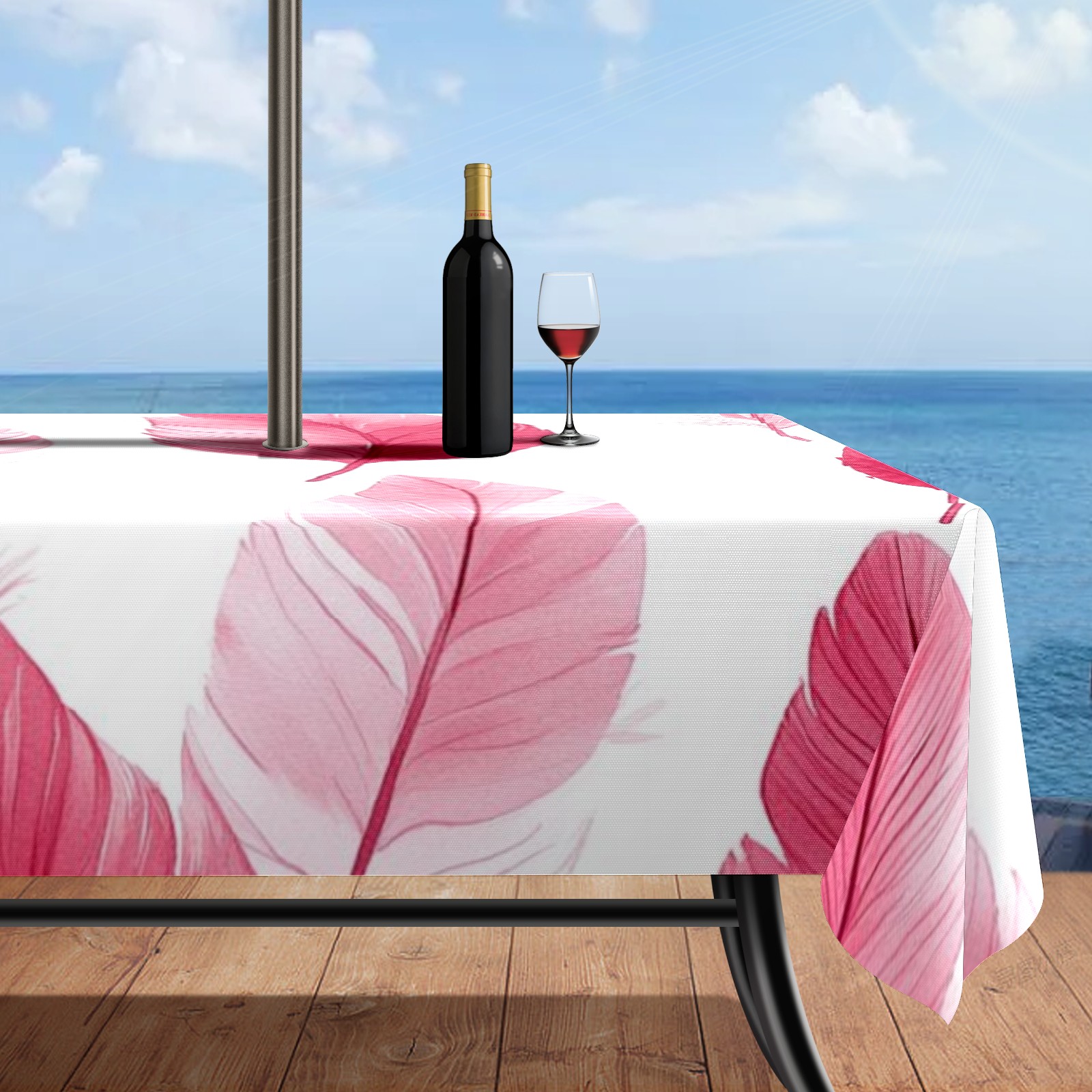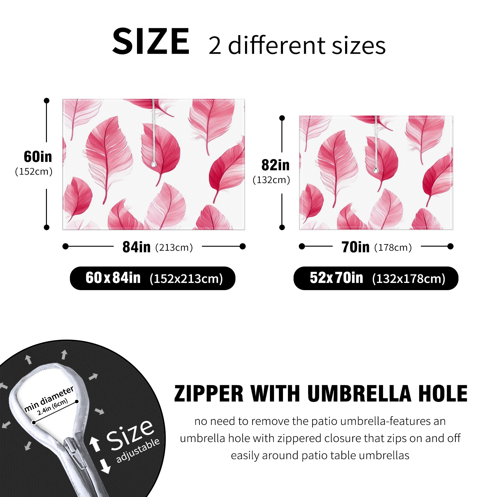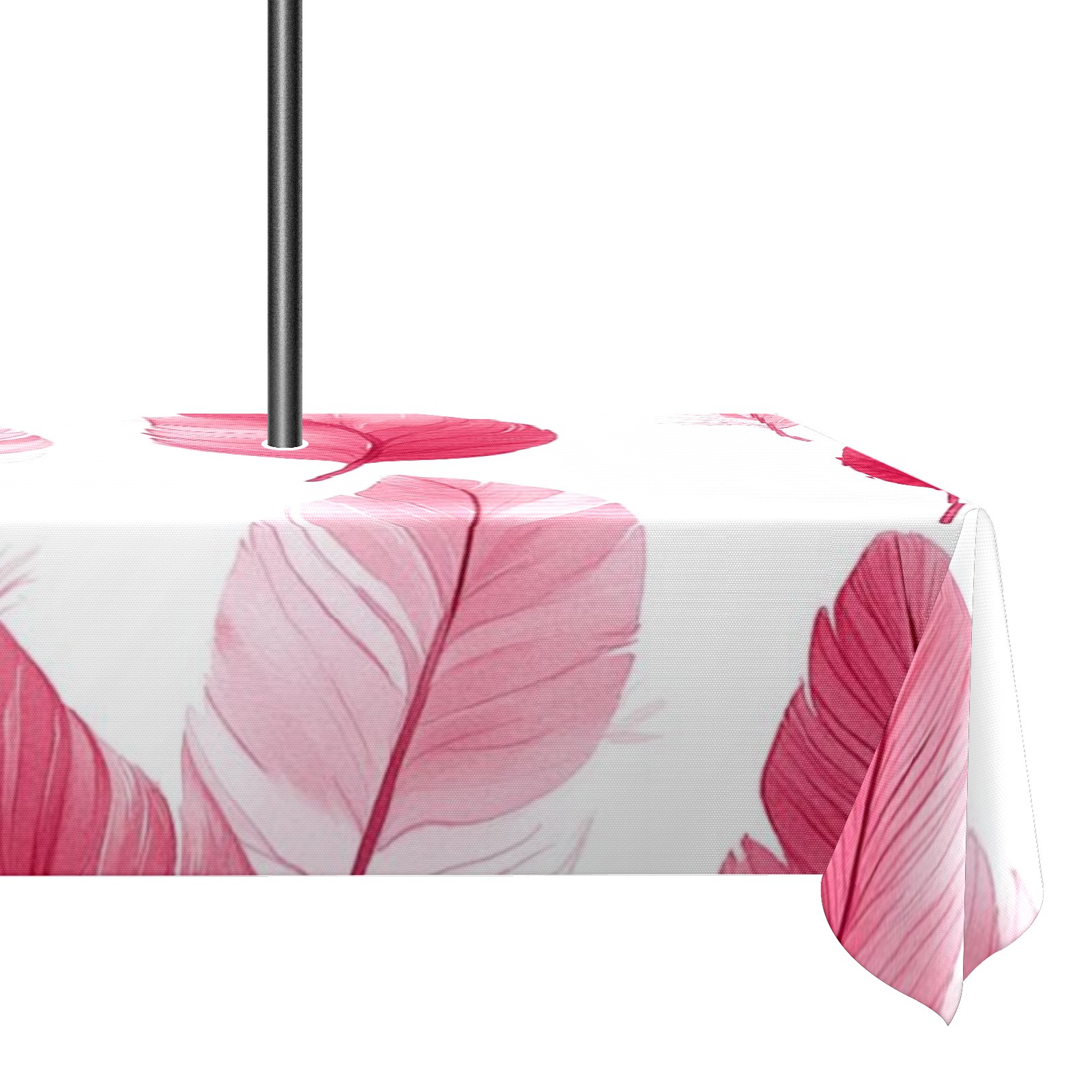 Waterproof Umbrella Hole Tablecloth Square, 52x70 Inch Rectangle Polyester Table Cover Zippered Design for Outdoor/Indoor Use Pink Feathers