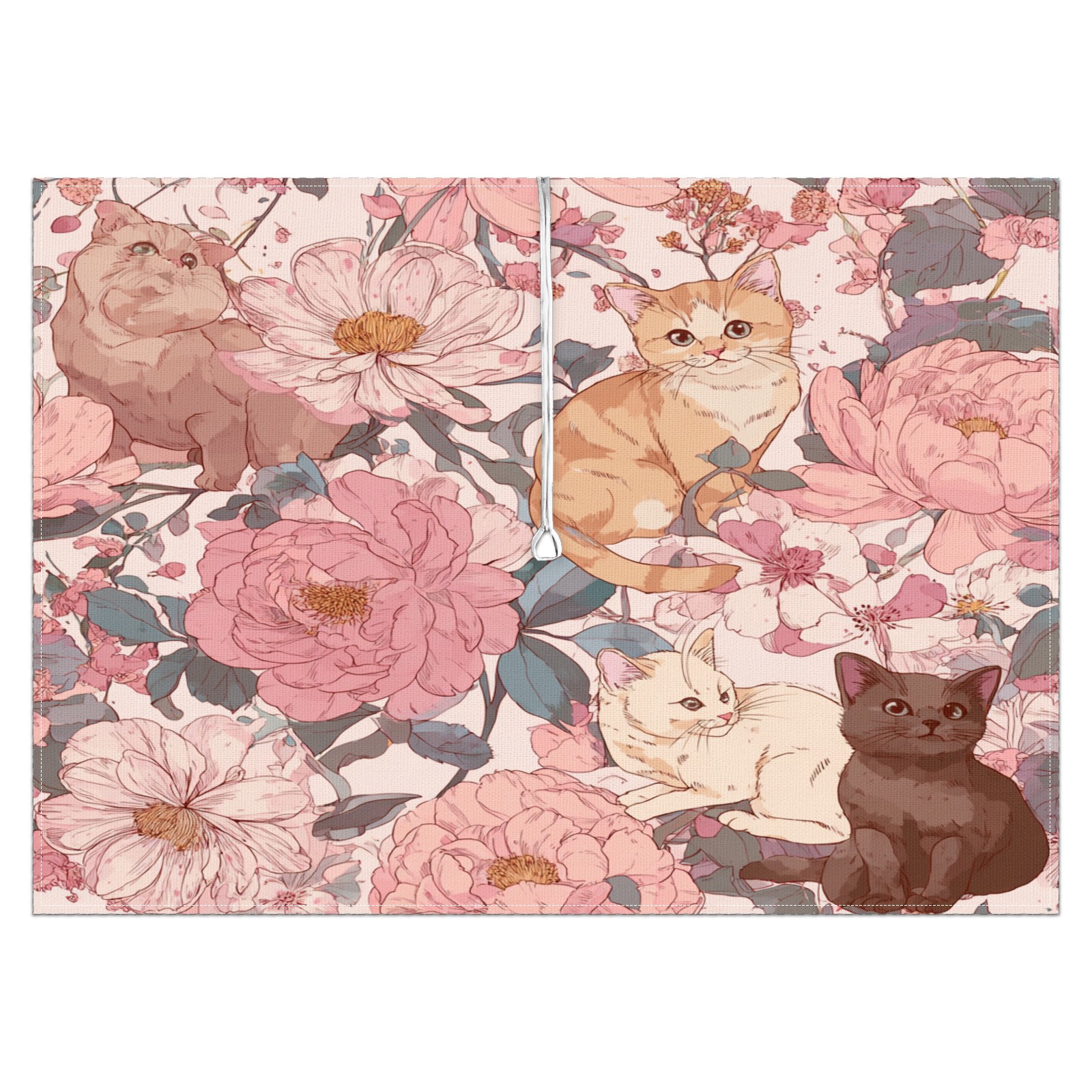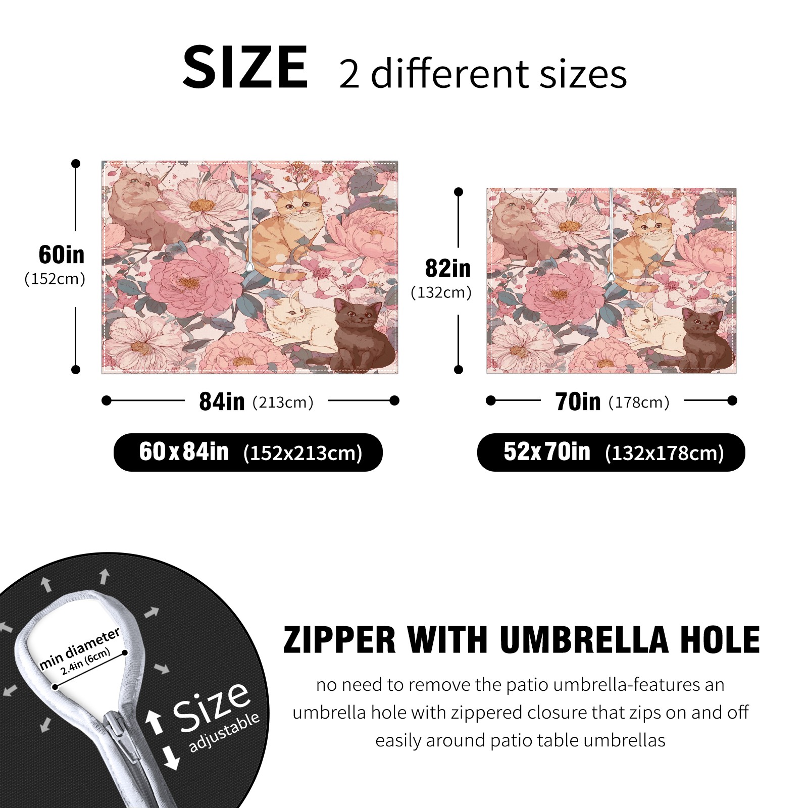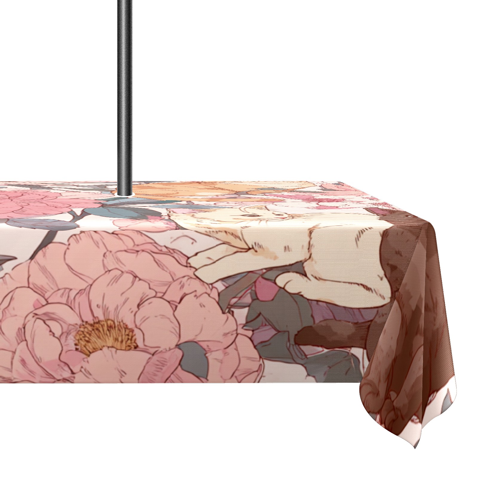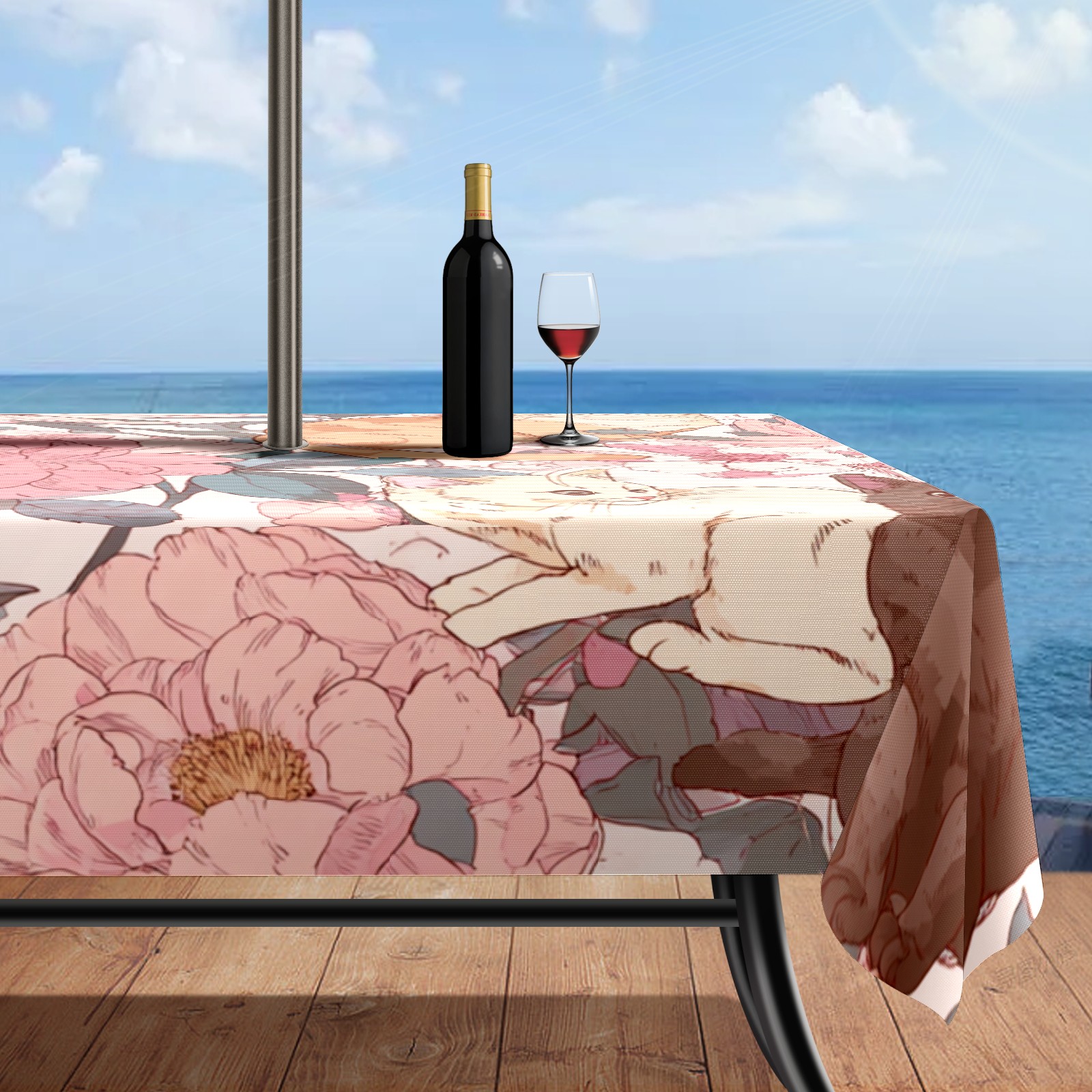 Waterproof Umbrella Hole Tablecloth Square, 52x70 Inch Rectangle Polyester Table Cover Zippered Design for Outdoor/Indoor Use Cat Floral Pink