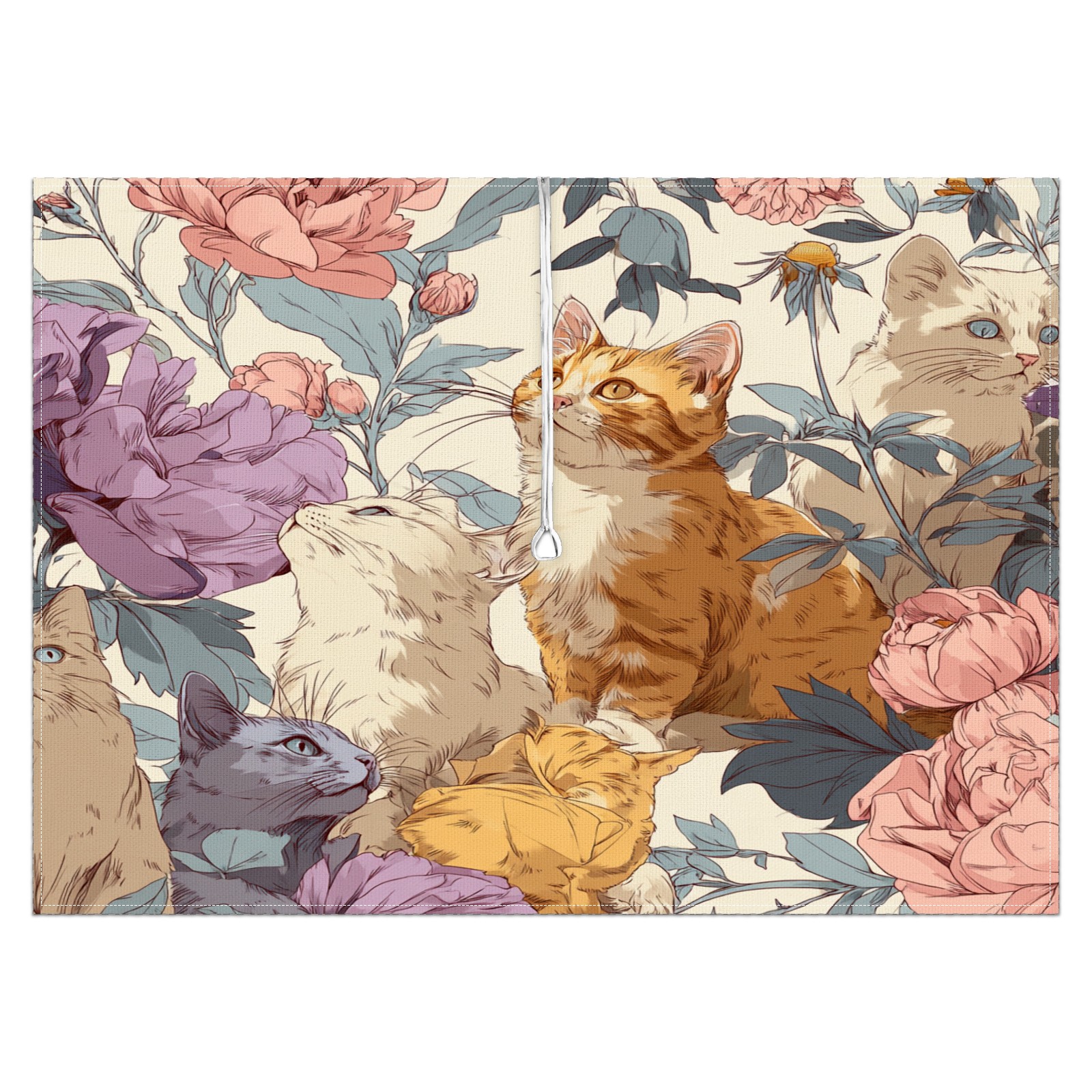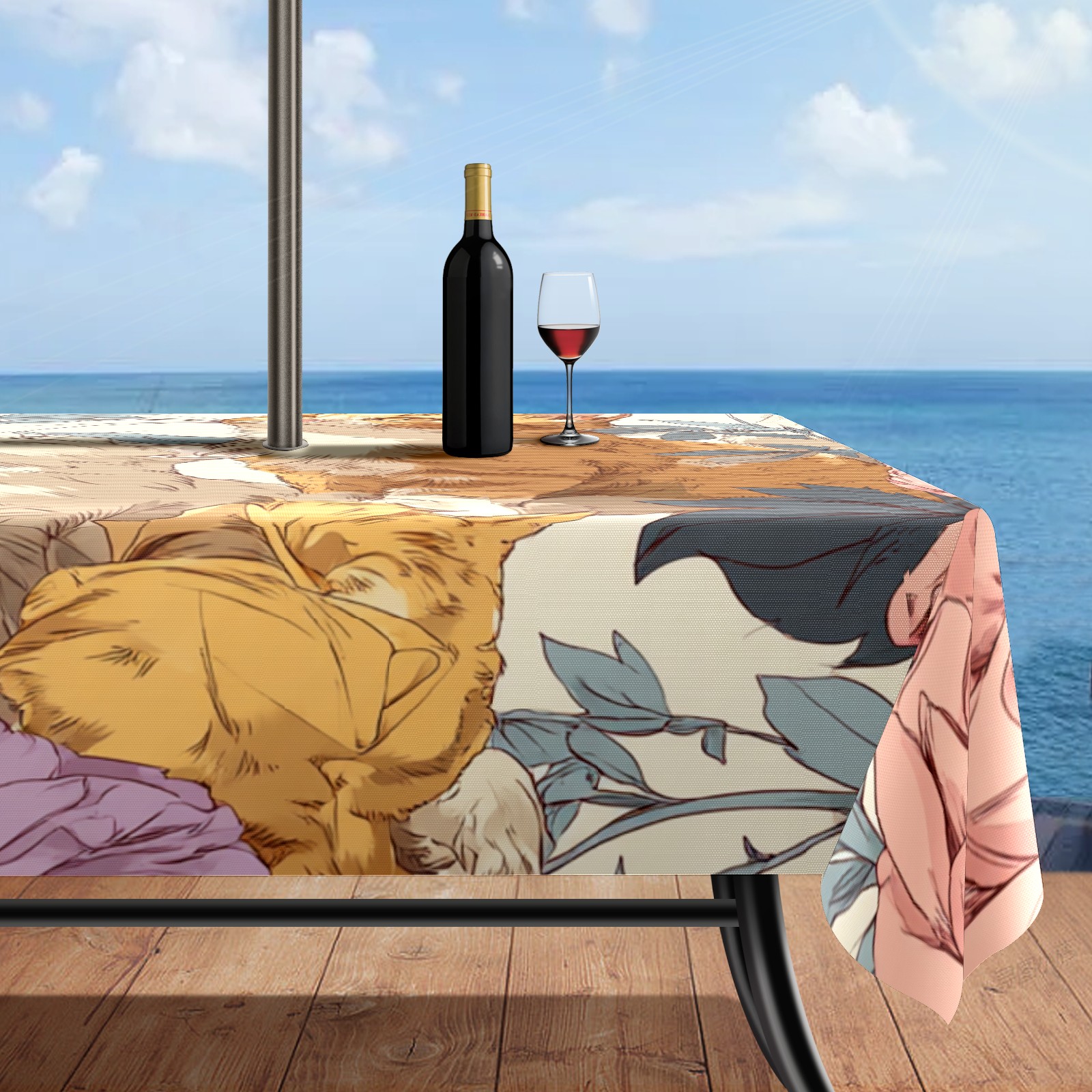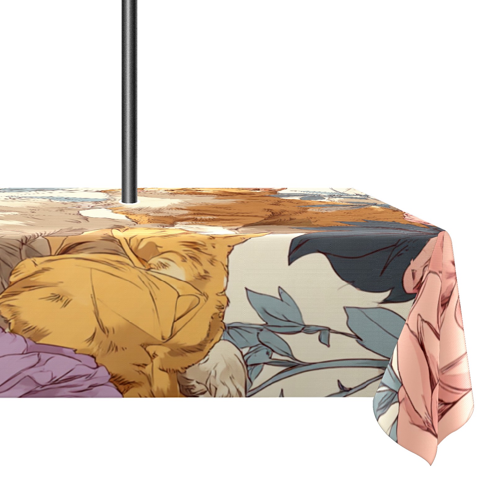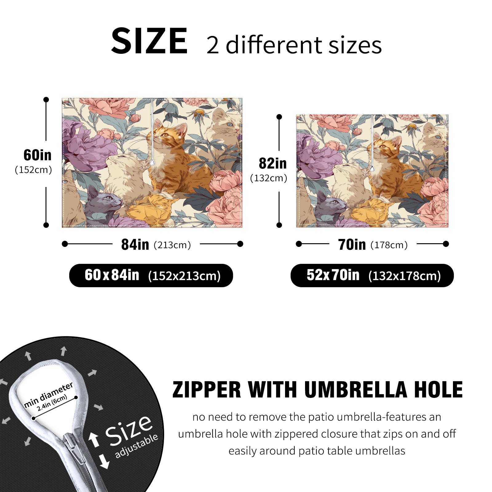 Waterproof Umbrella Hole Tablecloth Square, 52x70 Inch Rectangle Polyester Table Cover Zippered Design for Outdoor/Indoor Use Cat Floral Orange