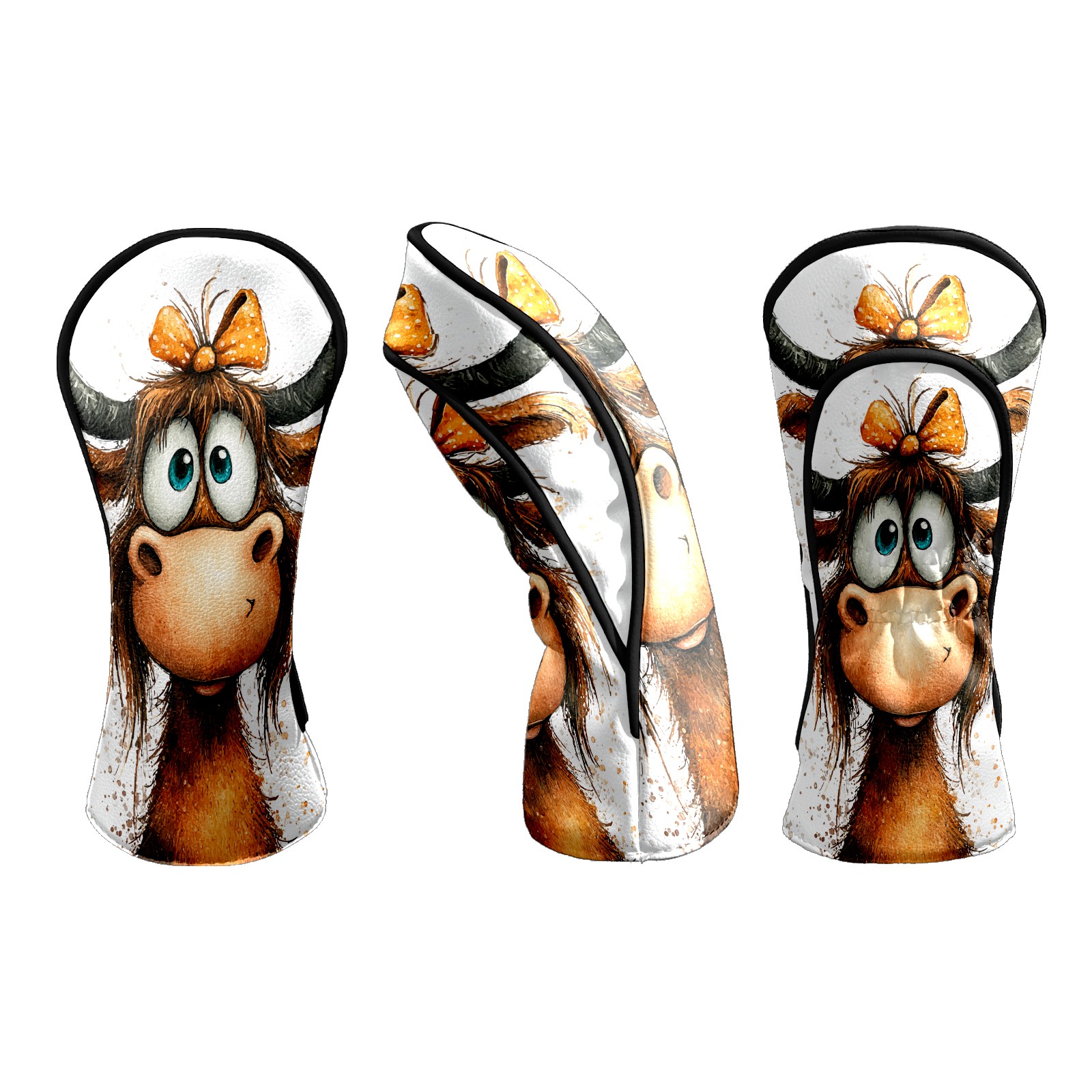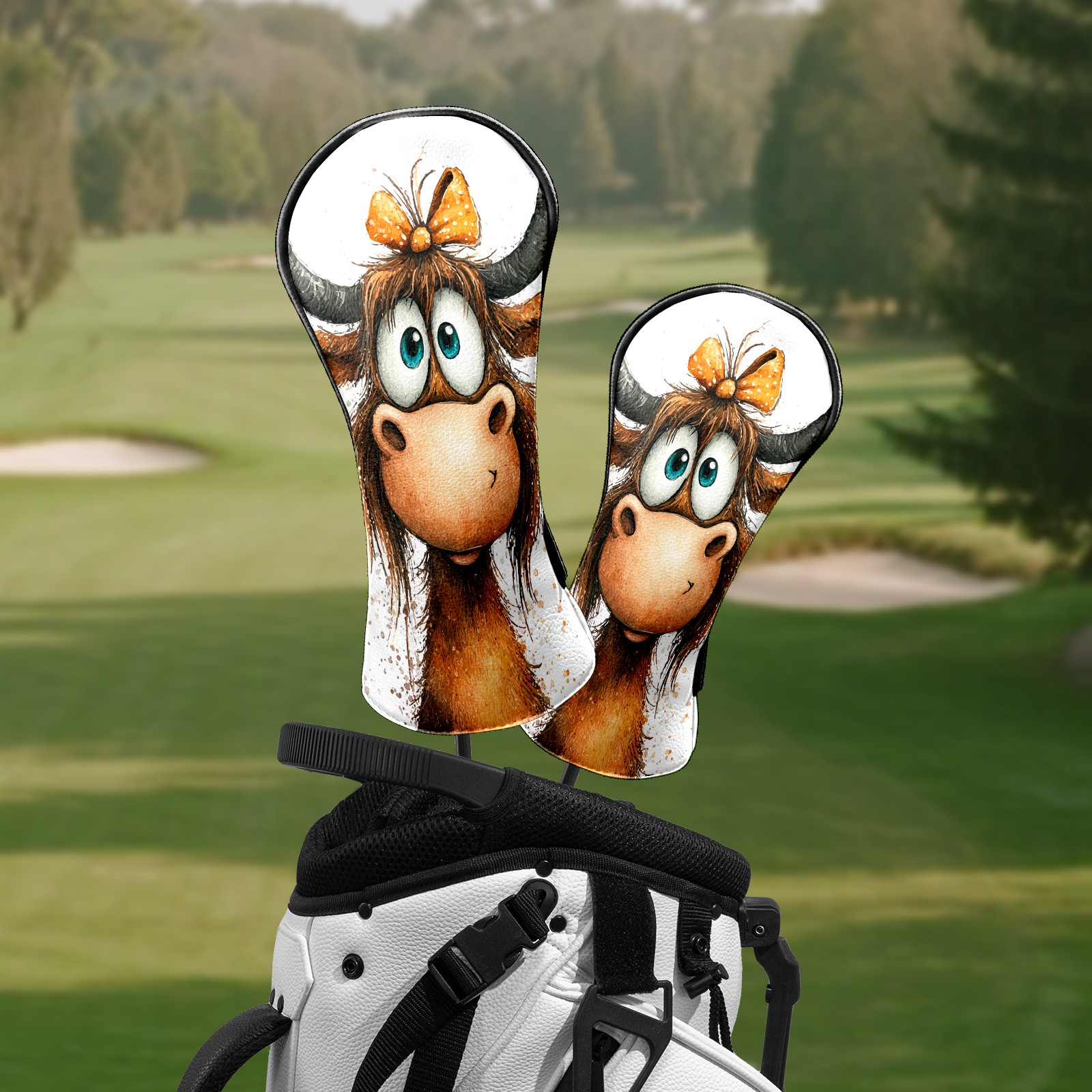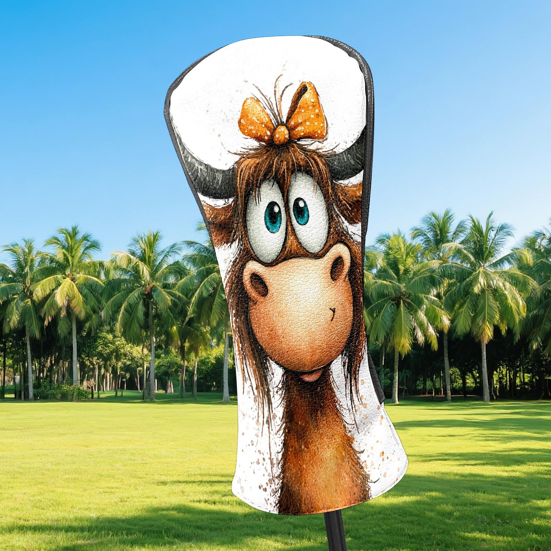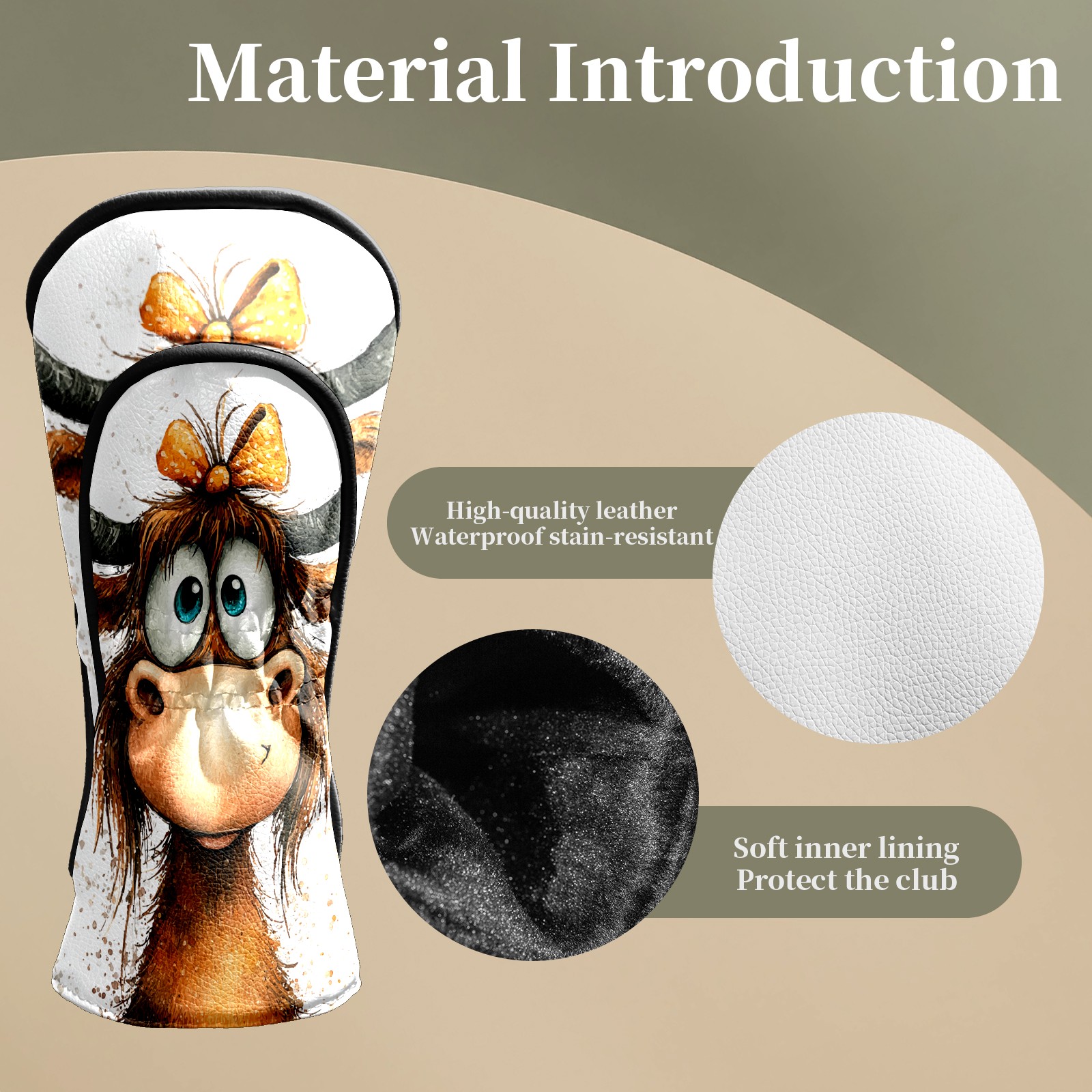 Golf Club Head Covers - Cartoon Cow Brown Driver Fairway Headcover, Premium PU Leather, Protective Velvet Lining, Secure Elastic Band, Fits All Golf Brands, Perfect Gift for Golfers Men Women