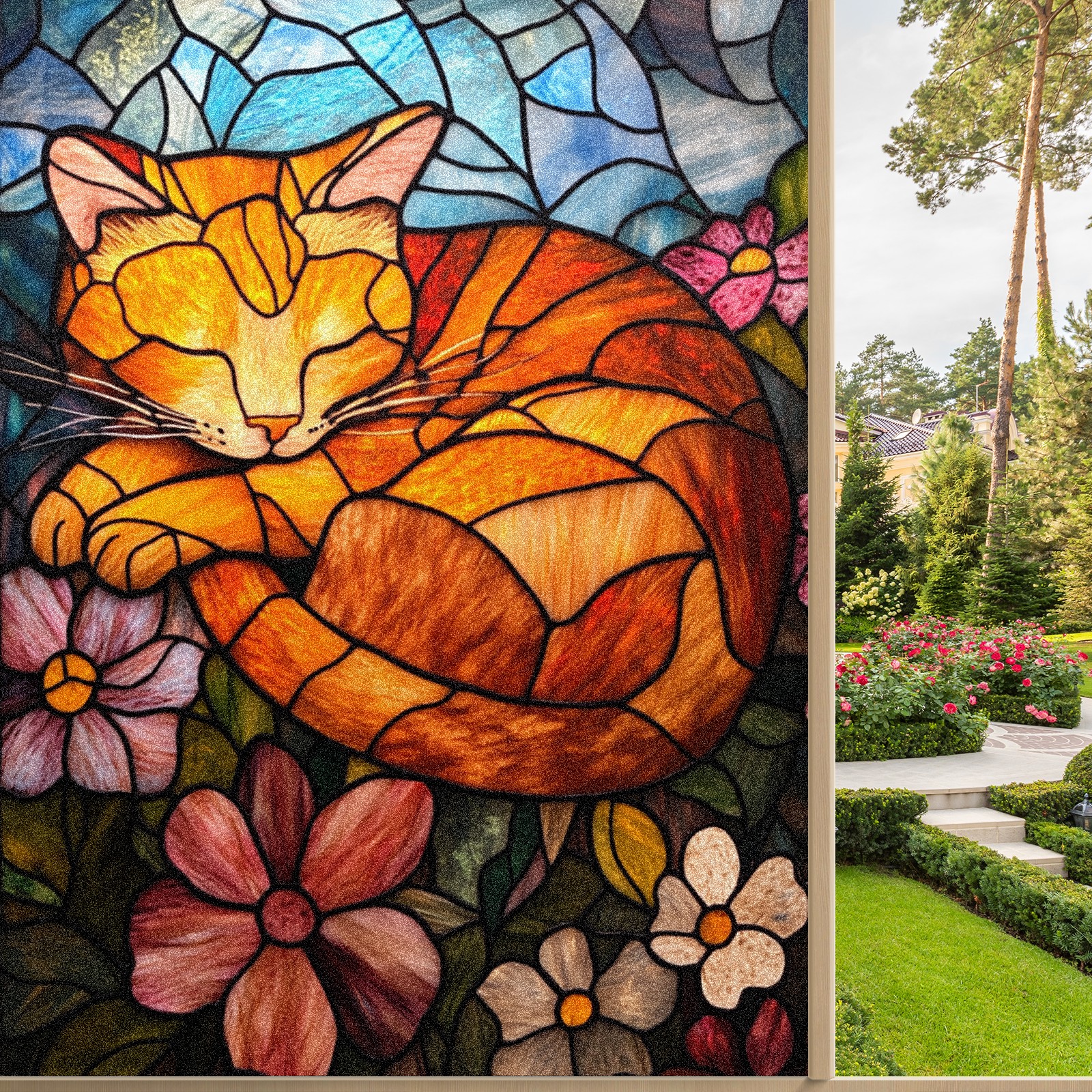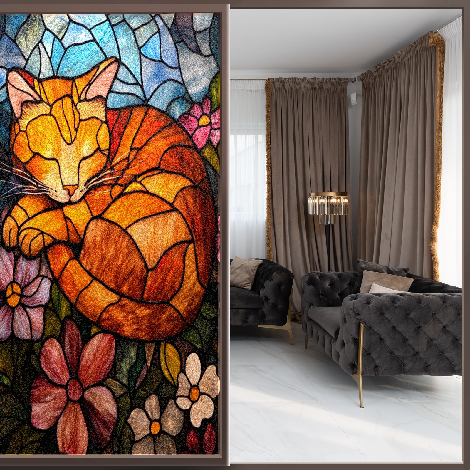 Scrub Glass Films Privacy Window Film Frosted Stained Film Decorative Static Cling for Home Office Bathroom Stained Window Sleeping Cat Flowers 1
