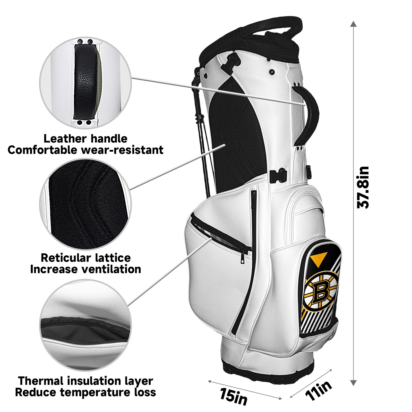 • <p>The Golf Stand Bag, designed specifically for golf enthusiasts, offers a choice of 5 - way and 14 - way top dividers. Its 5/14 - compartment design with independent full - size club compartments safeguards clubs from collisions. Equipped with a rain cover, waterproof zippered pockets (tested to resist moderate to heavy rain), and a high - performance cooler pouch that can keep drinks cold for hours, it ensures a convenient golfing experience. The bag features thickened, breathable neoprene shoulder straps and an adjustable chest buckle, reducing shoulder fatigue by 35% compared to regular bags, and its automatic aluminum alloy stand provides stable support on various terrains. Crafted from top - tier, water - resistant litchi - grain PU leather, with double - stitched edges, reliable zippers tested for over 15,000 cycles, and anti - abrasion bottom studs, it guarantees durability. You can personalize it with embroidery on the front pocket and rain cover side (15*15cm area), and it comes in classic black and white, with a matte finish and litchi - grain texture that combines business and leisure styles. Measuring 130 cm in height, 37 cm in width, and 31 cm in depth (including rain cover) and 90 cm x 31 cm x 37 cm (excluding rain cover), it strikes a balance between storage and portability, capable of holding 14 standard - sized clubs and other essentials, and it also includes a dust cover. It's truly the perfect choice for golfers.<br></p>